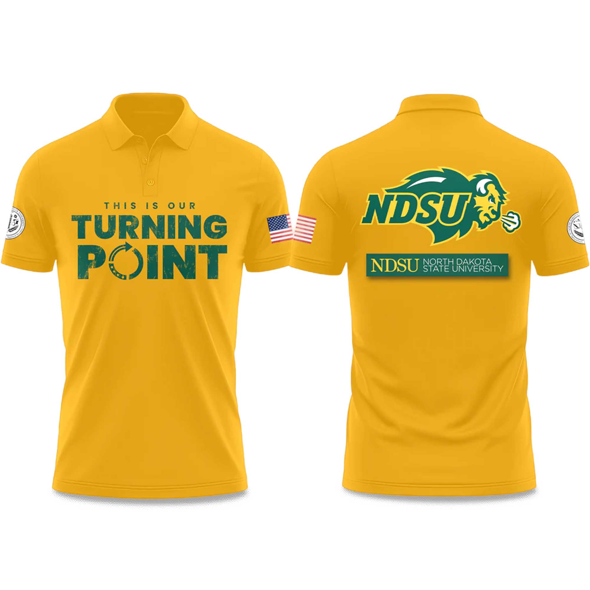North Dakota State University This Is Our Turning Point USA 2025 Polo Shirt conveys a bright, optimistic message for the year ahead. With a crisp white background and bold gold lettering, the shirt features the words “THIS IS OUR TURNING POINT” to create a sense of motivation and unity. It is designed for fans, students, and alumni who want to celebrate progress and team spirit in a friendly, upbeat way.