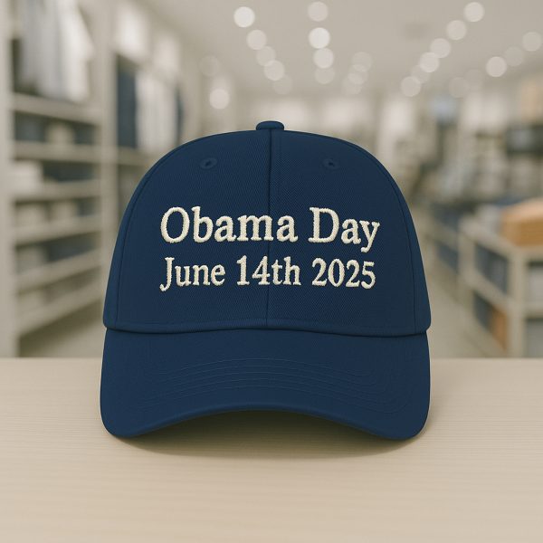 The Obama Day June 14th 2025 Baseball Cap features a dark black canvas, accented with elegant white embroidery that reads “Obama Day June 14, 2025” in a font that exudes power. The classic baseball cap shape offers timeless versatility, while the bold lettering conveys a sense of pride and modern sophistication, making it a standout piece.
