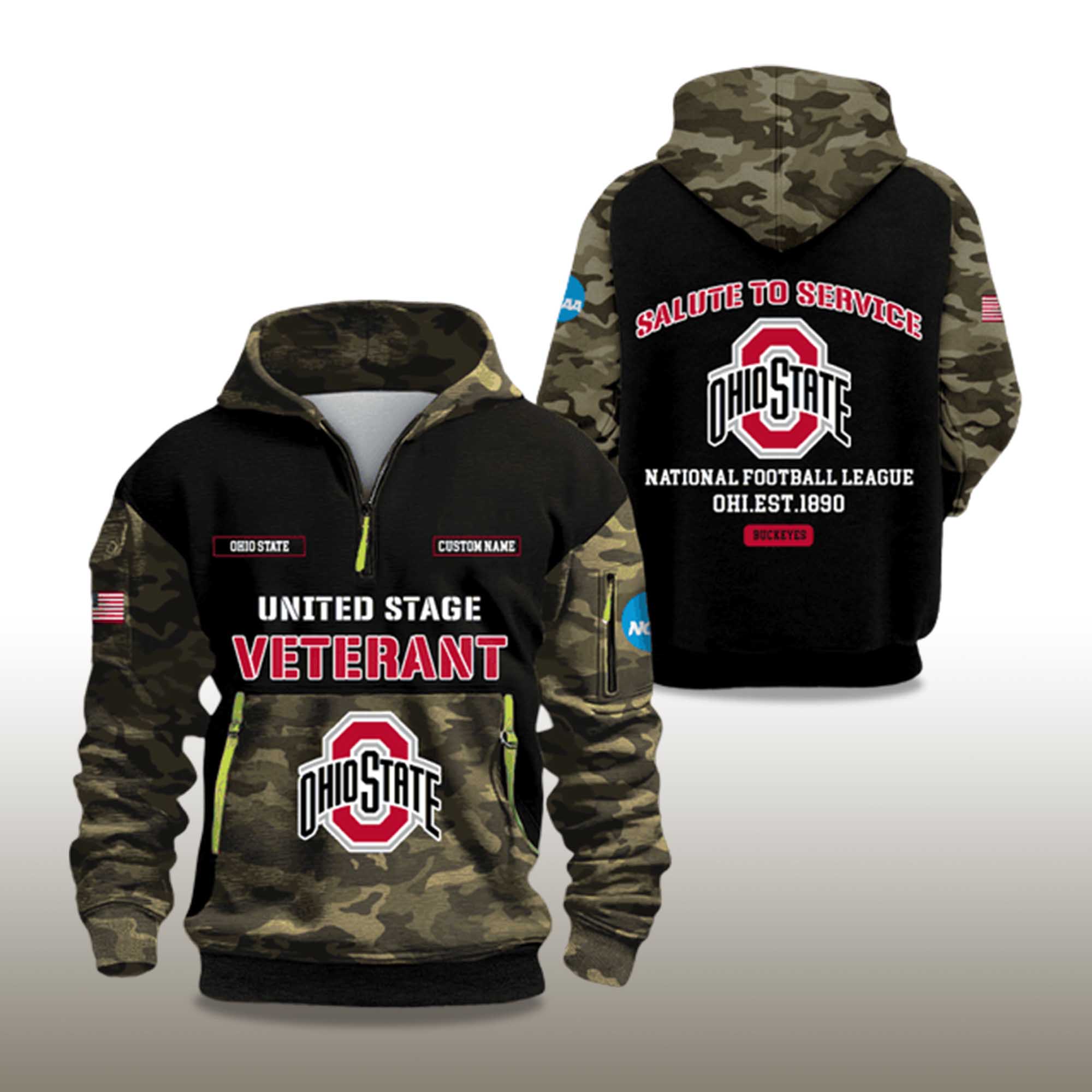 This hoodie features a classic camouflage base, contrasted with sleek black panels and Ohio State University’s signature red and white accents. The front reads “UNITED STAGE VETERANT” and the Buckeyes logo, while the back boasts “SALUTE TO SERVICE” above the team crest and historic founding year. The quarter zip collar offers a modern and functional look.