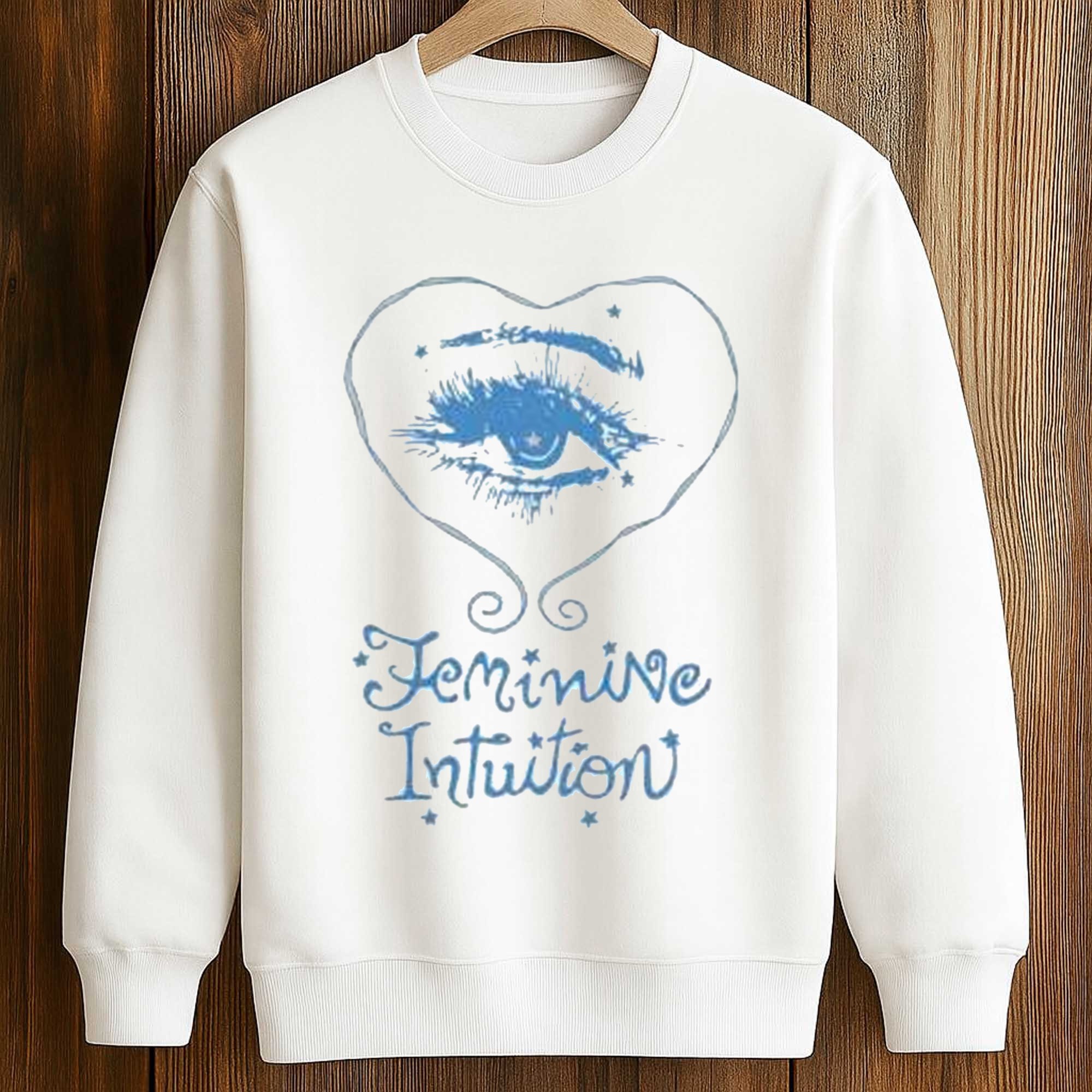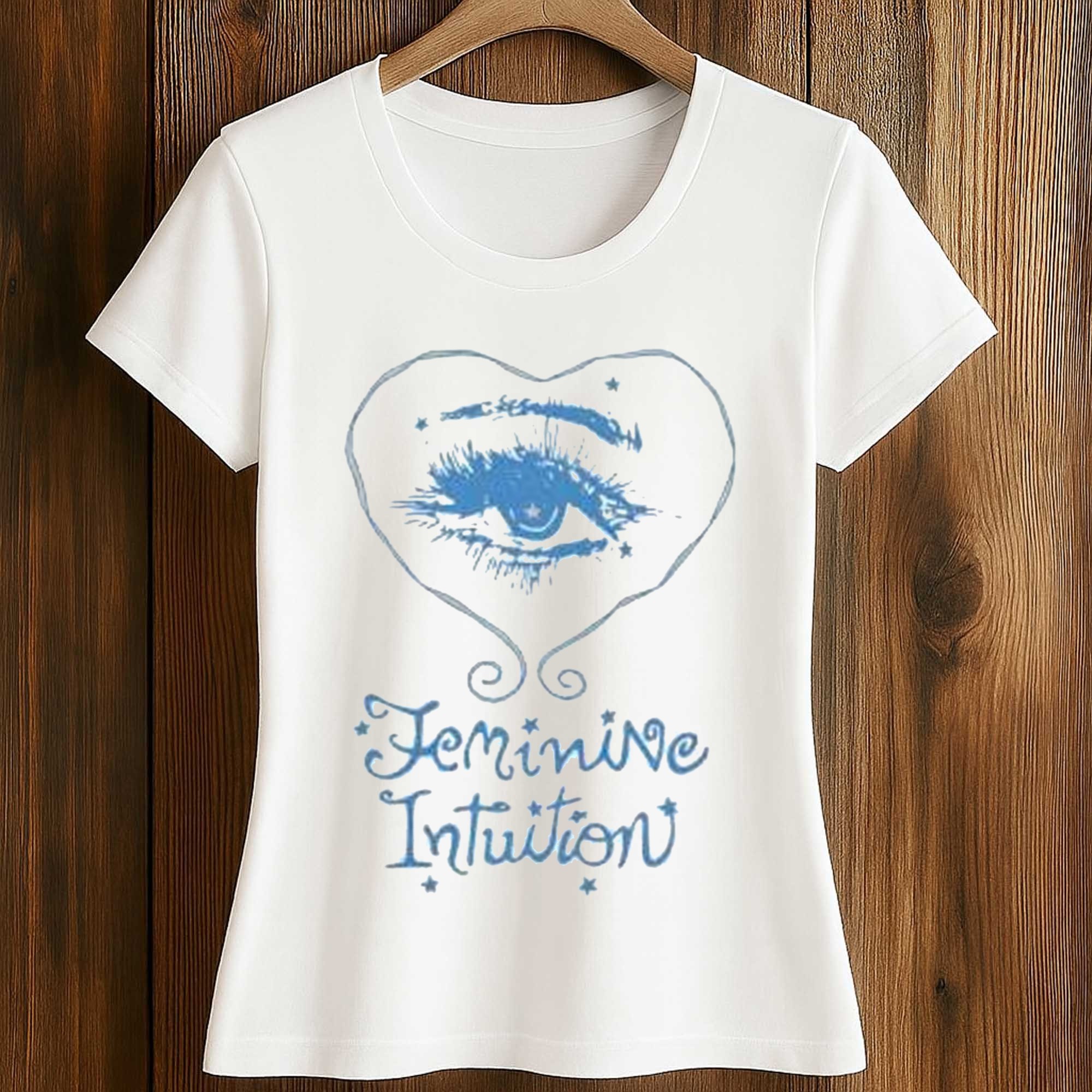 The print features a hand-drawn eye inside a heart, combined with the words Feminine Intuition in a soft, artistic font. The light blue tone creates a gentle contrast with the background, subtly highlighting the design. Small decorative details add a dreamy feel, giving the shirt a creative touch without overwhelming the overall look.