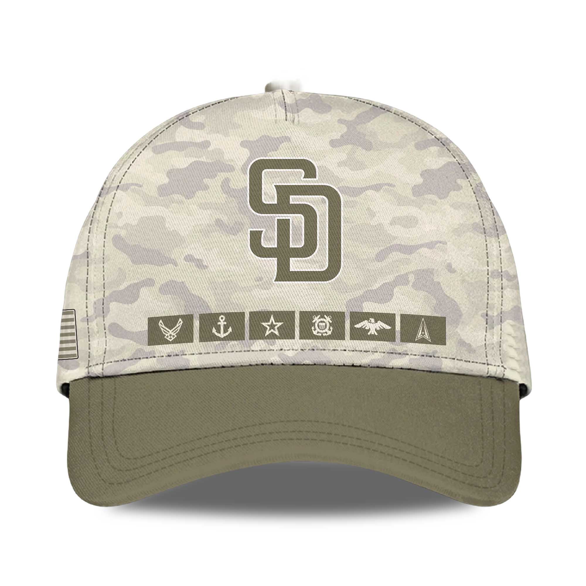 The jersey features a desert camouflage body paired with olive sleeves for a sharp, military-inspired look. The bold United States Padres lettering on the front creates a strong visual impact. American flag patches on the sleeves add a patriotic touch, while the back displays a large SD logo above the This We’ll Defend lettering. Action silhouettes of soldiers at the bottom complete the tribute theme. The overall design balances respect, strength, and Padres pride in an eye-catching jersey.