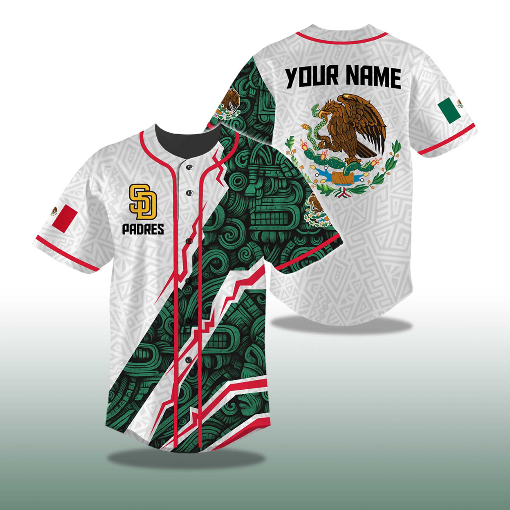 This jersey features a crisp white body, adorned with a bold Aztec-inspired green graphic on the front. Red accents run along the collar, sleeves, and seams, creating a powerful graphic inspired by the Mexican flag. The Padres logo sits on the chest, while the back features the Mexico coat of arms with space for a custom name. The lightweight, breathable fabric allows you to move freely while still expressing your unique style.