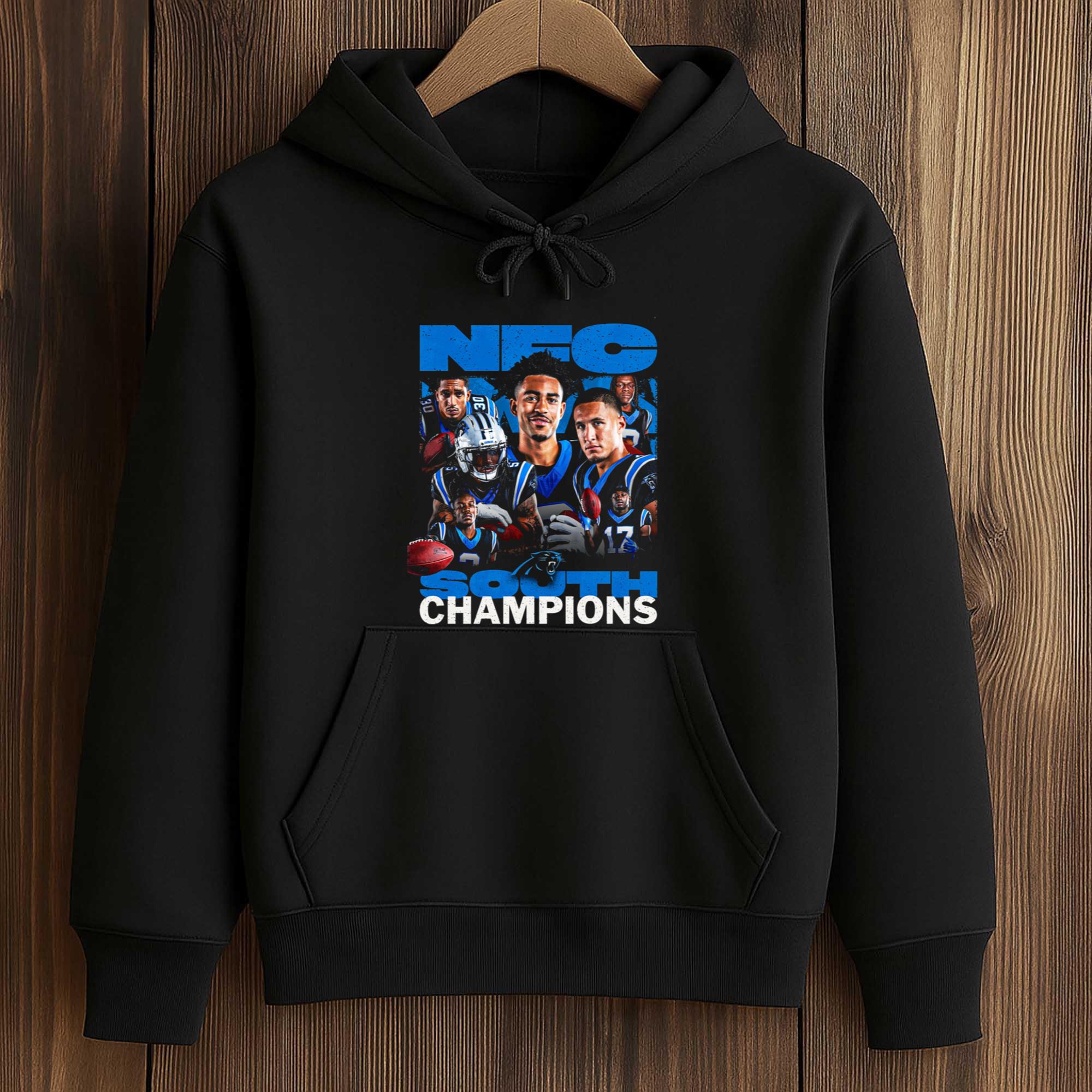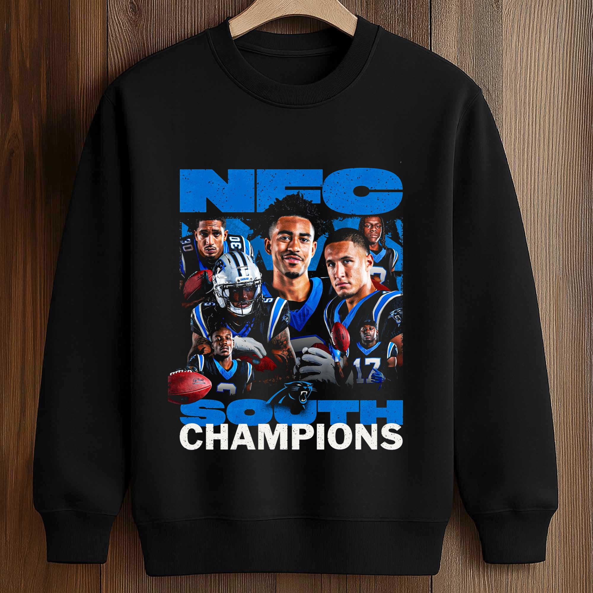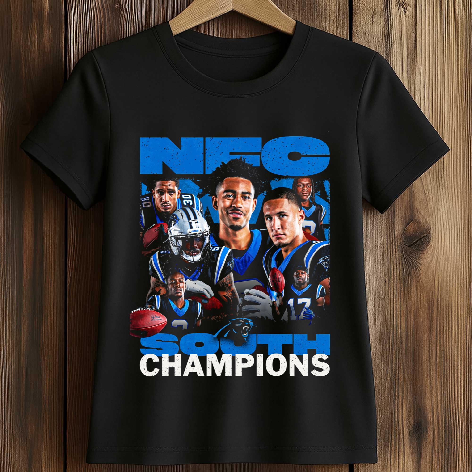 The Panthers NFC South Champions 2025 2026 Shirt features a collage of prominent players with the words “NFC South Champions” in bold. The striking blue accents stand out against the dark background, creating instant recognition and strong contrast. The central layout keeps the design balanced and easy to read, while the overall feel remains comfortable enough for everyday wear. It’s a simple way to mark a winning season without overwhelming the outfit.