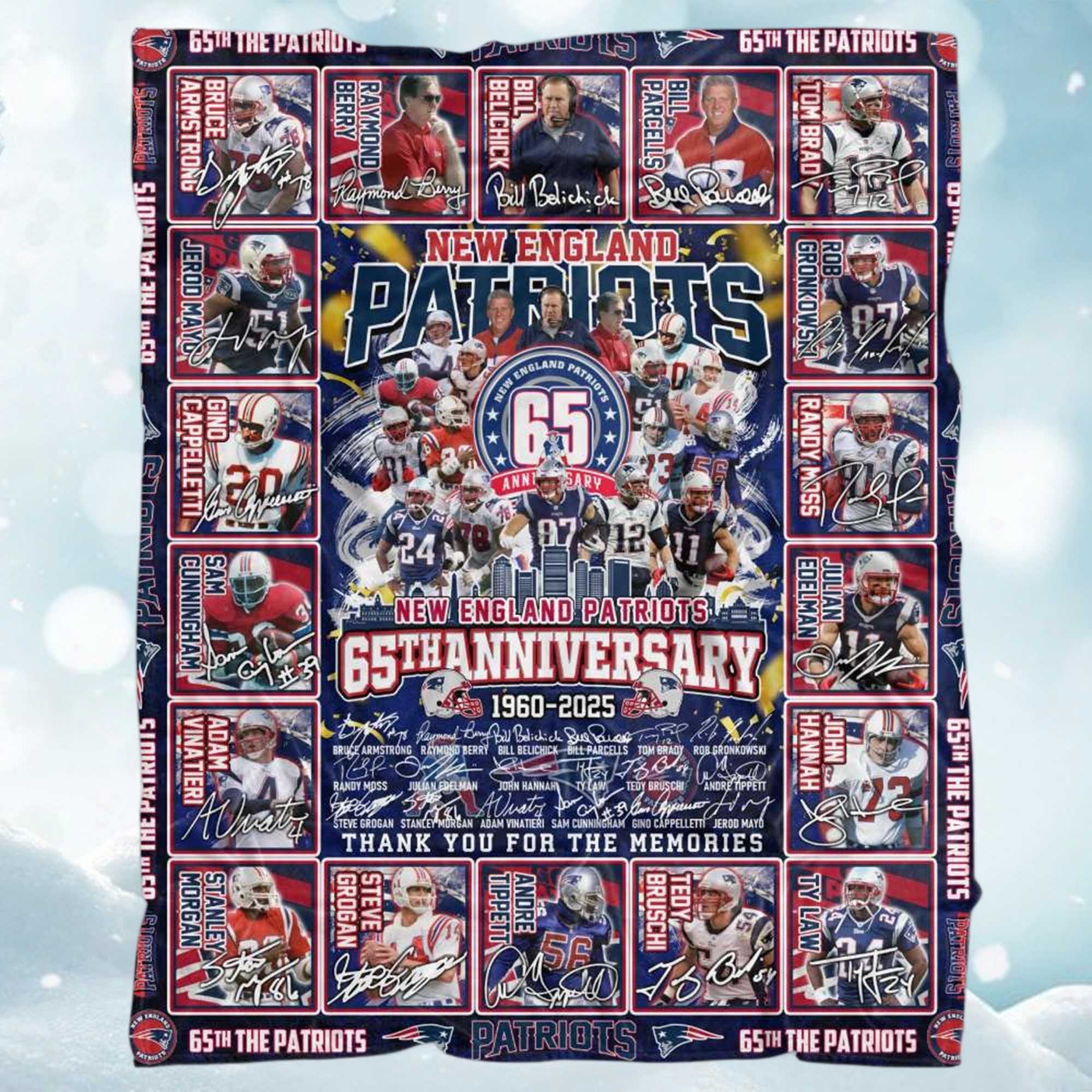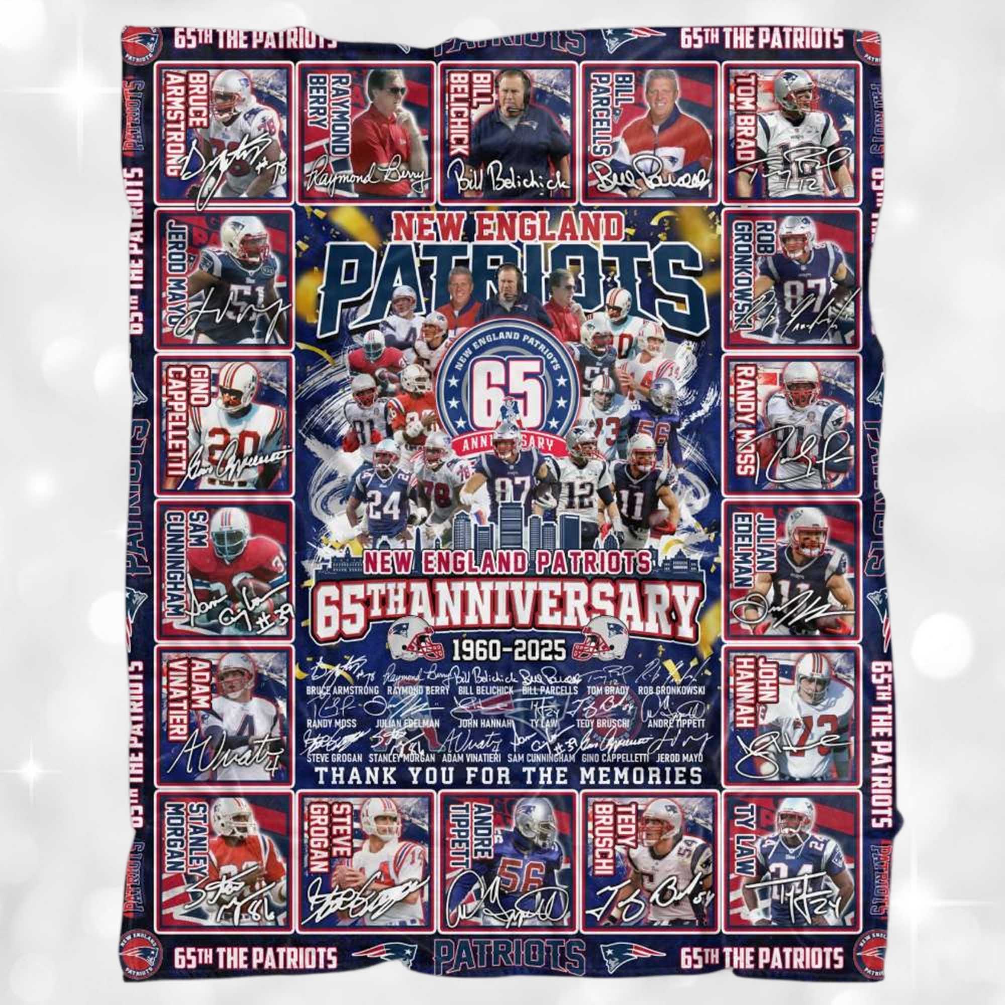 The Patriots 65th Anniversary 1960-2025 Fleece Blanket evokes decades of football memories with vibrant colors, player images, and a nostalgic design. It serves as a friendly reminder of all the games, cheers, and moments that have shaped Patriots history. Perfect for fans who have grown up loving the team through the years.