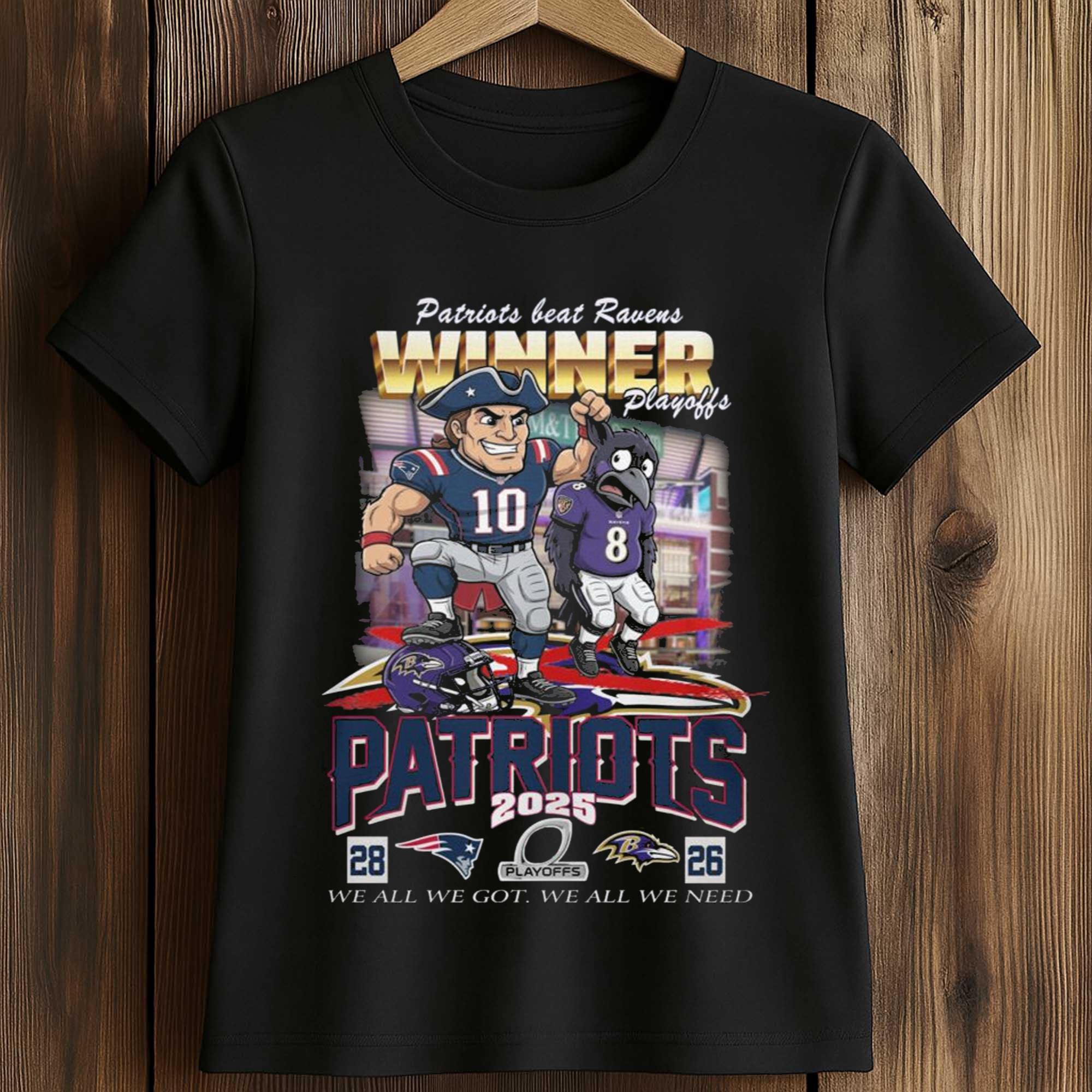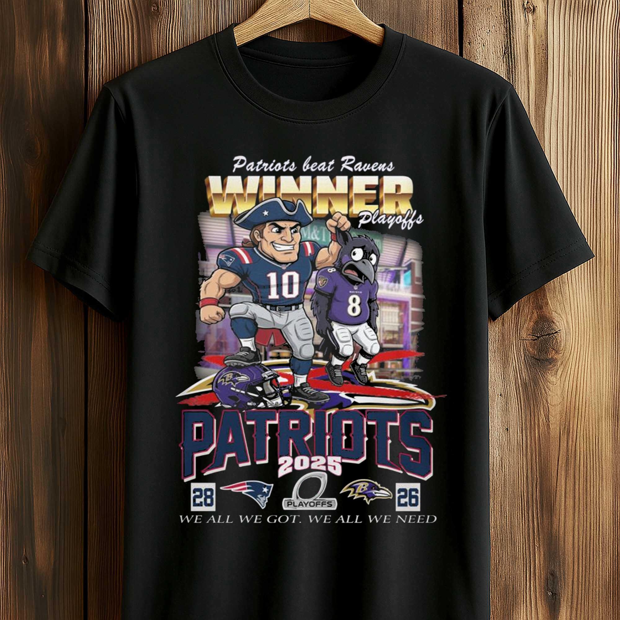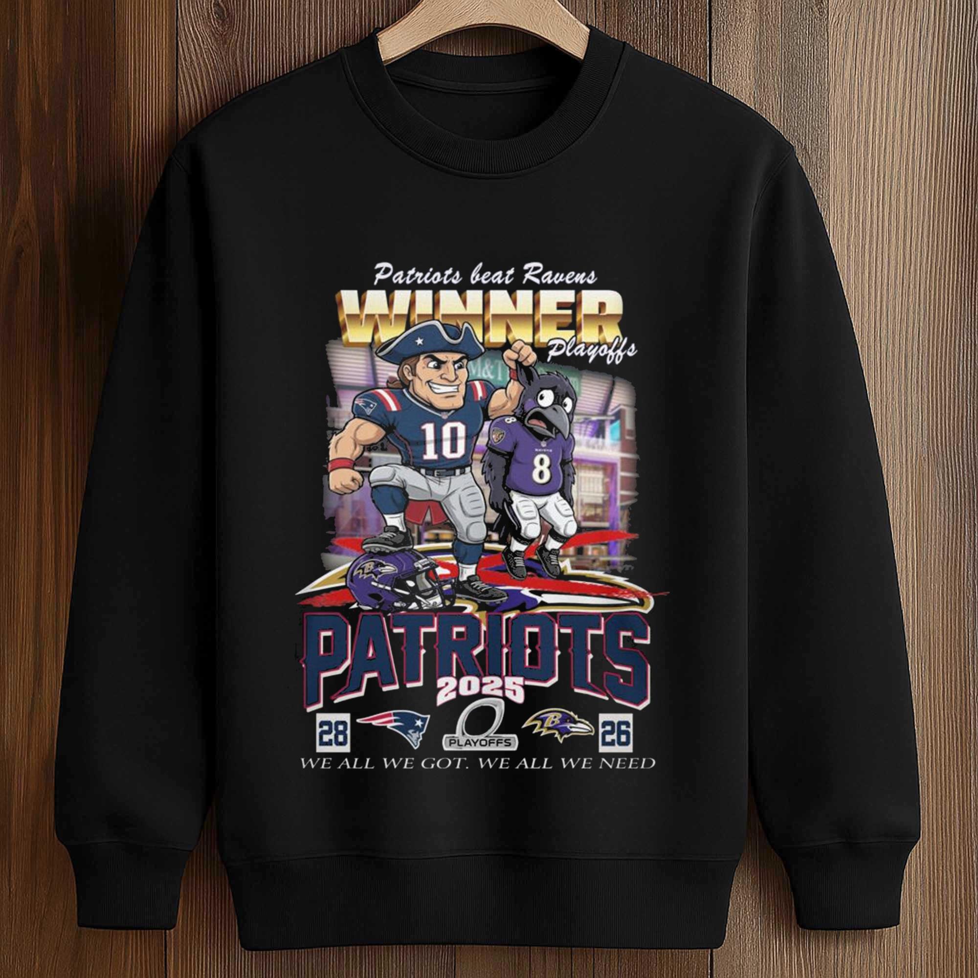 The Patriots Beat Ravens Winner Playoff We all We Got We all We Need Shirt combines striking imagery, the team’s iconic colors, and a clear playoff message. Illustrated player images, detailed final score, and bold typography create a design that instantly appeals to football fans closely following every playoff game.