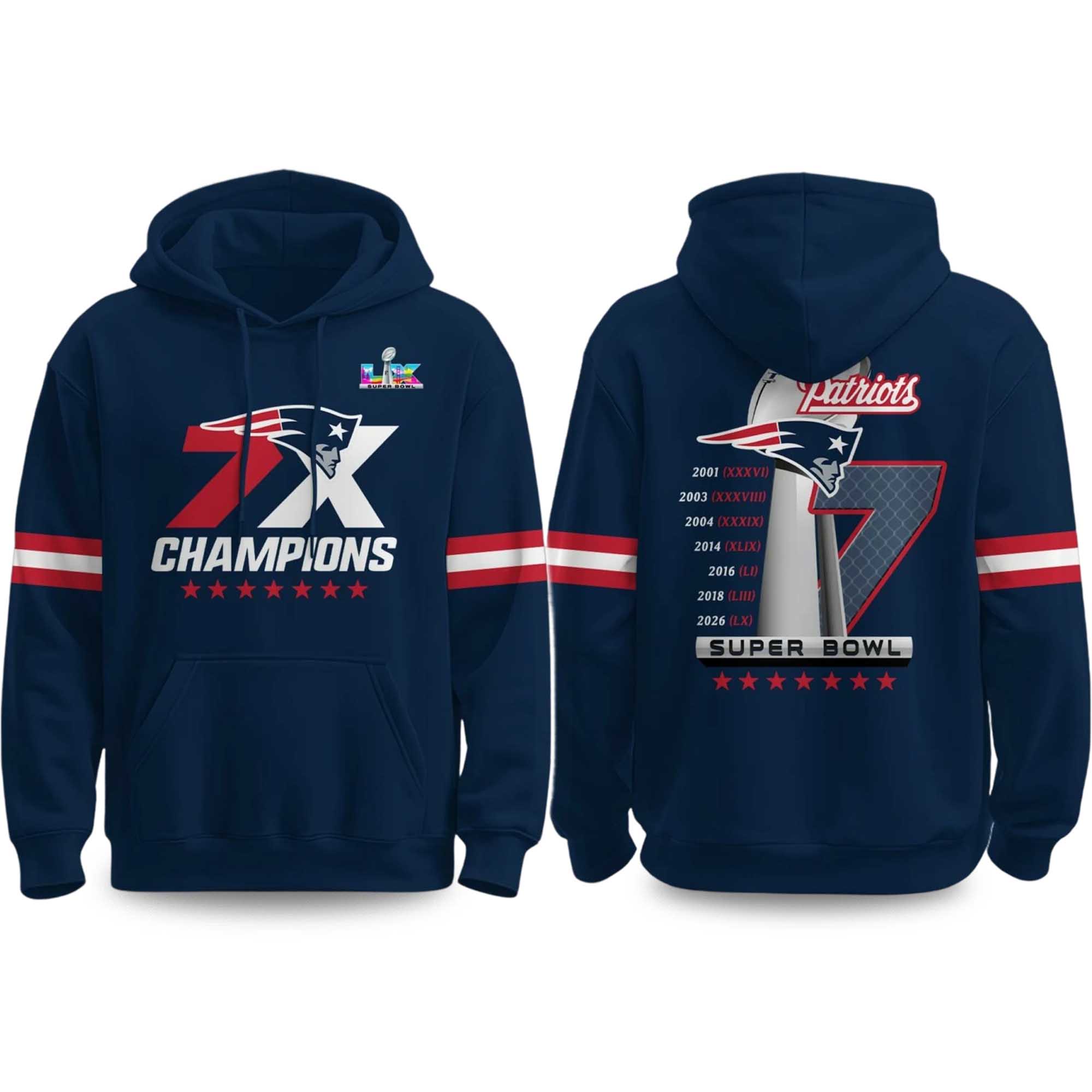 The hoodie features a deep navy blue with classic red and white sleeve stripes for an instantly recognizable Patriots look. The front prominently displays “7X Champions,” while the back features a large number design combined with the Super Bowl year, creating a powerful timeline of dominance. Designed for warmth and comfort, this hoodie is perfect for fans proud of the team’s legacy.