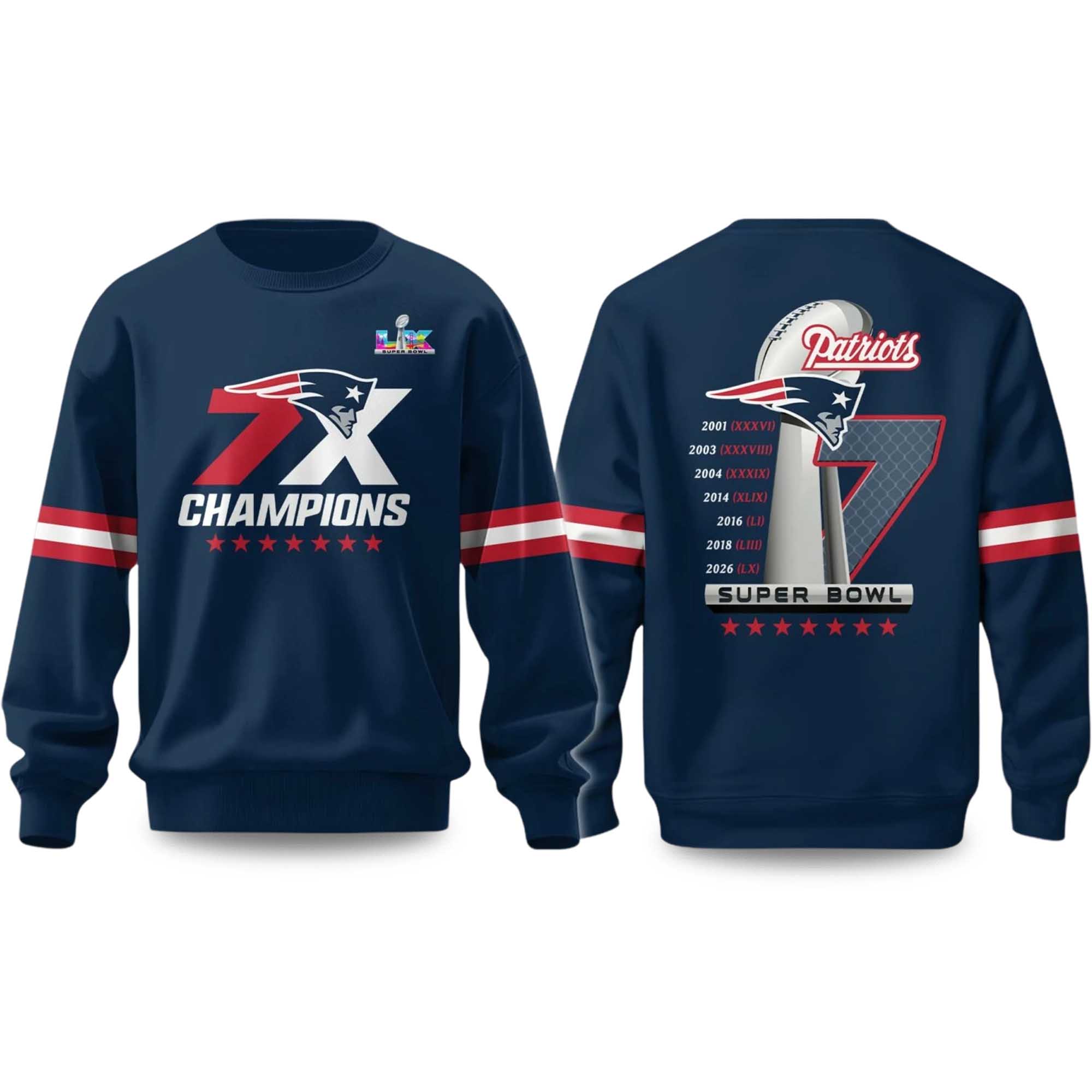 The Patriots Super Bowl 7x Champions 2026 Sweatshirt is designed for fans who value history and style. Featuring a deep navy blue base, signature red and white accents, and championship imagery on both the front and back, this sweatshirt celebrates every Super Bowl victory in a powerful design. A soft fleece lining ensures warmth, while durable stitching makes it ideal for long-lasting wear on game days or casual outings.