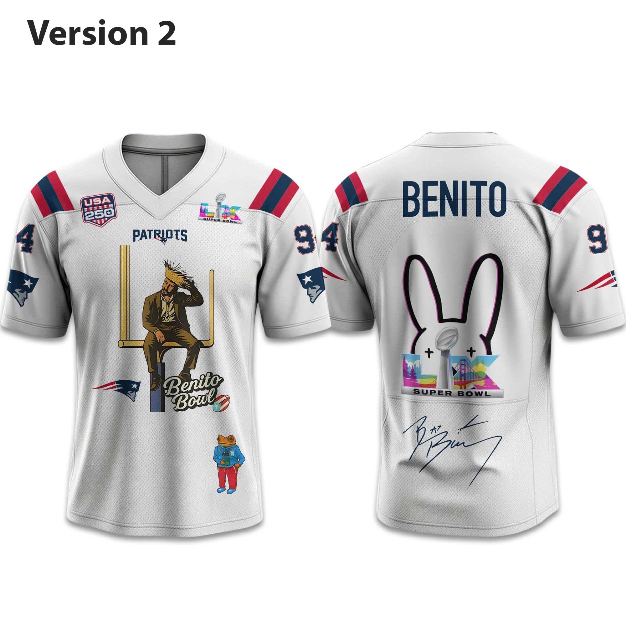 Designed with a comfortable, athletic fit, this jersey allows for easy movement and layering. The fabric maintains its shape with regular wear, while the imagery remains sharp and vibrant. The combination of Super Bowl LX elements, the USA 250 logo, and Bad Bunny-style imagery gives the jersey a unique personality, standing out in any fan’s collection.