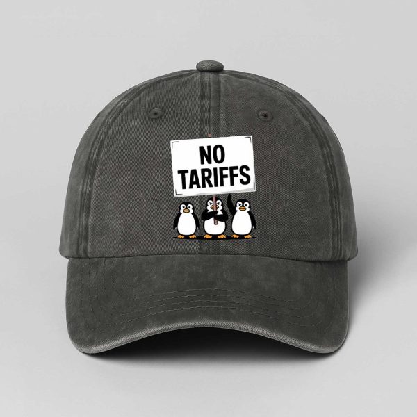 This hat features a striking graphic of three penguins holding a “No Tariffs” sign, symbolizing opposition to trade barriers. The black, distressed finish gives the hat a classic look, while the embroidered design ensures durability and a premium look, making it a standout accessory.