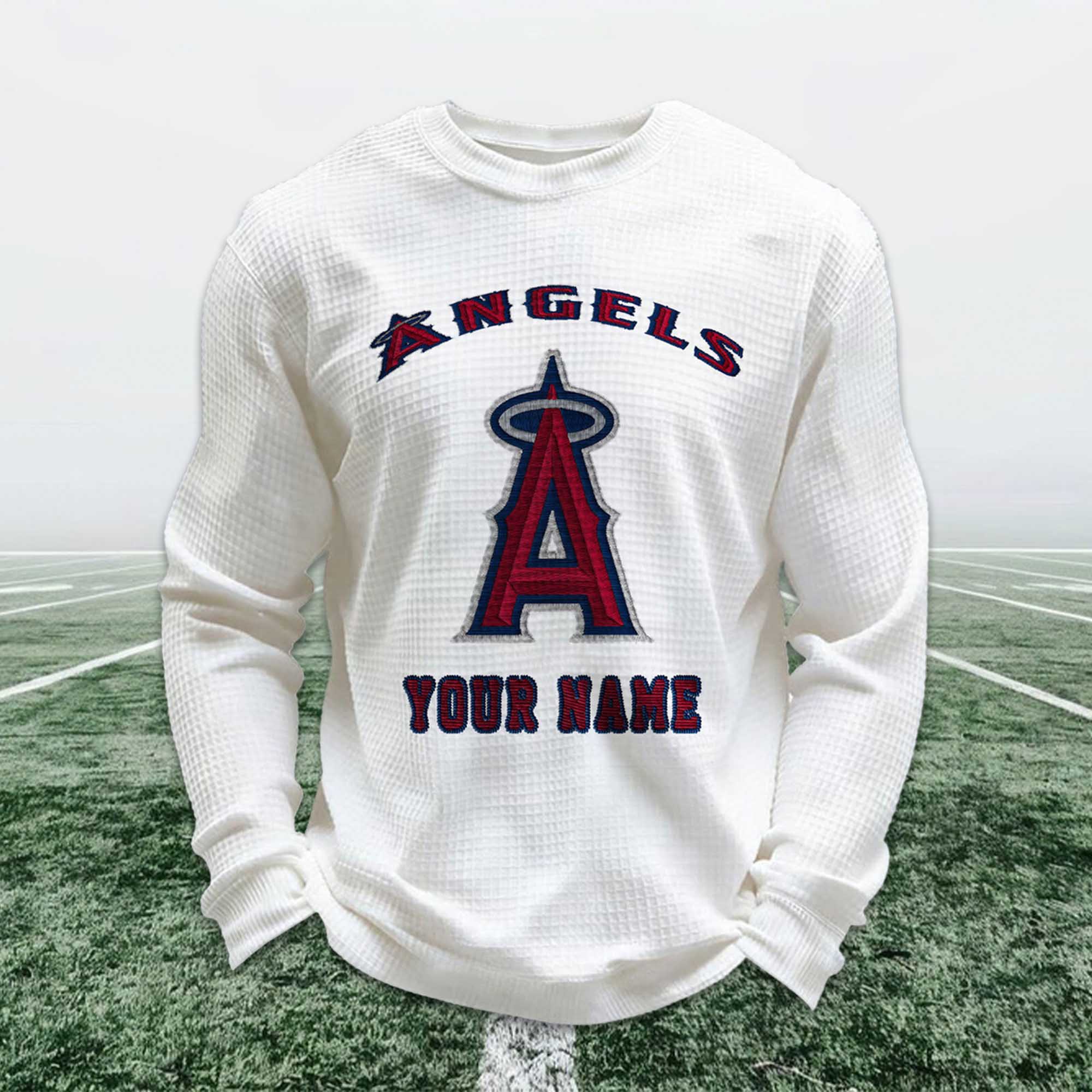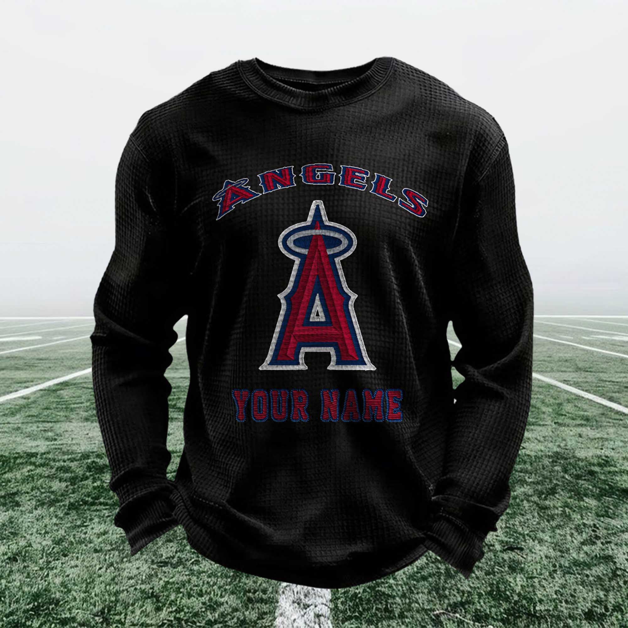 Show your fan style in a more personal way with the sweatshirt. Add your name, enjoy the comfortable waffle fabric, and wear a design that fits into everyday life. Whether you buy it for yourself or choose a meaningful gift, this sweatshirt offers comfort, style, and personal meaning. Order today and show your pride in Angels in your own way.