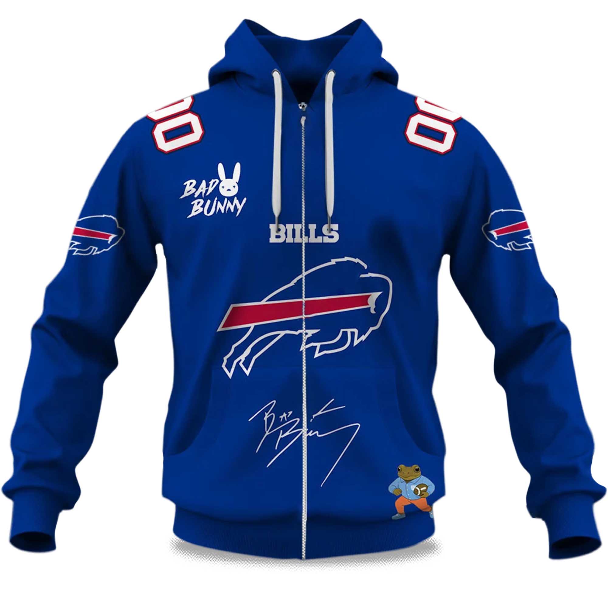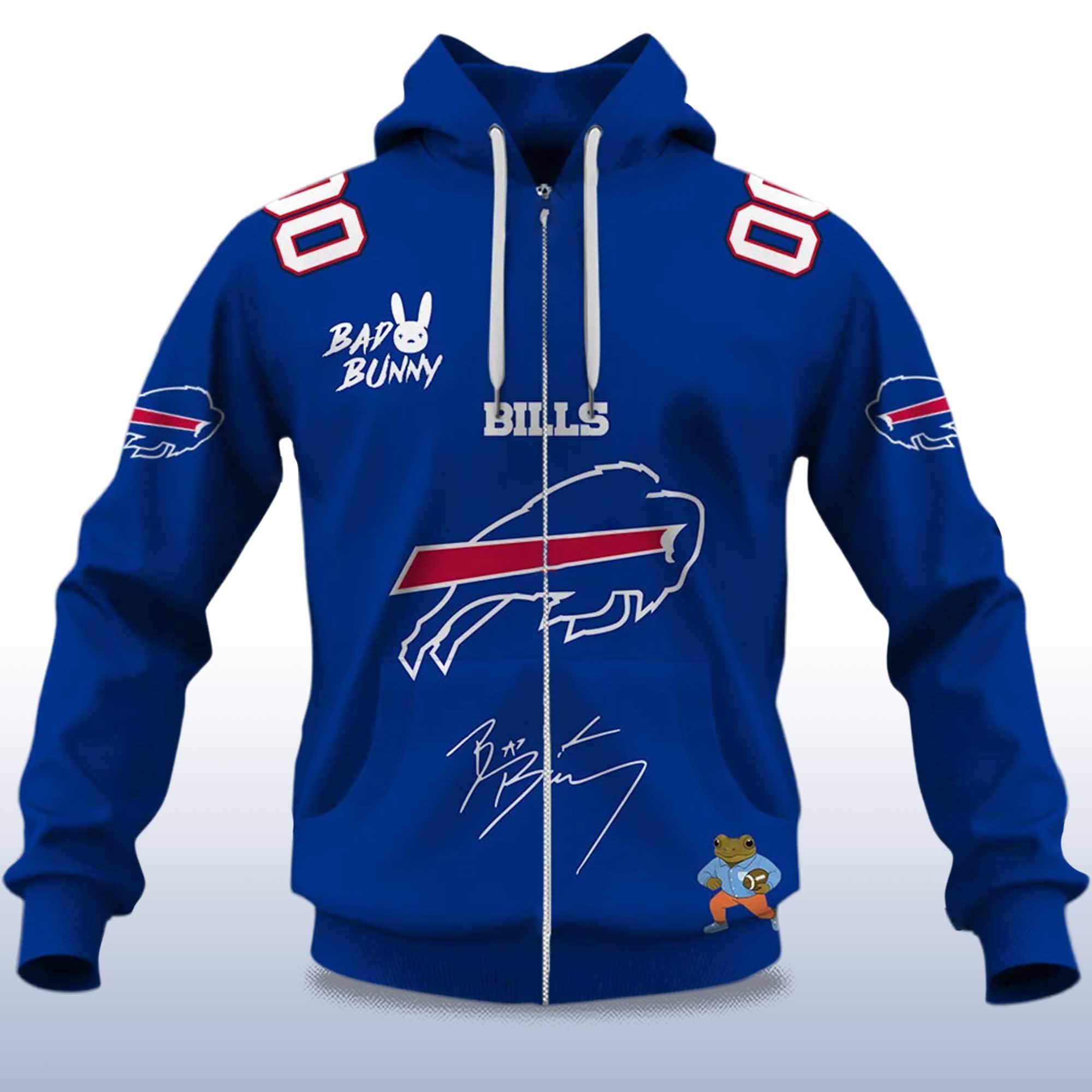 The Personalized Bills Bad Bunny Bowl LX 2025 2026 Zipper Hoodie is making a big splash this season thanks to its vibrant blue color scheme, clean lines, and vibrant Bad Bunny graphics on the chest and shoulders. The design reflects a growing trend: team merchandise mixed with pop culture icons, giving fans a way to express their style in the new season.