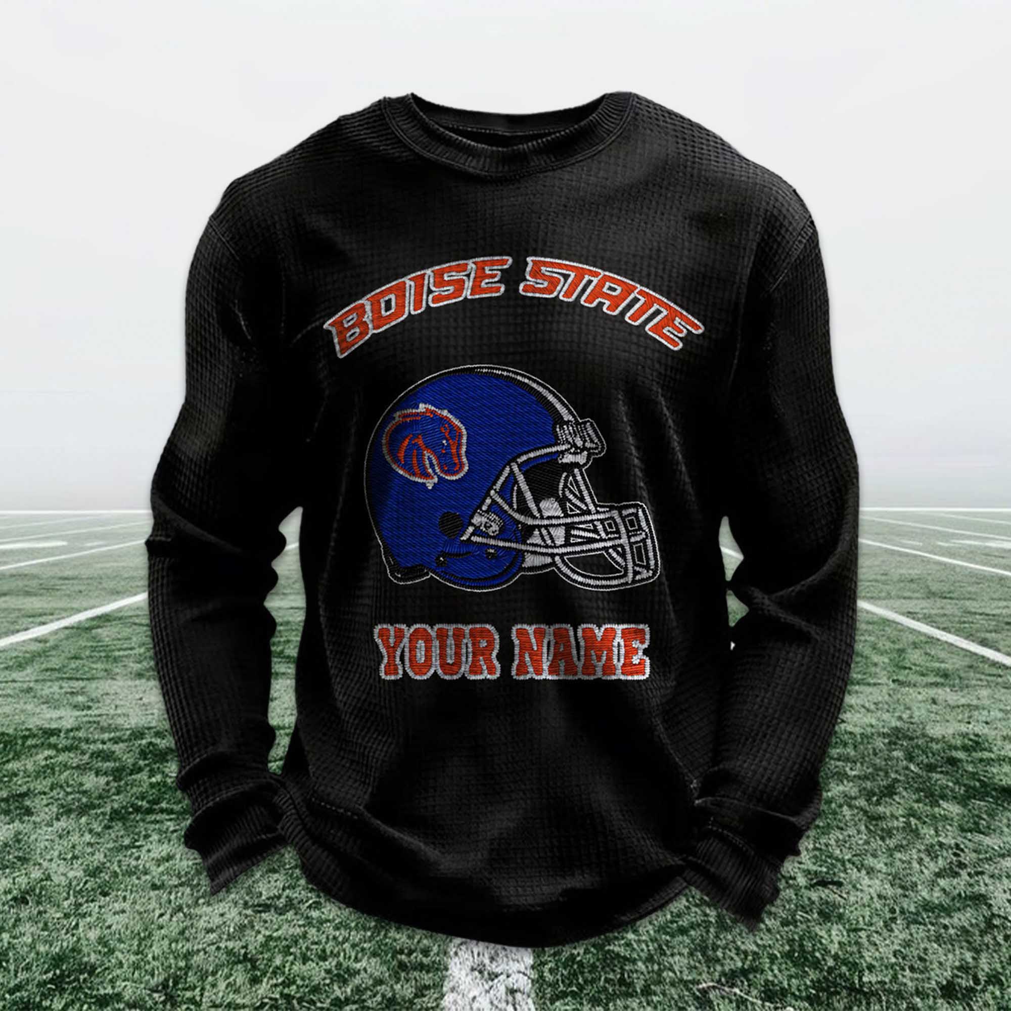 The Personalized Boise State Football Waffle Sweatshirt is designed for fans who want to show their Broncos pride while maintaining their personal style. Inspired by classic soccer imagery, this sweatshirt features the iconic Boise State soccer helmet and a custom name print option, bringing fans closer to their team. It’s a great balance between school spirit and everyday comfort.