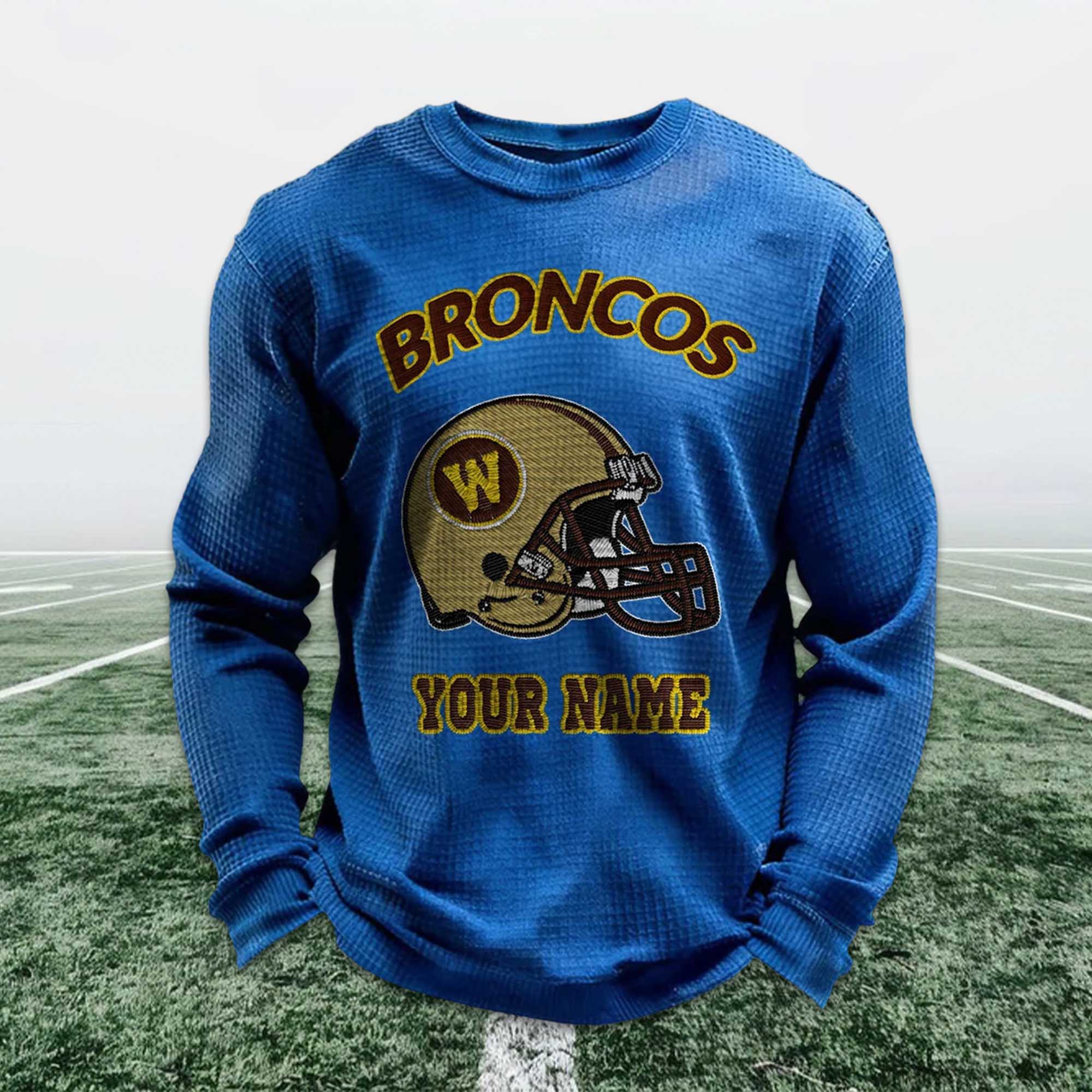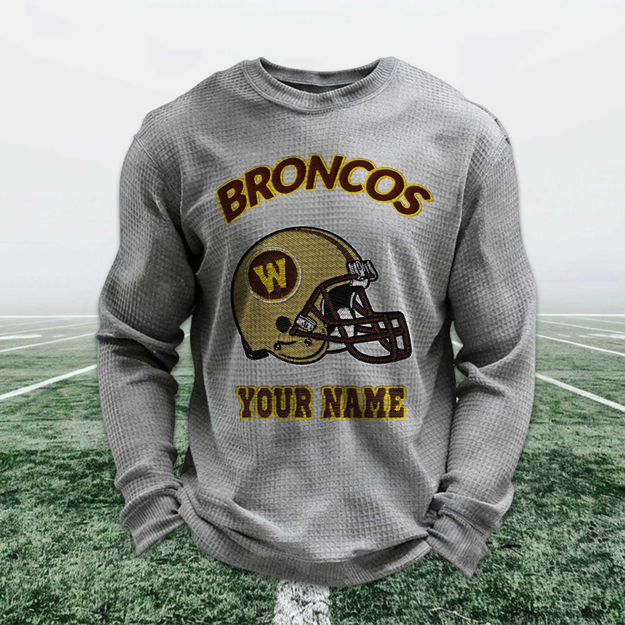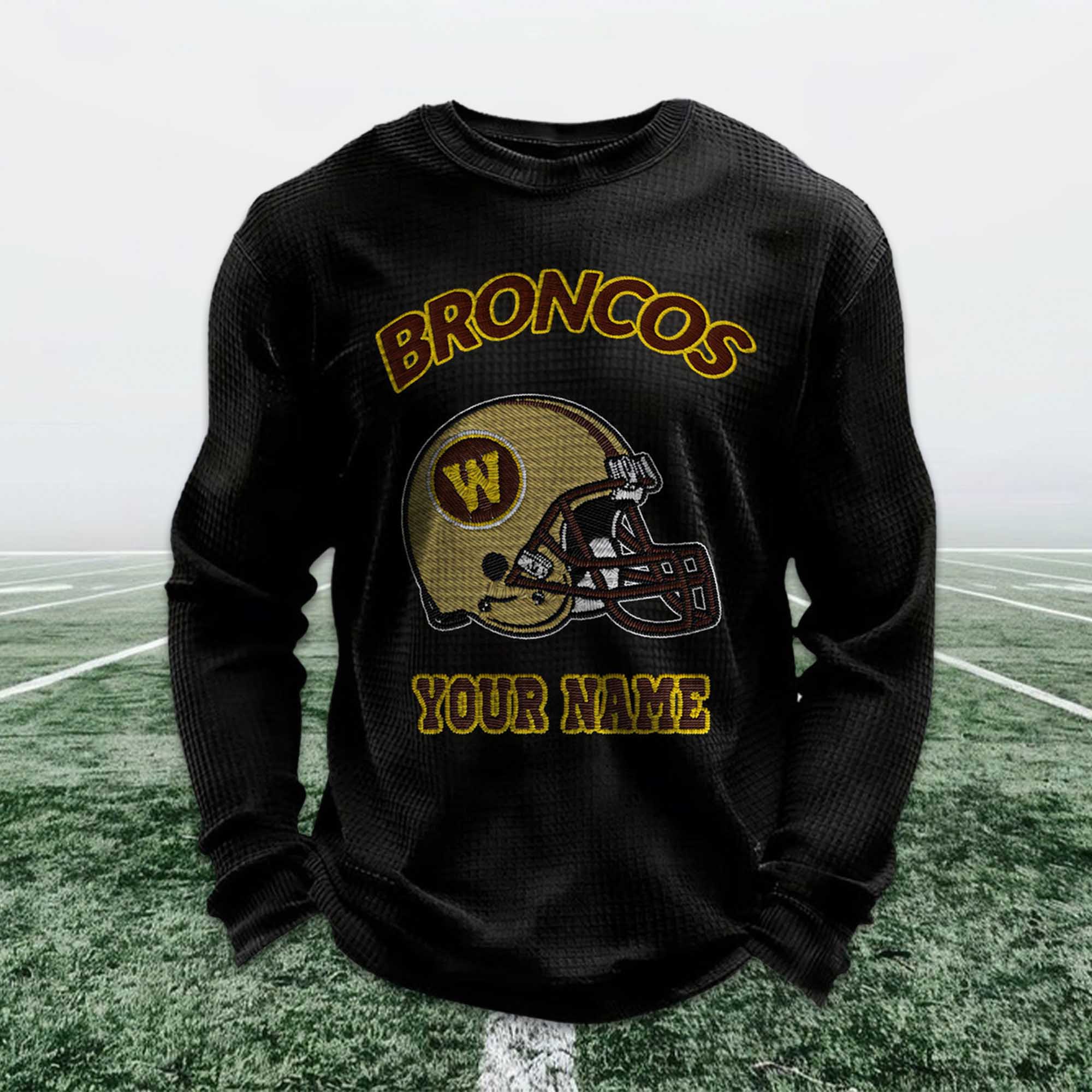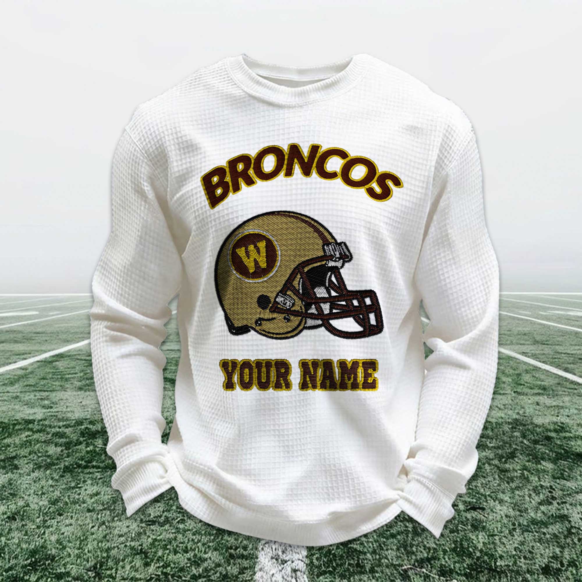 This Personalized Broncos Football Waffle Sweatshirt focuses on comfort and everyday wearability. The soft waffle weave is gentle on the skin while providing balanced warmth, keeping you comfortable for hours. The sweatshirt isn’t bulky, making it easy to layer or wear alone. The prominent football helmet logo and personalized name remain legible even after multiple washes, keeping your look fresh over time.