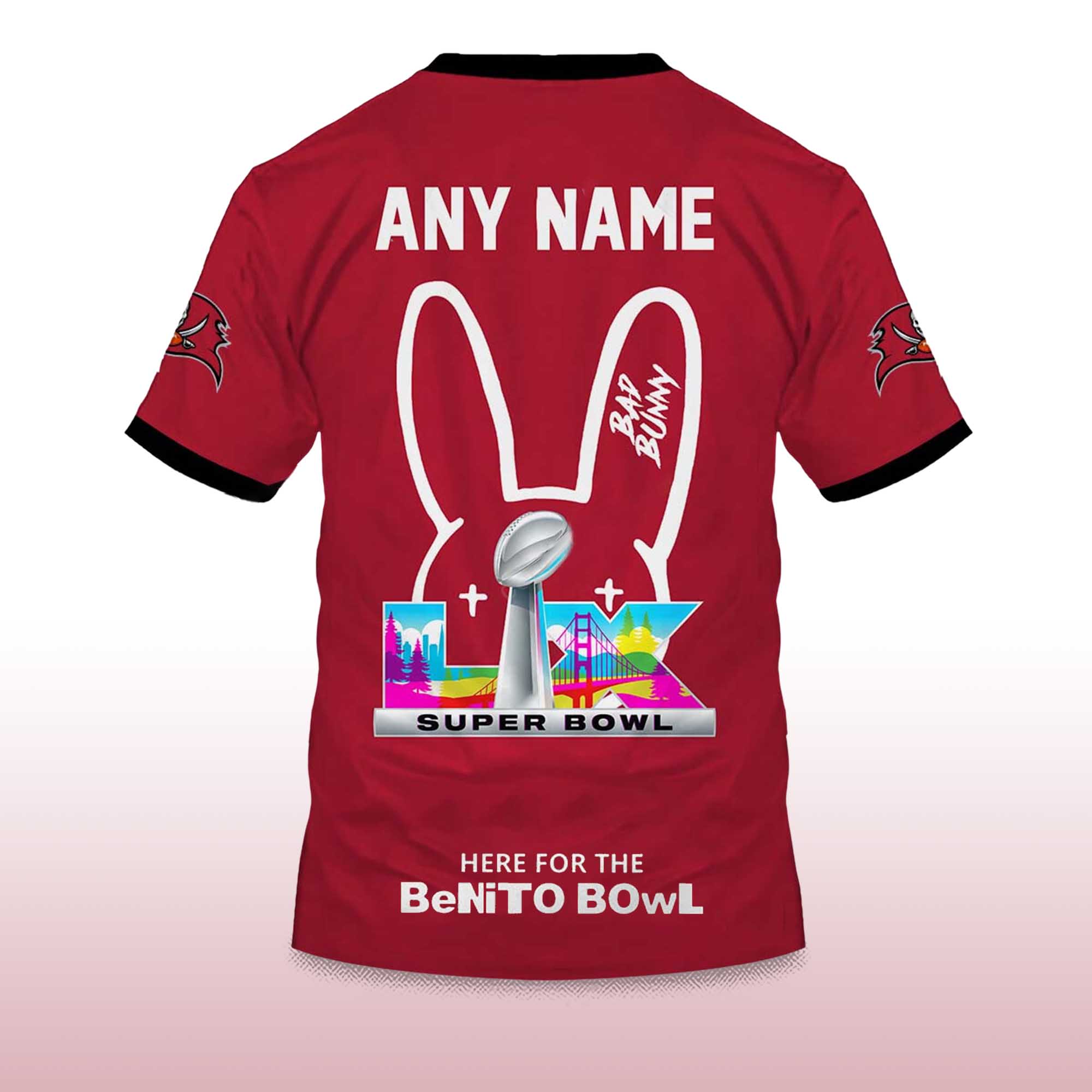 This Personalized Buccaneers Bad Bunny Bowl LX 2025 2026 Shirt features a bright red body combined with a large Buccaneers flag graphic on the chest. Sleeve accents, shoulder patches, and a small cartoon detail near the hem add a personal touch to the design. The t-shirt is soft and breathable, making it comfortable for warmer days or to wear under a jacket. Fans can add their name or number, making it a truly personal and meaningful item.