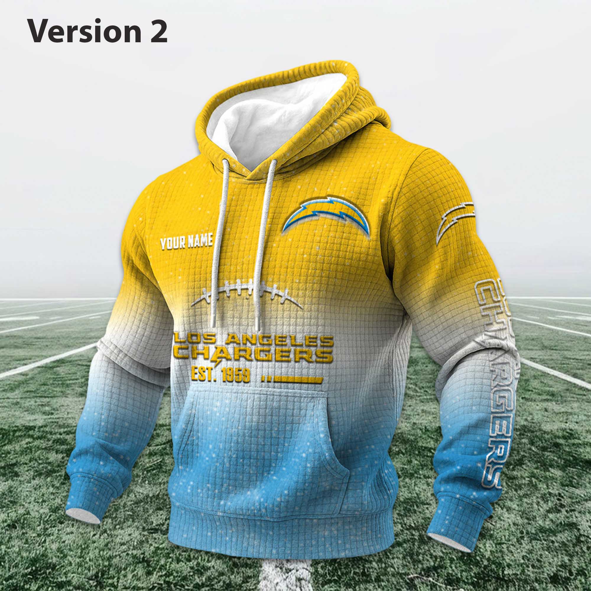 This Personalized Chargers EST 1959 Football Waffle Hoodie features a striking blue-to-yellow gradient effect, inspired by the Chargers’ colors. The front prominently displays “Chargers EST. 1959” lettering along with football-style graphics, while customizable name details add a personal touch. The waffle-knit fabric provides warmth and breathability, keeping you comfortable in cooler weather. Cool. The loose fit, front pockets, ribbed cuffs, and adjustable hood support everyday comfort and long-lasting use.