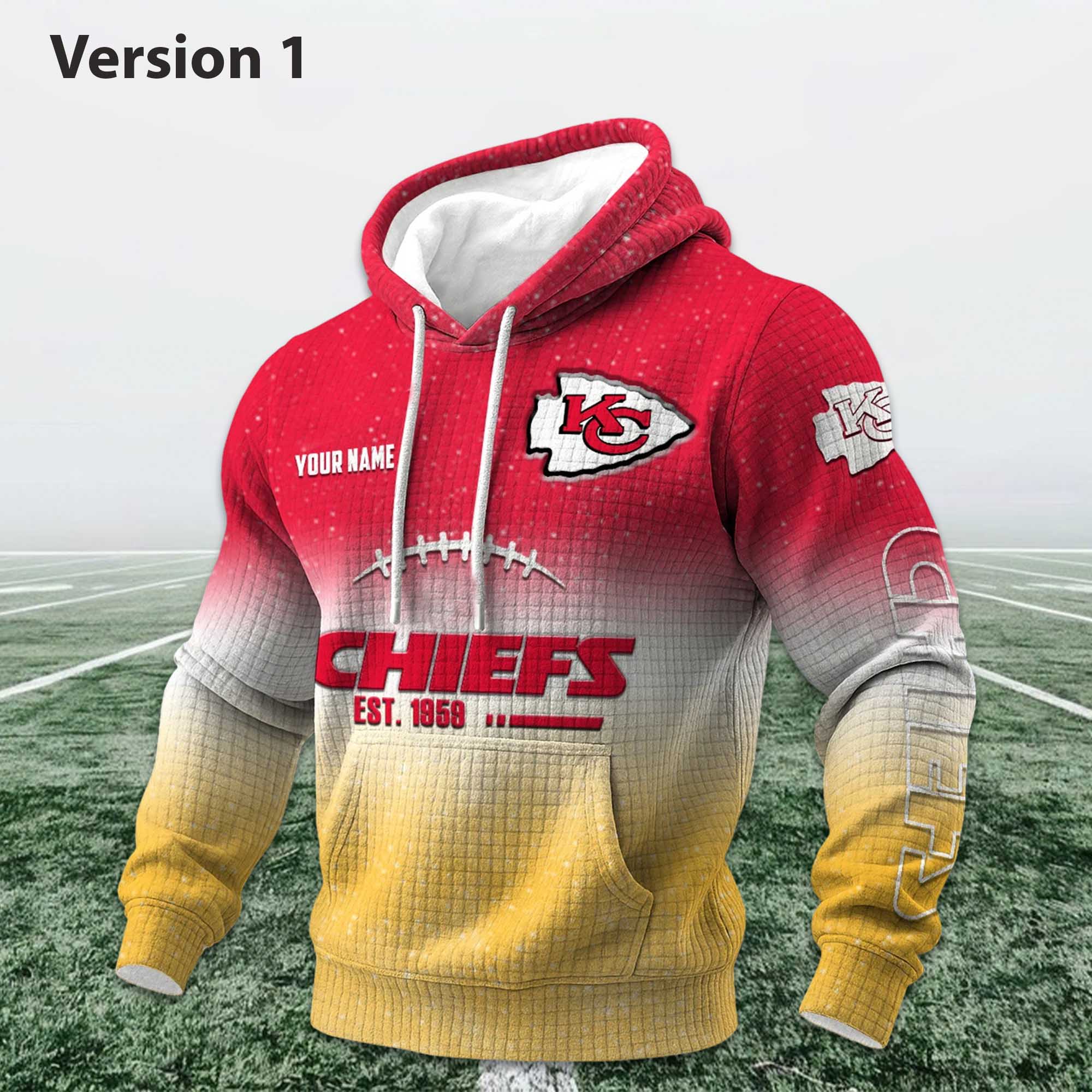 The design combines depth, contrast, and identity. The gradient effect creates visual movement, while the Chiefs logo remains prominent and easily recognizable. The waffle-textured fabric adds depth without feeling heavy. Personalization enhances individuality, making each hoodie unique yet deeply rooted in soccer culture.