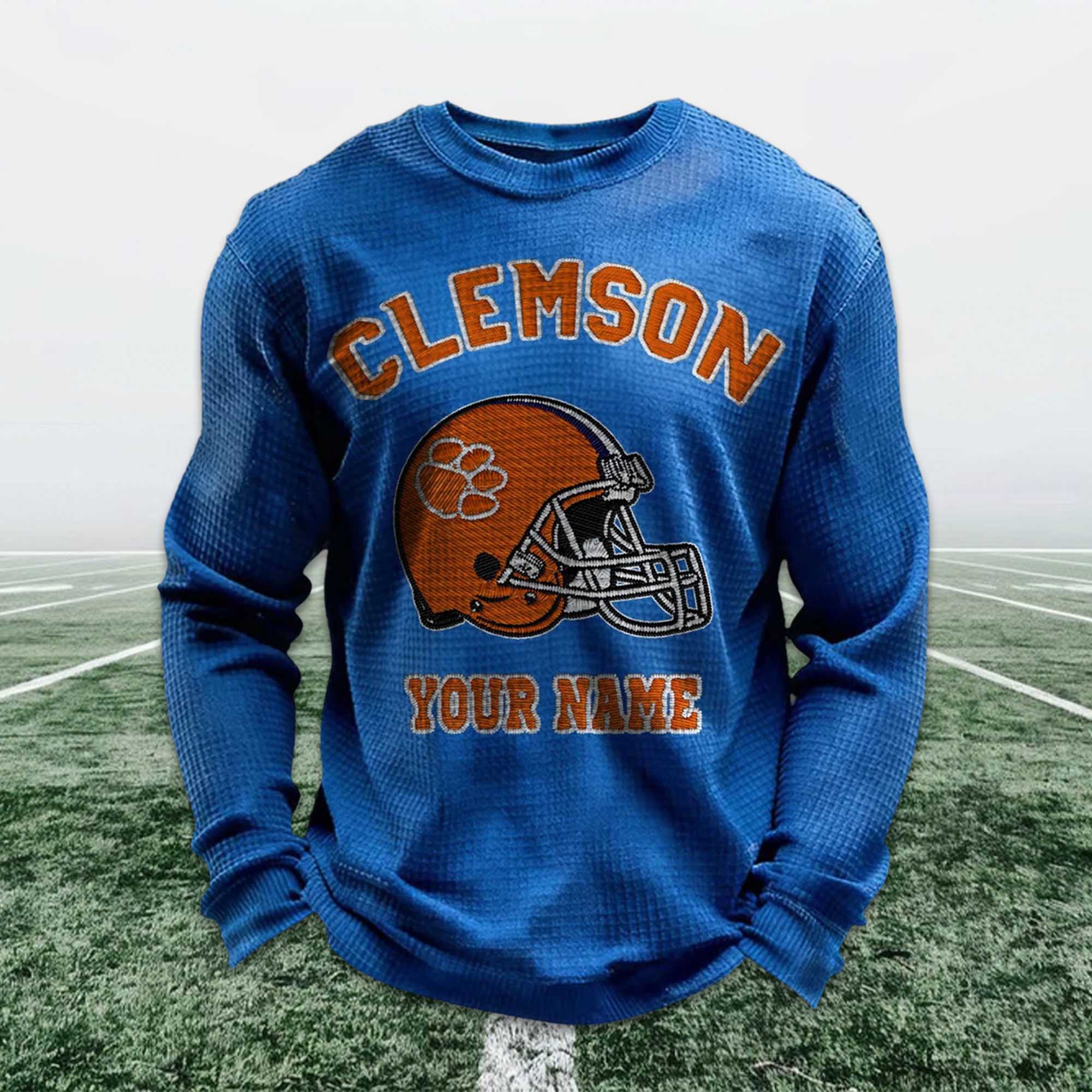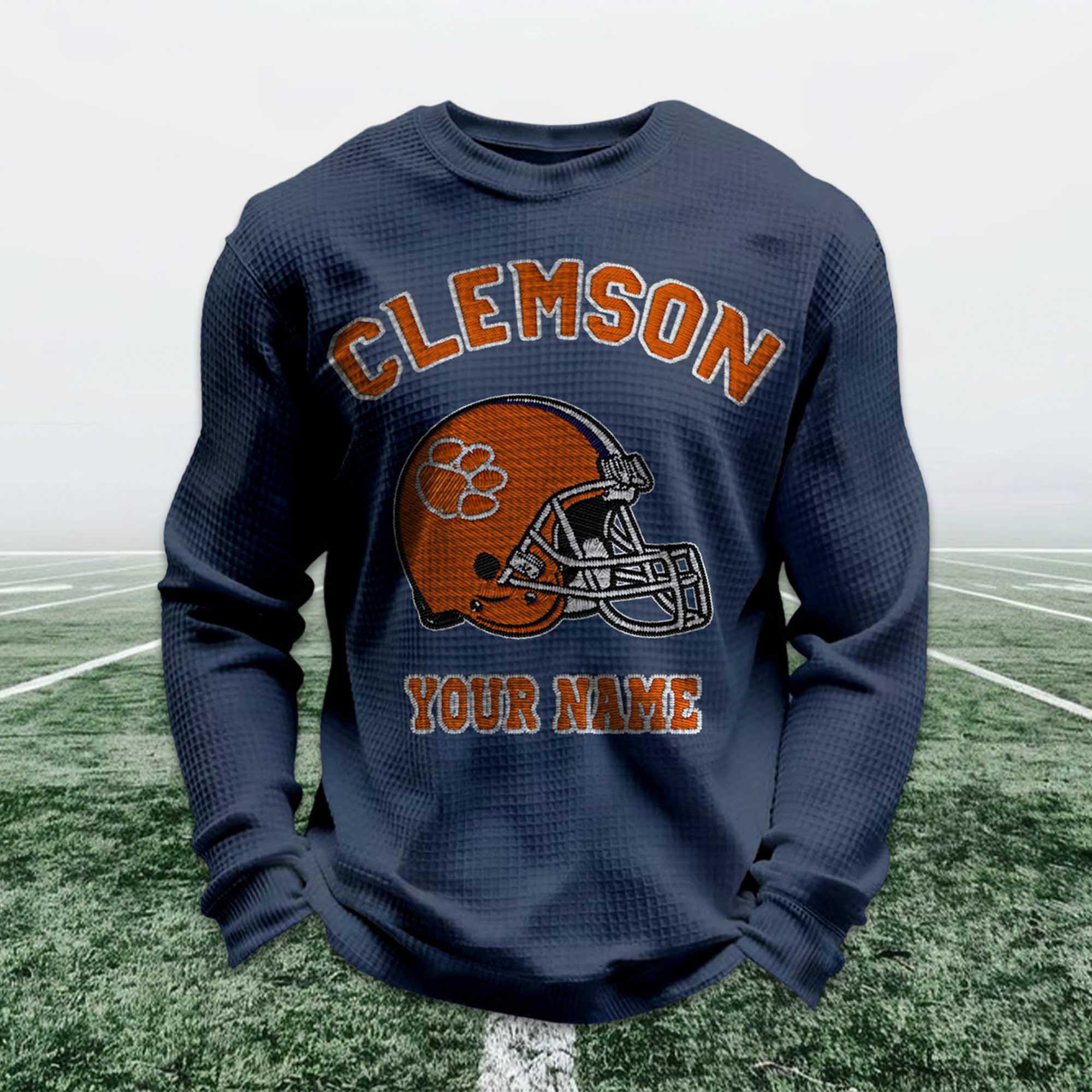 Fan apparel can be both personalized and comfortable with this personalized Clemson football team printed waffle-style knit sweatshirt. Add your name, proudly support the Clemson Tigers, and enjoy a comfortable style that easily complements everyday outfits. Order now and confidently show your Clemson pride wherever you go.