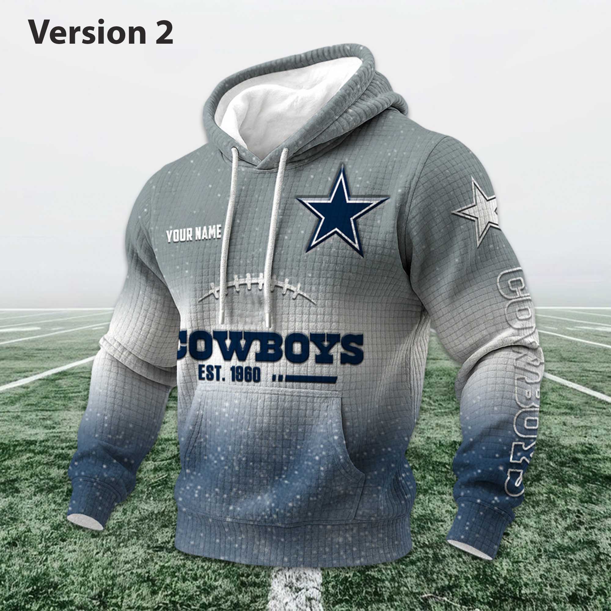 This hoodie features a smooth color transition from deep navy to light grey, creating a dynamic visual effect inspired by the stadium atmosphere. The waffle weave fabric adds depth while remaining comfortable for everyday wear. The Cowboys star logo prominently displayed on the chest and sleeves is balanced by clear typography and customizable name placement, giving the hoodie a confident yet sophisticated look.