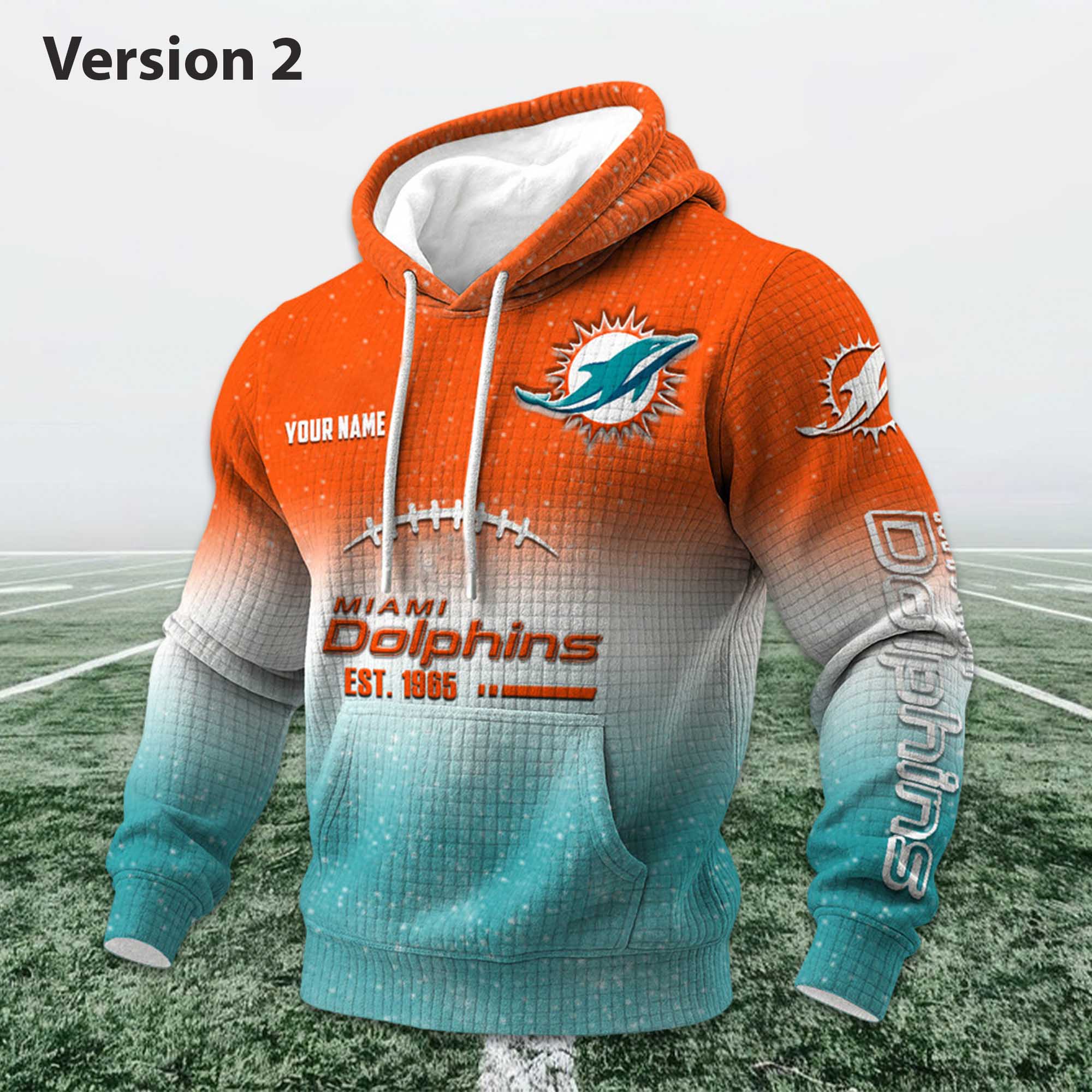The Personalized Dolphins EST 1965 Football Waffle Hoodie reflects the energy and history of a team that has been prominent since its inception. Inspired by the Dolphins’ founding year, this hoodie embodies a relaxed yet confident soccer spirit. Adding your name makes the design more personal, intimate, and perfectly suited for fans who want their apparel to reflect their individuality.