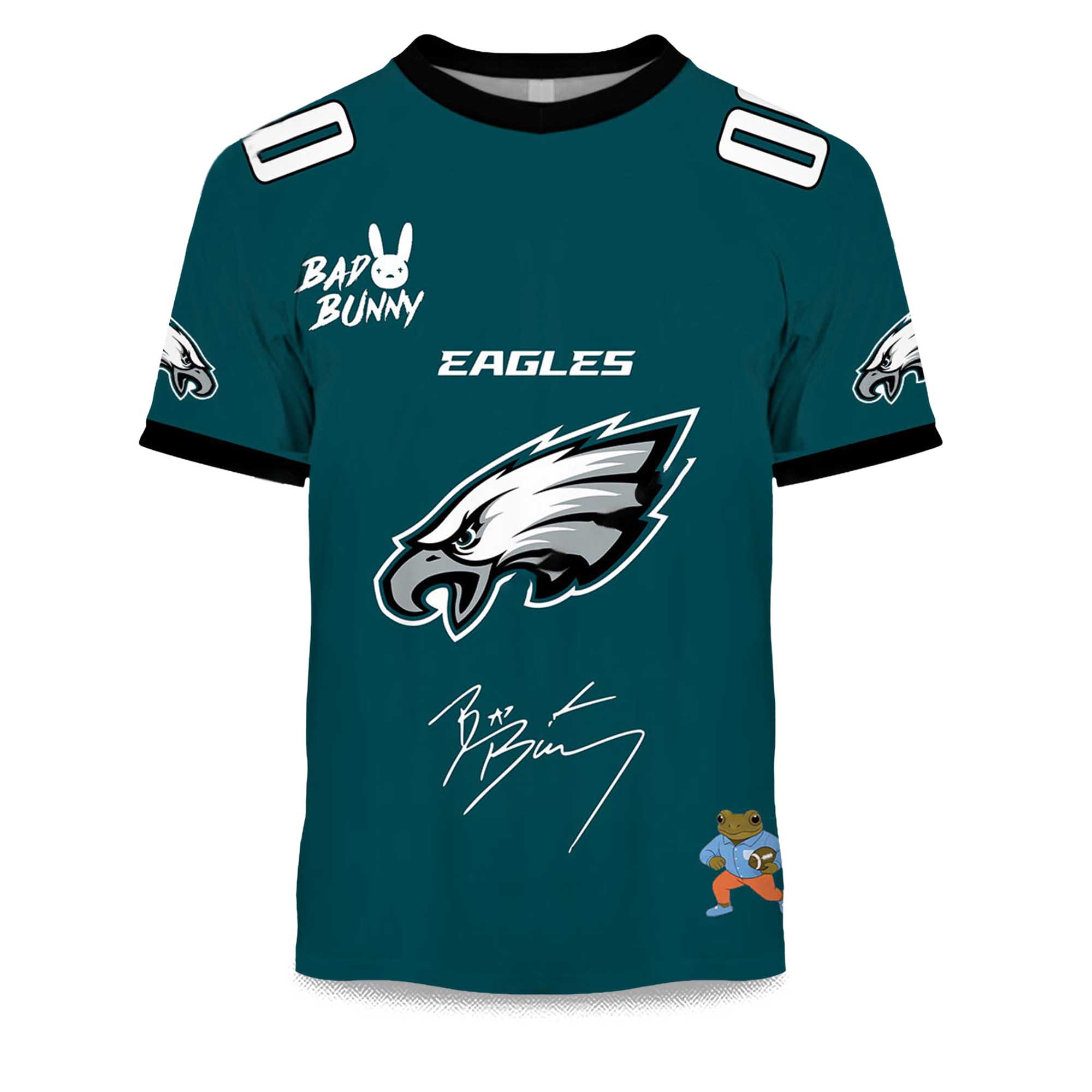 The design combines bold shoulder numbers, bold Eagles branding, and a playful Bad Bunny logo. The front layout creates a balanced feel, while a small character detail near the hem adds a touch of charm. Lightweight fabric, sturdy stitching, and customization options allow every fan to create a unique look.