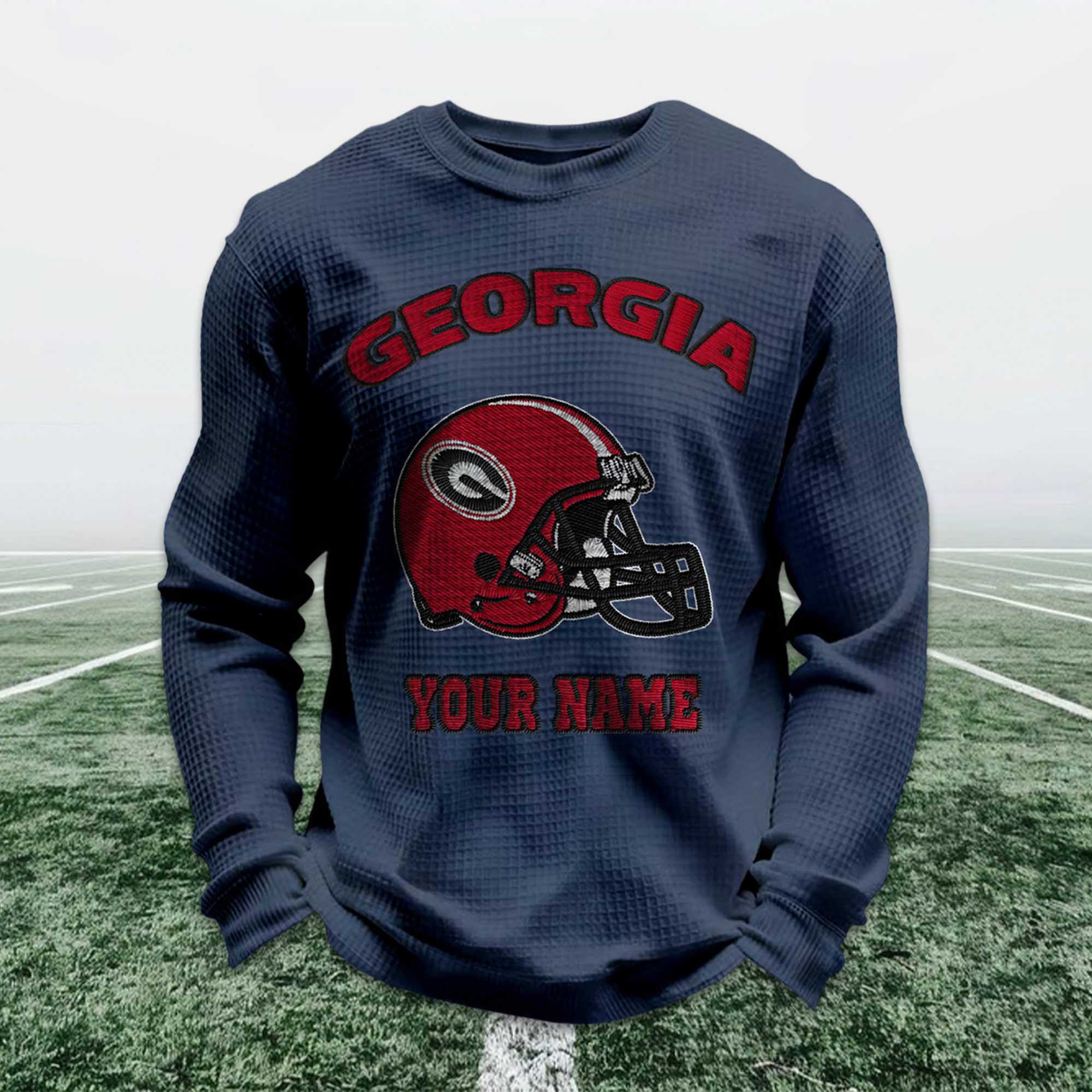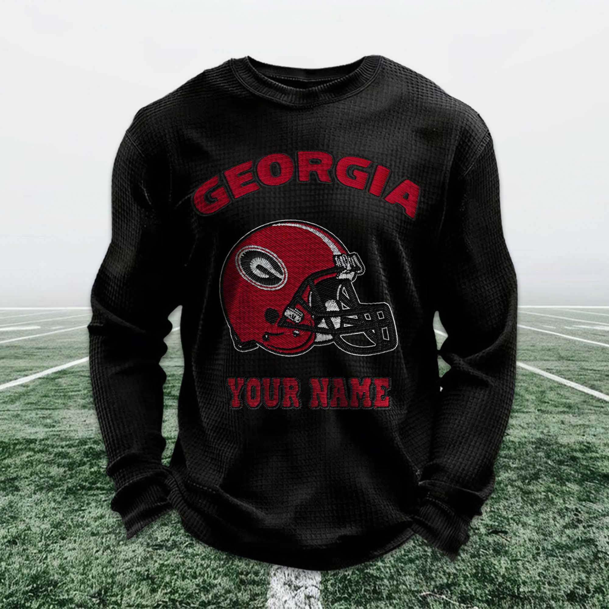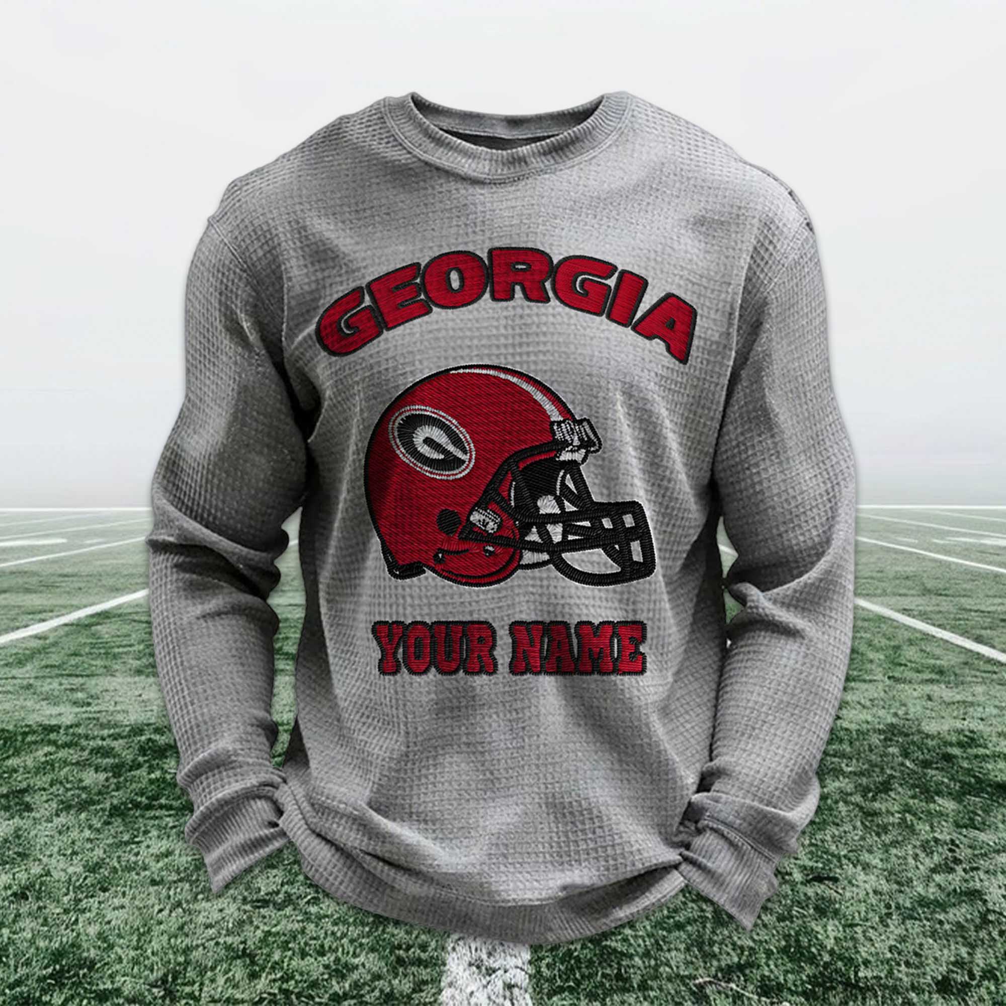 Personalized Georgia Football Waffle Sweatshirt reflects the strong identity and passion of Georgia Bulldogs fans. Inspired by classic soccer, this sweatshirt features a bold red helmet design combined with a custom name option, allowing fans to express their pride in the team in a personal and meaningful way. It’s a modern essential for fans, blending comfort with tradition.