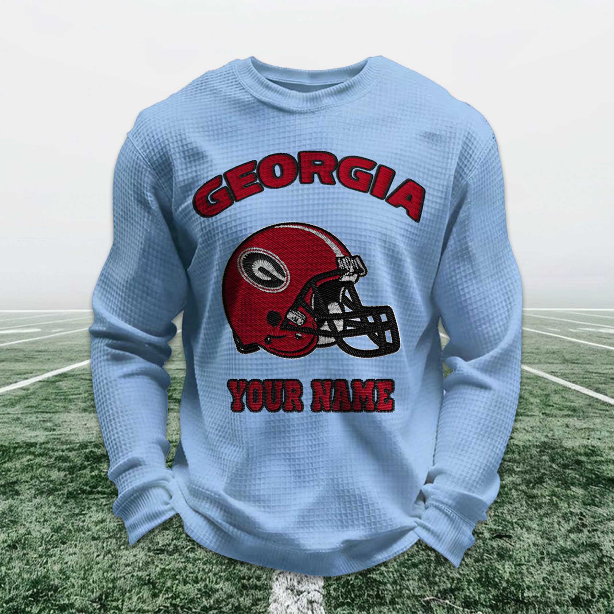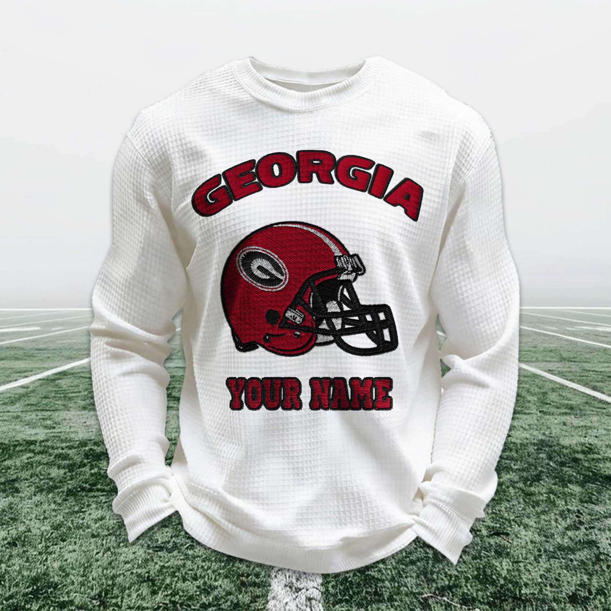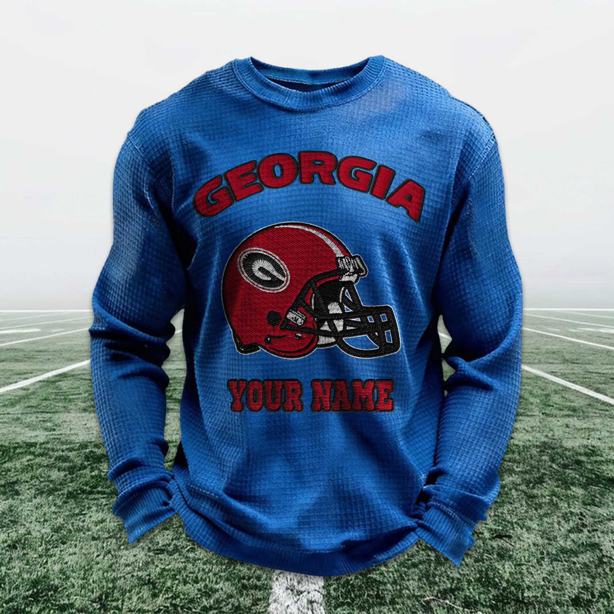 Personalized Georgia Football Waffle Sweatshirt reflects the strong identity and passion of Georgia Bulldogs fans. Inspired by classic soccer, this sweatshirt features a bold red helmet design combined with a custom name option, allowing fans to express their pride in the team in a personal and meaningful way. It’s a modern essential for fans, blending comfort with tradition.