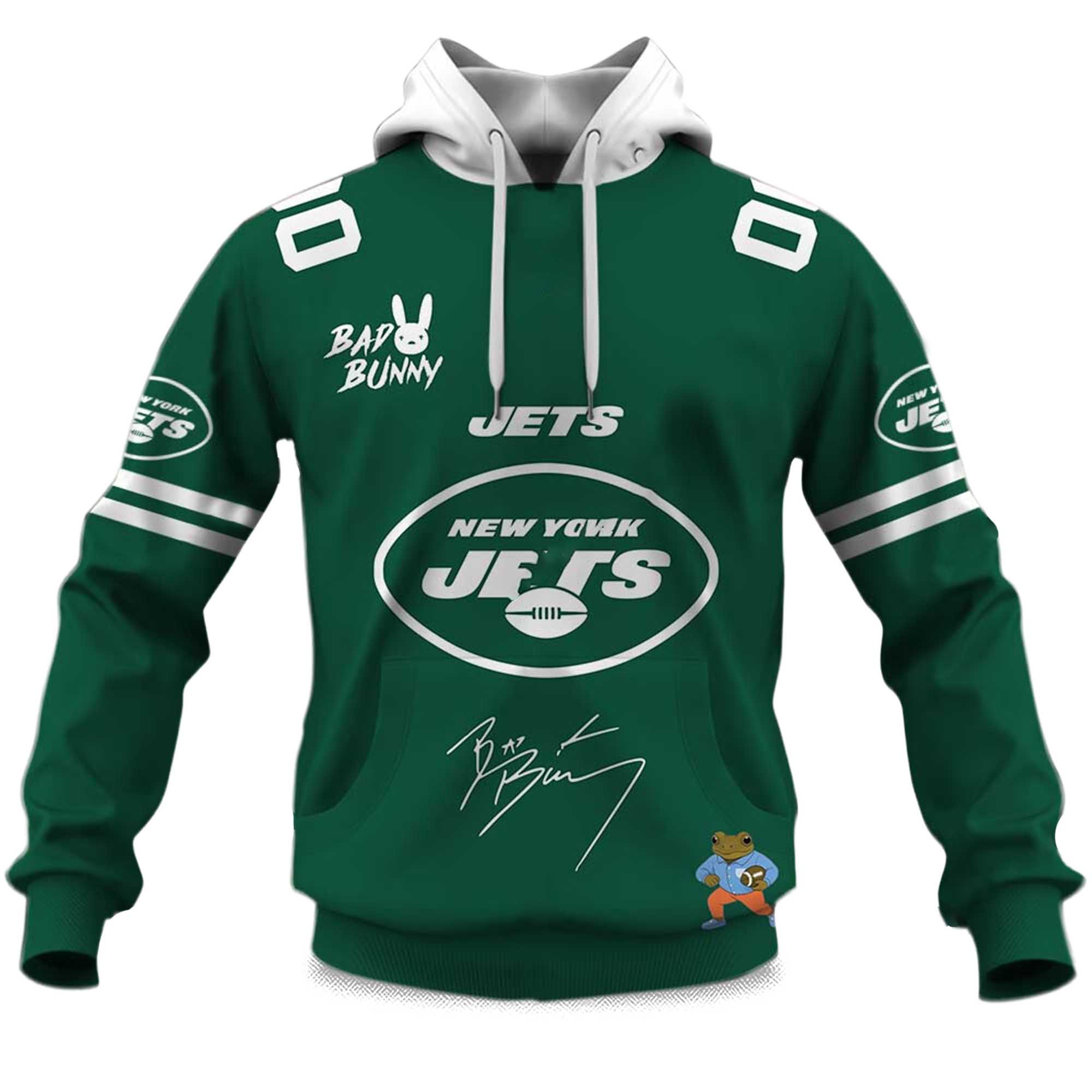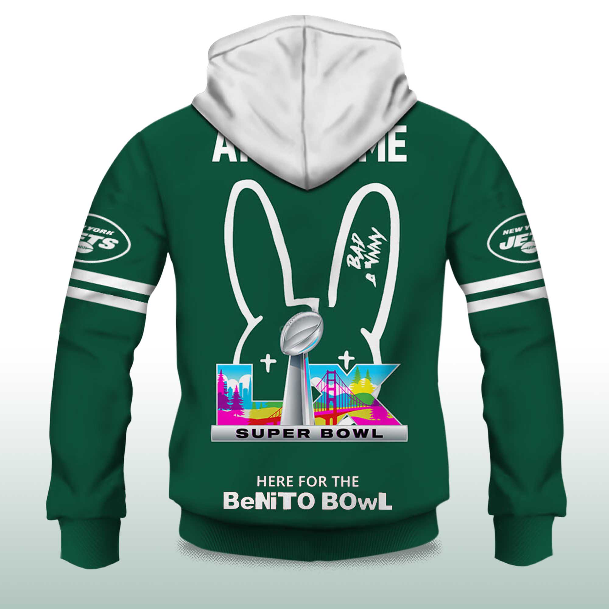 The Personalized Jets Bad Bunny Bowl LX 2025 2026 Hoodie combines vibrant fan culture with classic Jets colors. As Bowl LX gets more vibrant, this hoodie features a bold green base, crisp white accents, and playful graphics, making it a fun choice for both game day and on the go.