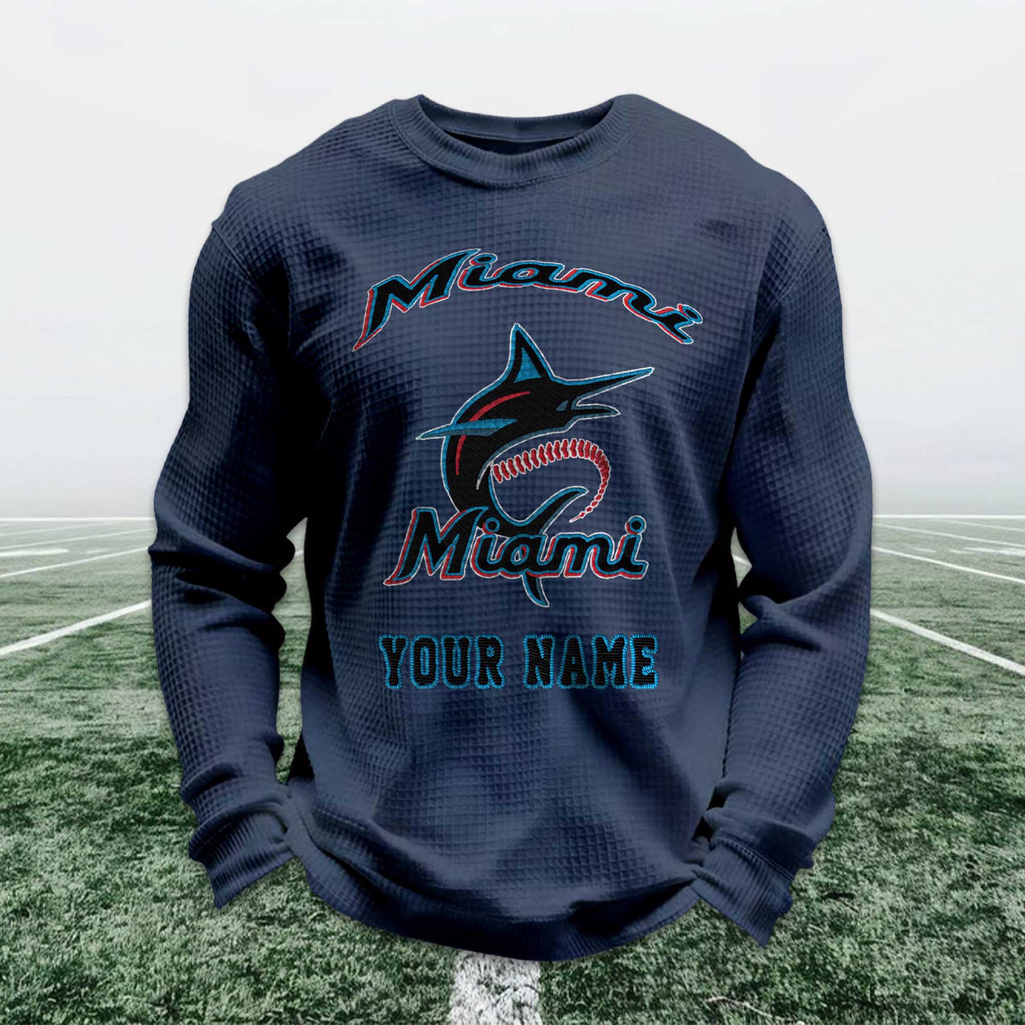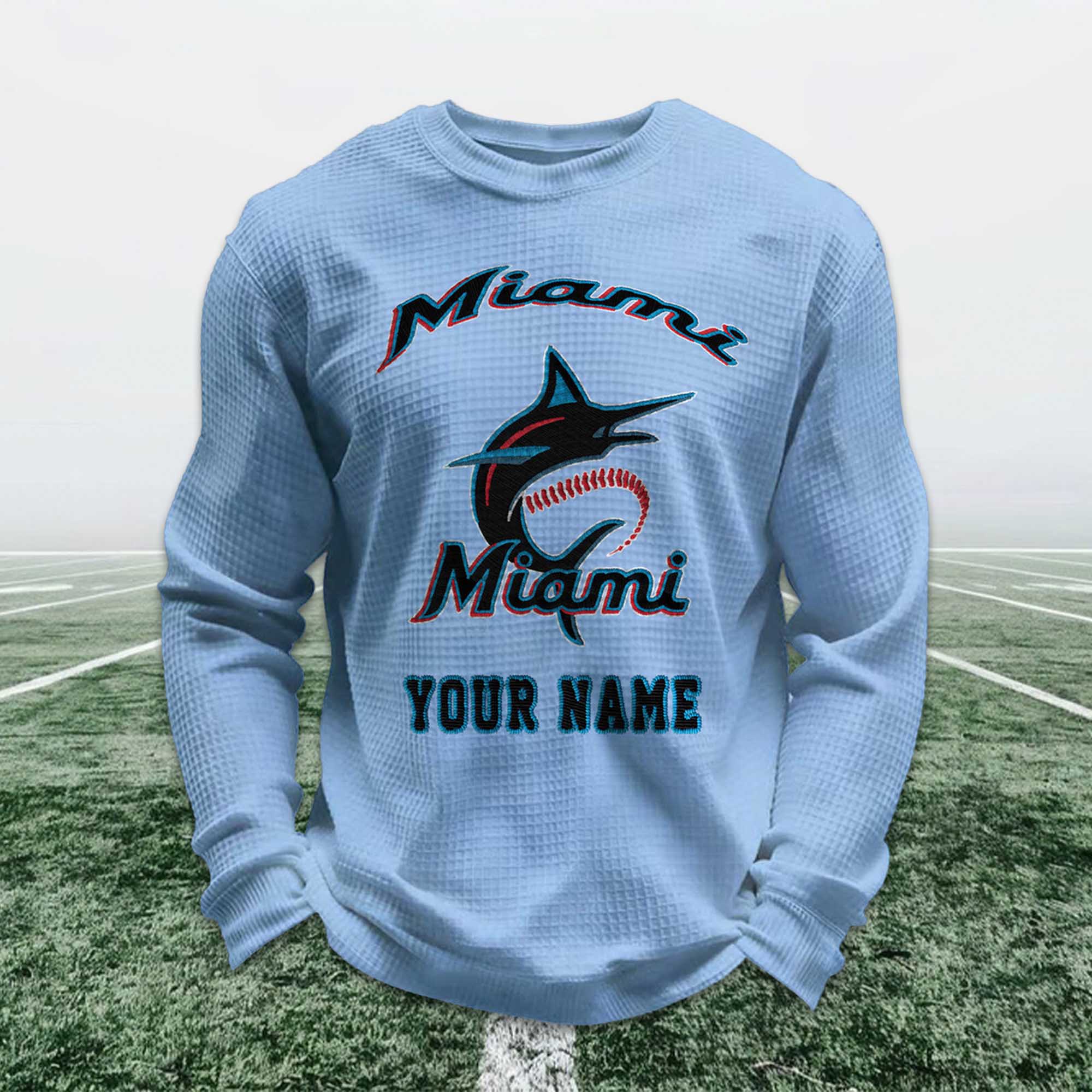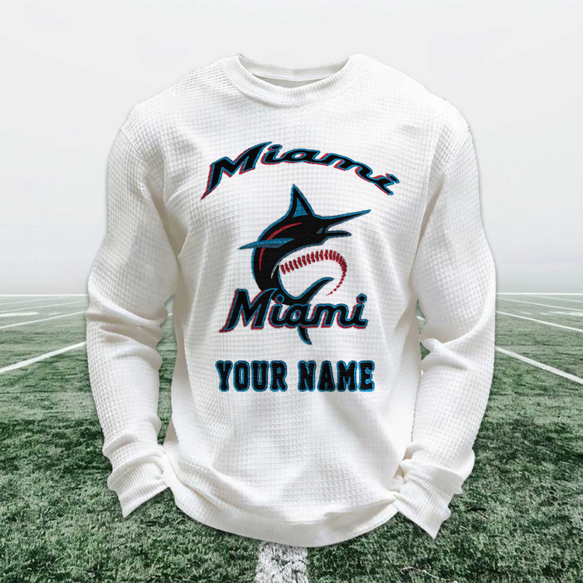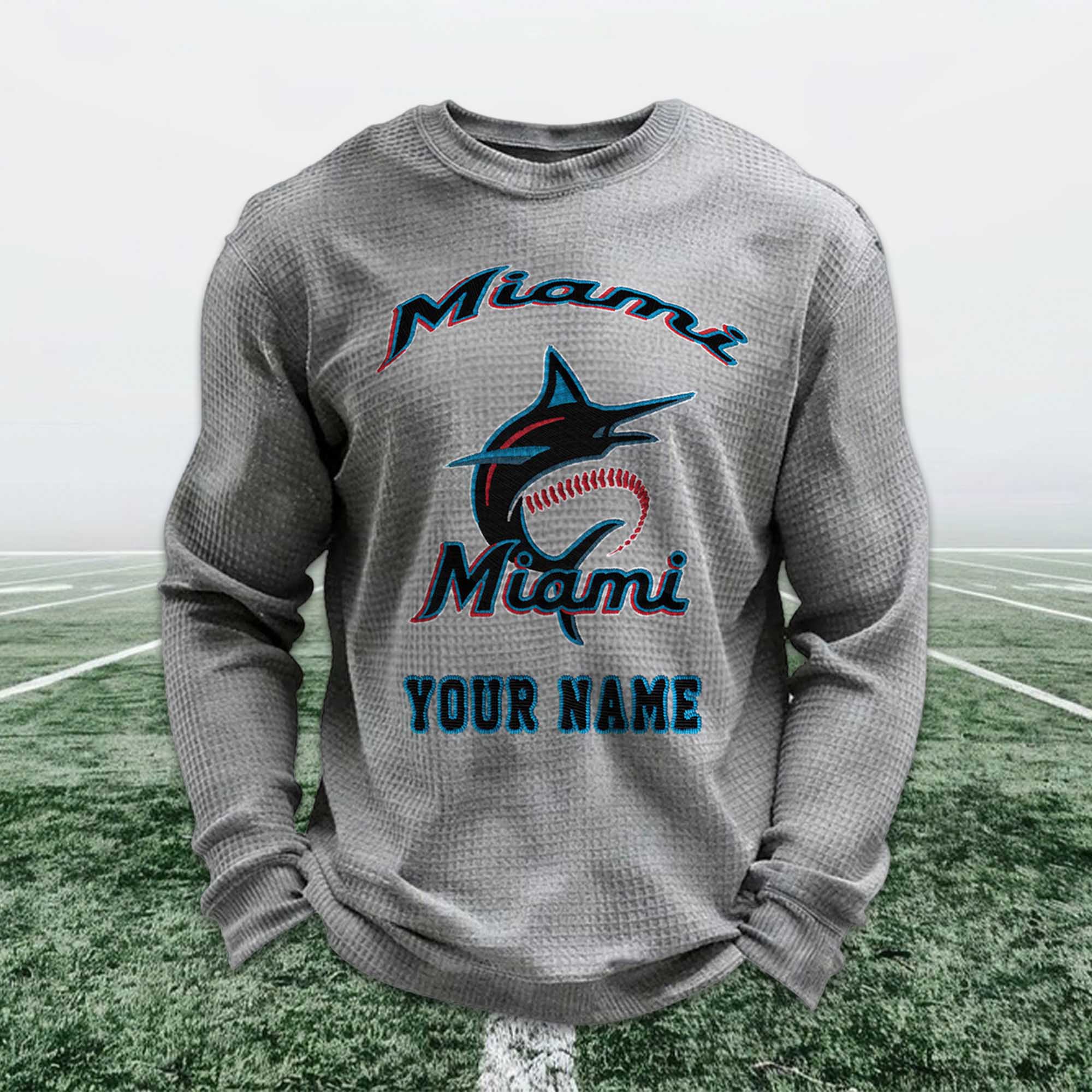 Personalized Miami Baseball Waffle Sweatshirt are designed for fans who love to express their Miami pride in a simple, personal way. With its clean look, bold baseball graphics, and your name printed directly on the front, this sweatshirt offers a familiar, comfortable, and easy-to-wear feel for any occasion from game day to casual outings.