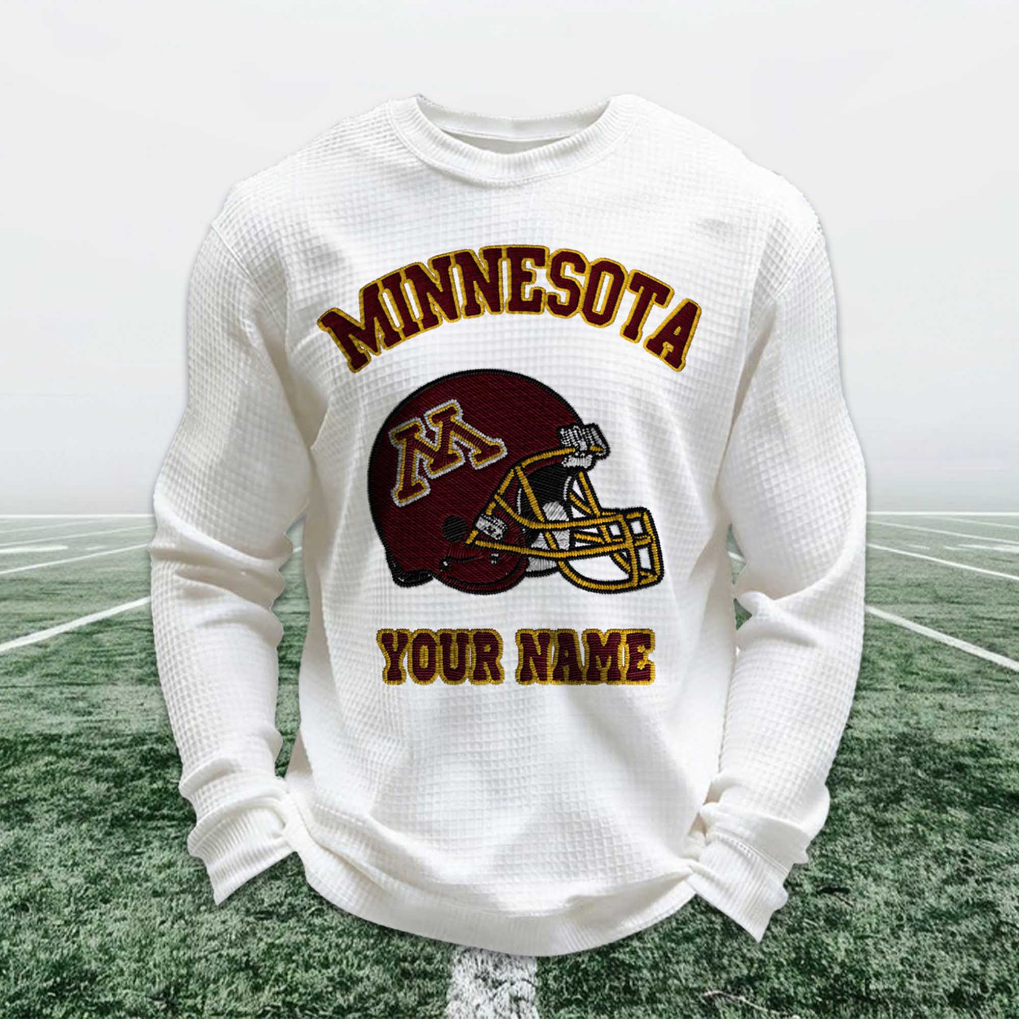 The sweatshirt features a pristine white fabric with a waffle pattern highlighting the Minnesota football helmet in the center. The team name is curved for a classic college feel, while the individual name below creates a strong personal connection. Long sleeves, ribbed cuffs, and a loose, unisex fit provide everyday comfort and ease of movement. The waffle weave adds a subtle texture, making the sweatshirt both stylish and practical for casual wear or competition attire.