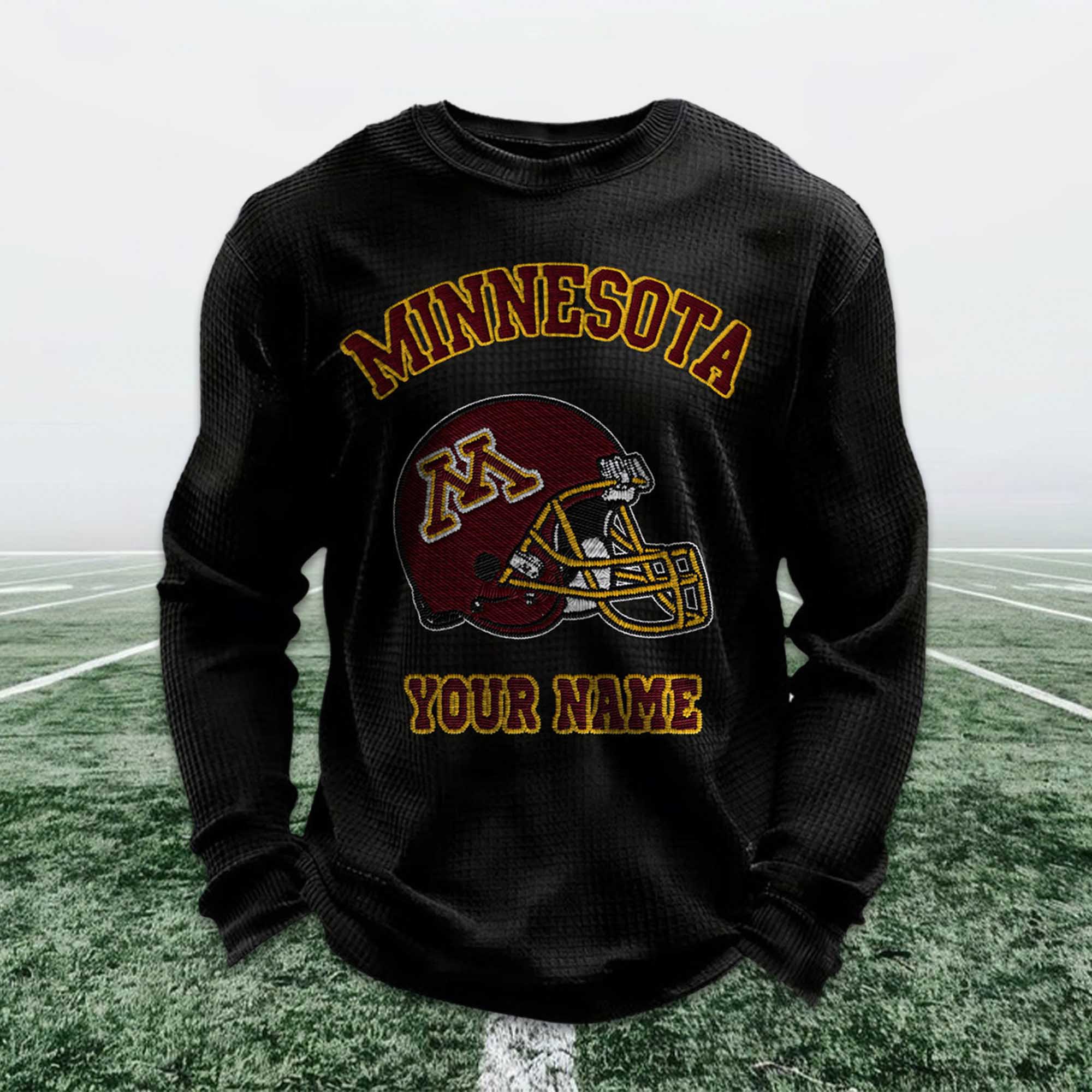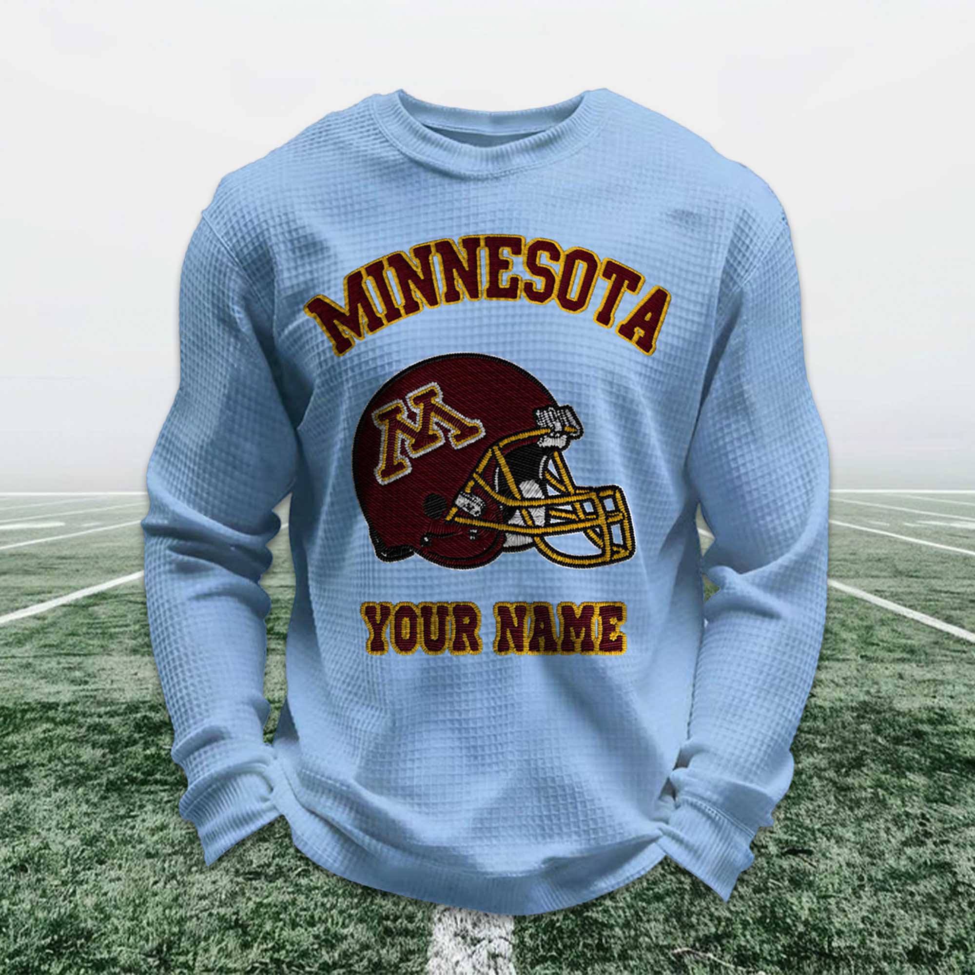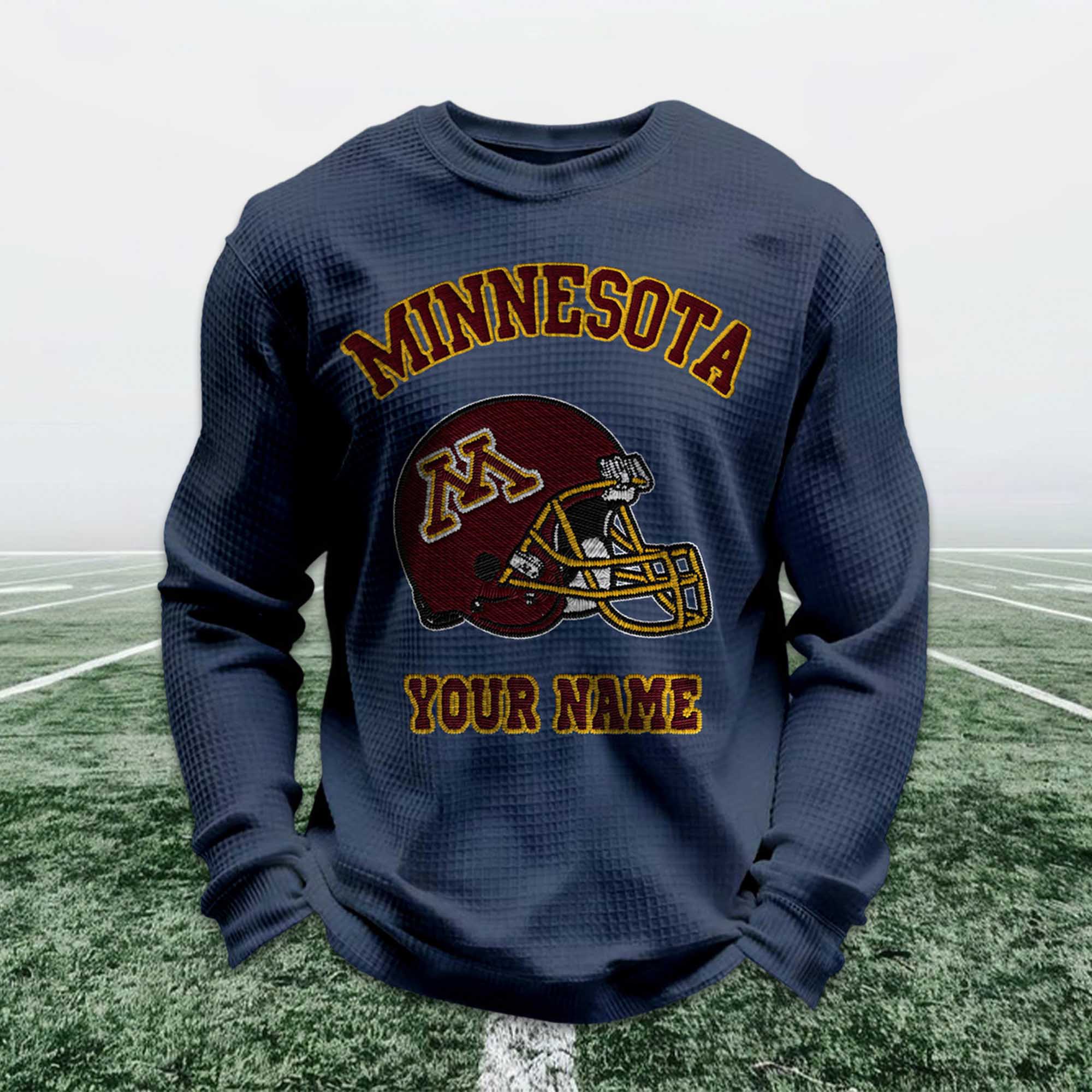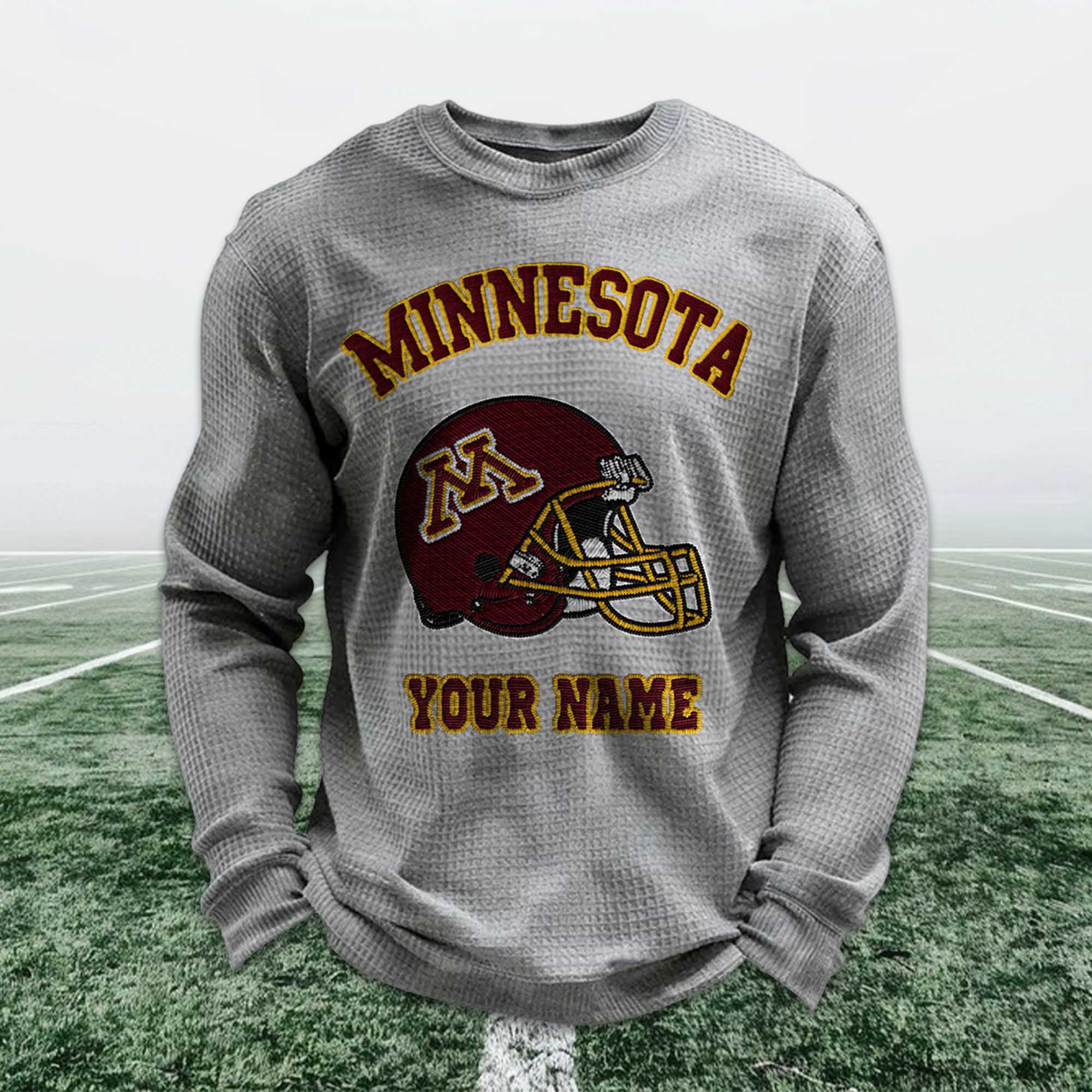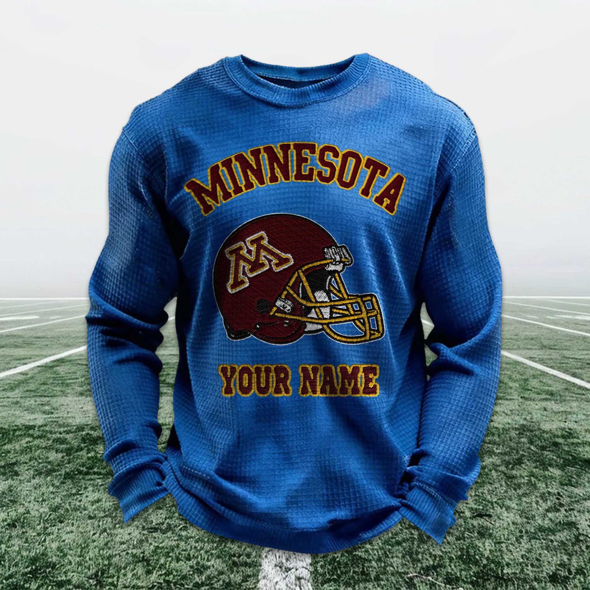 The Personalized Minnesota Football Waffle Sweatshirt is a great choice for fans who want to show their pride in their team in a comfortable and personalized way. Inspired by classic Minnesota soccer colors, this sweatshirt features a striking helmet image and customizable name details, making each one special. It naturally complements matchday attire or a relaxed, everyday style.