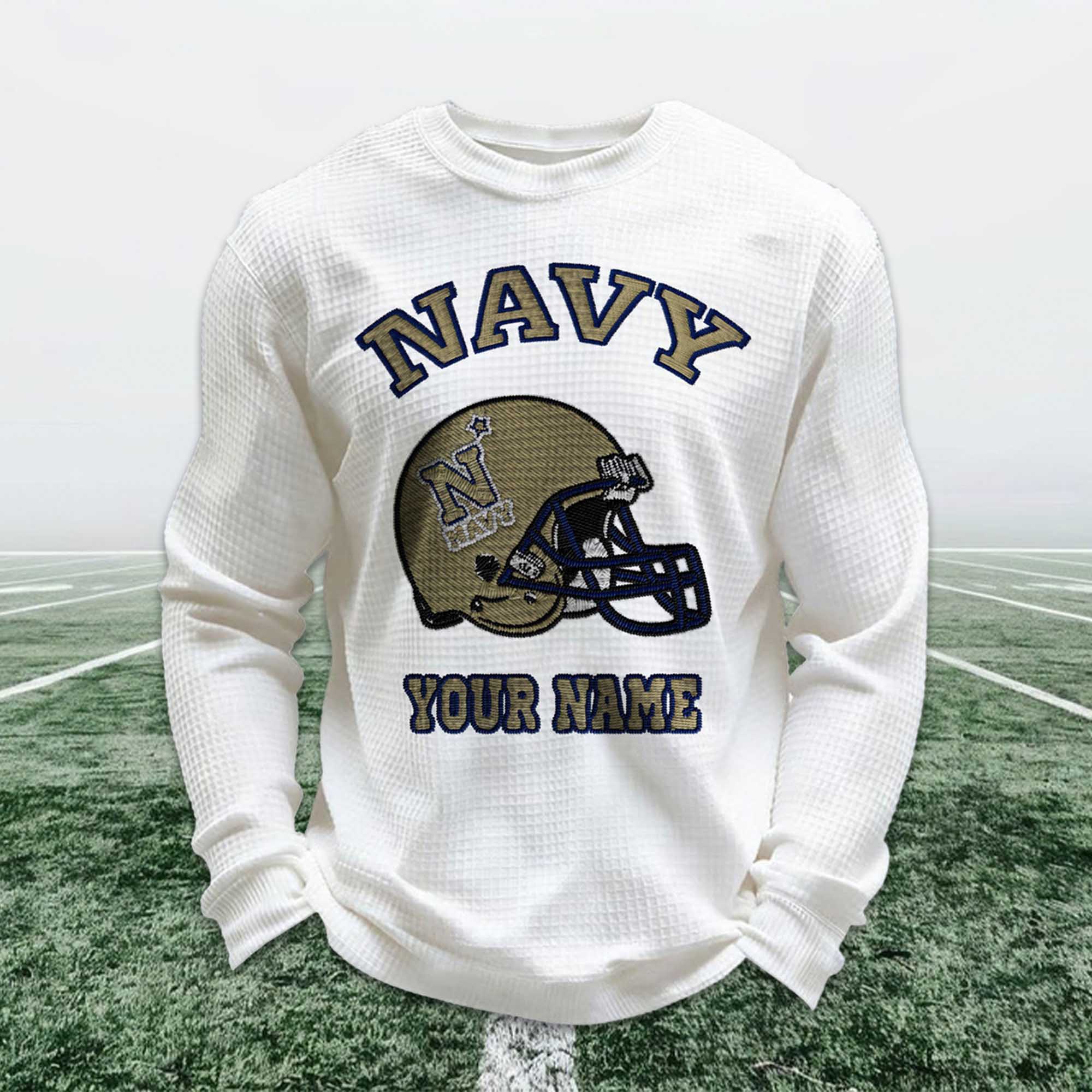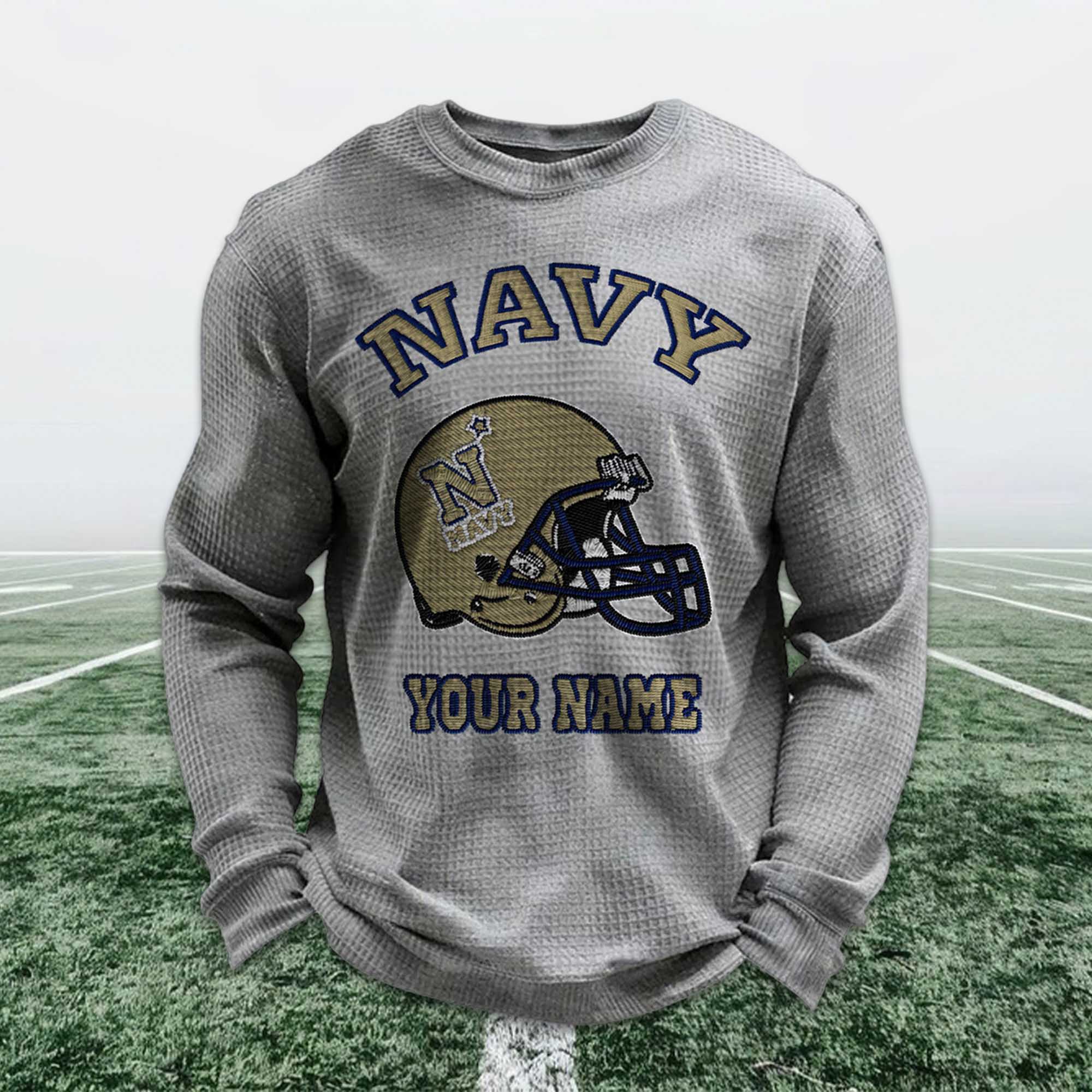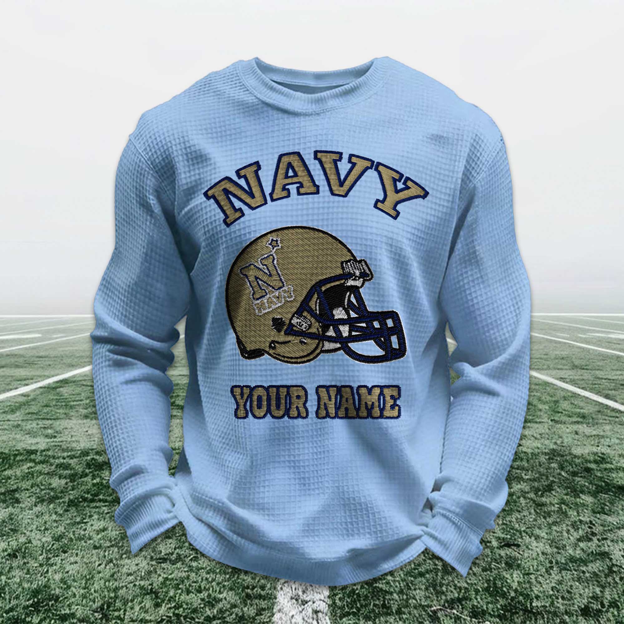 The Personalized Navy Football Waffle Sweatshirt is designed for fans who want comfort, style, and a personal connection to the sport. Featuring a striking navy blue soccer helmet and your chosen name prominently displayed, this sweatshirt blends school spirit and individuality. It’s a great choice for game days, relaxing weekends, or after-workouts.