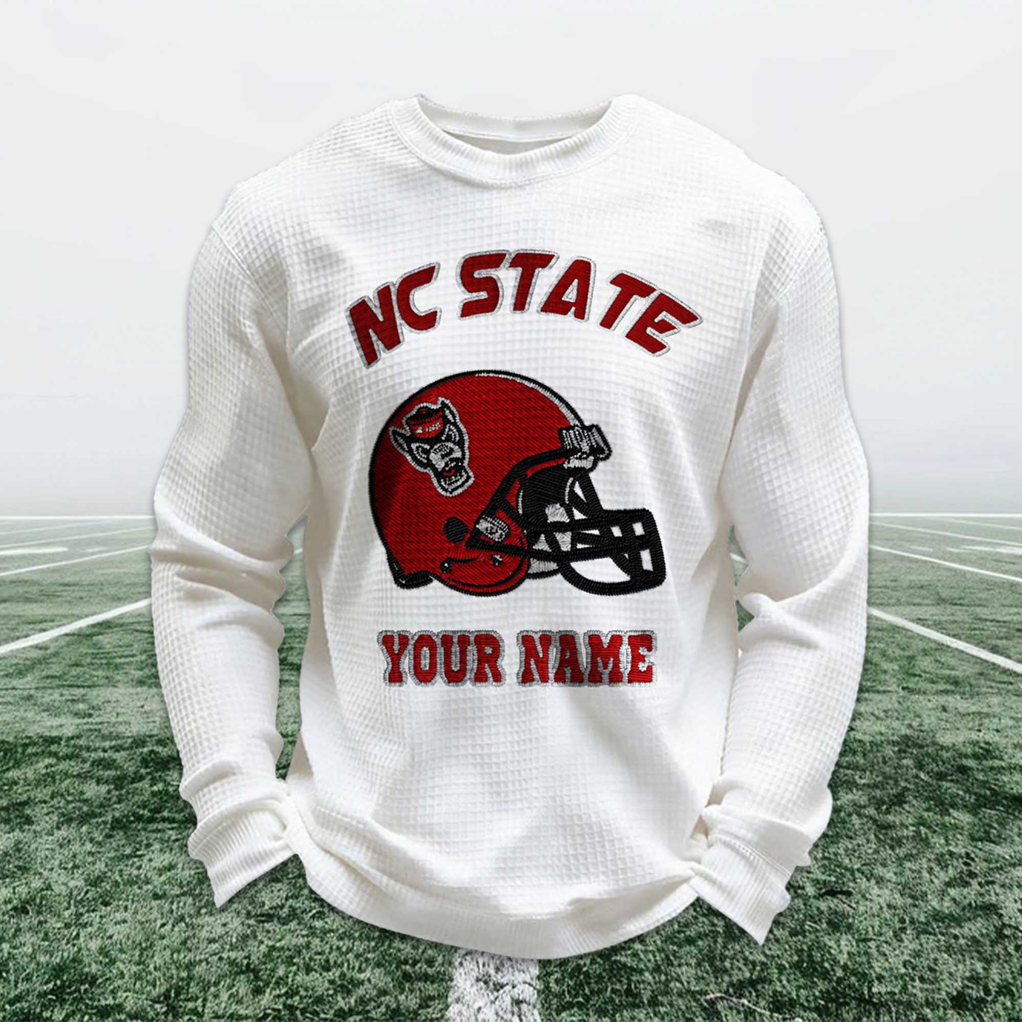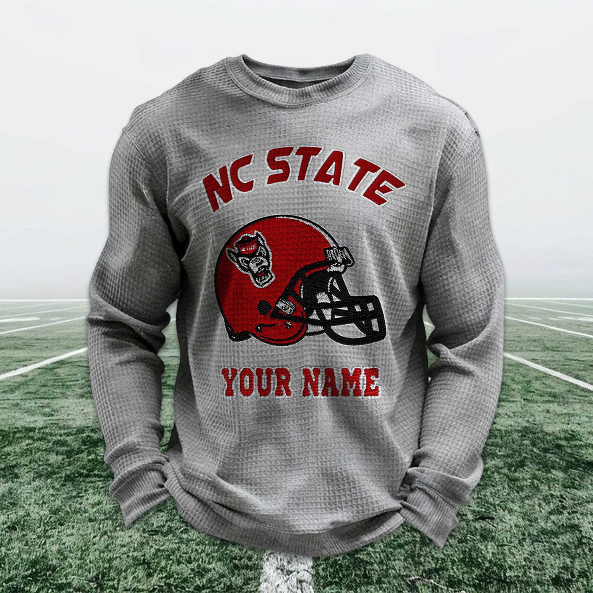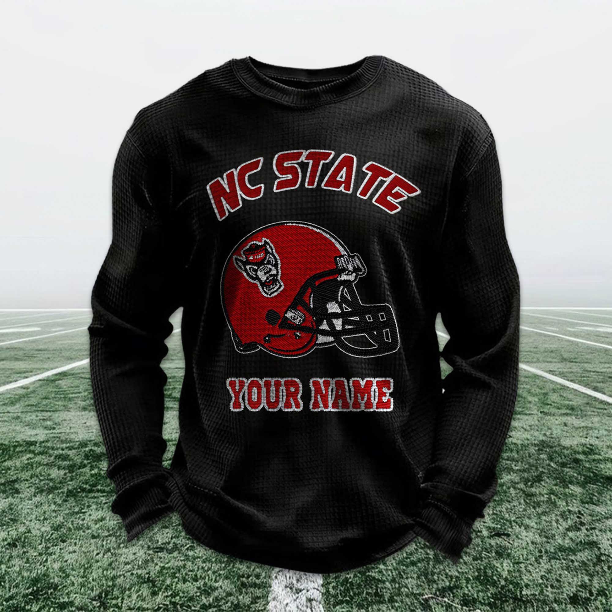 Personalized college football apparel continues to garner attention as fans seek ways to express their pride in their school in a personal way. The Personalized NC State Football Waffle Sweatshirt stands out in 2026 thanks to its fresh color palette, classic helmet imagery, and custom name details. Fans value comfort and individuality, and this sweatshirt combines both in an easy-to-wear style.