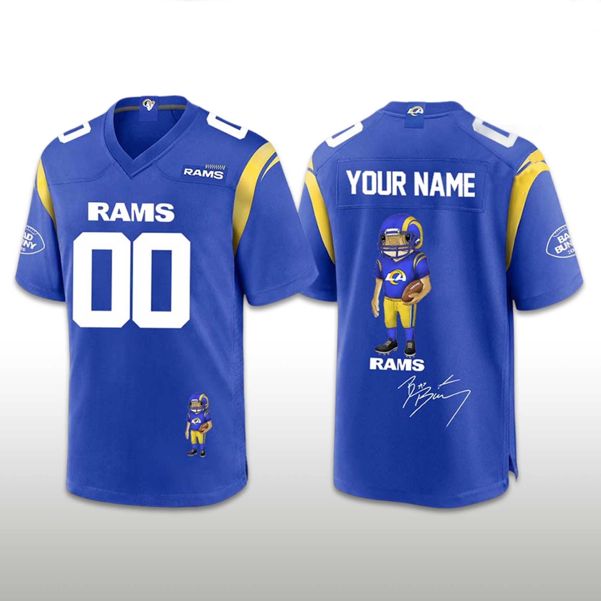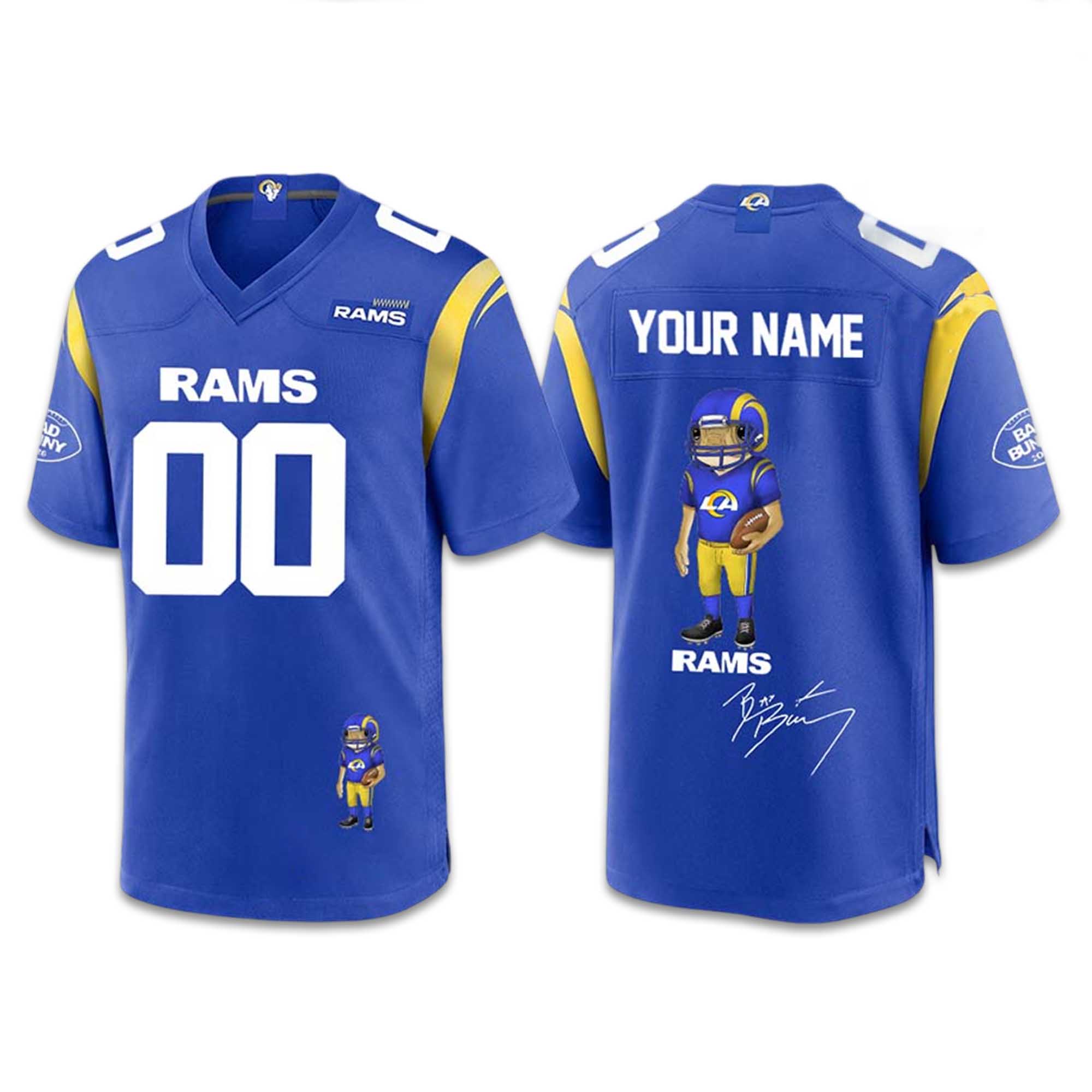 The Personalized Rams Bad Bunny Super Bowl 2026 Concho Football Jersey delivers a vibrant and confident look. The deep blue background instantly showcases Rams tradition, while the front number maintains a classic style. The back features your custom name along with a fun character illustration, adding personality and modern street style energy. This jersey is perfect for Super Bowl celebrations, game shows, and everyday fan wear.