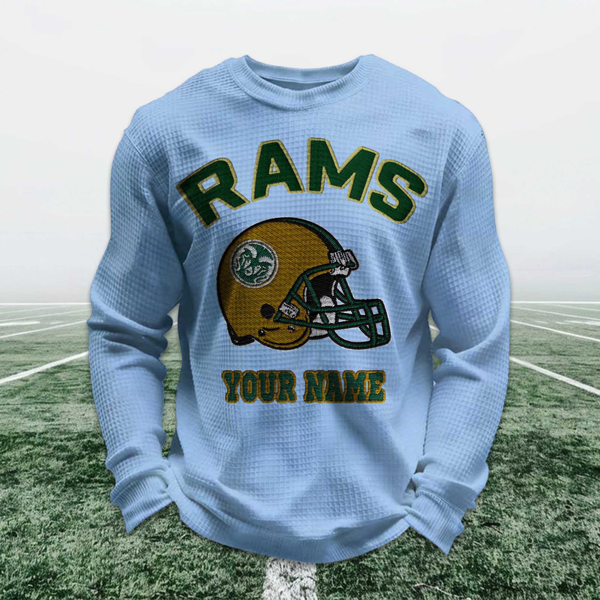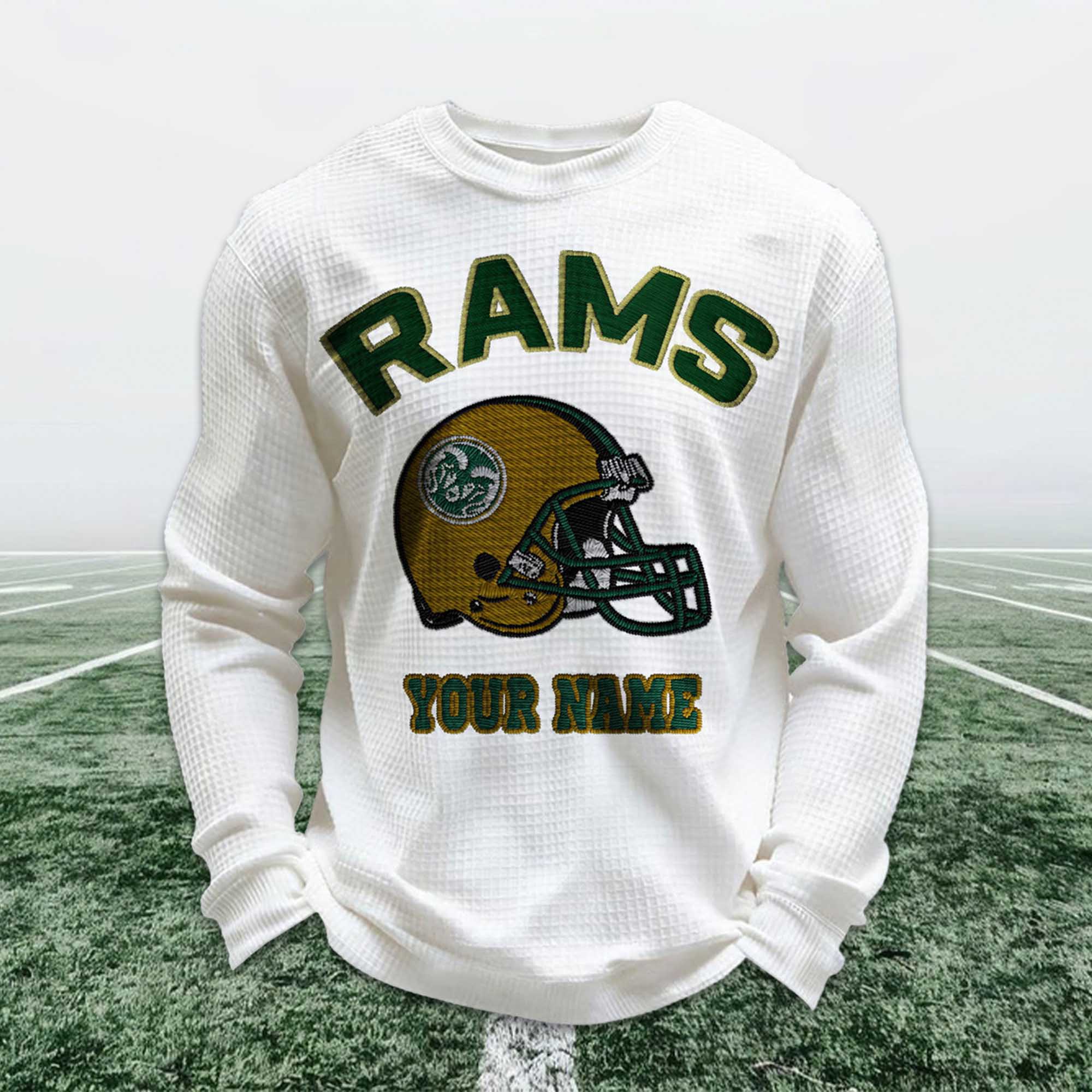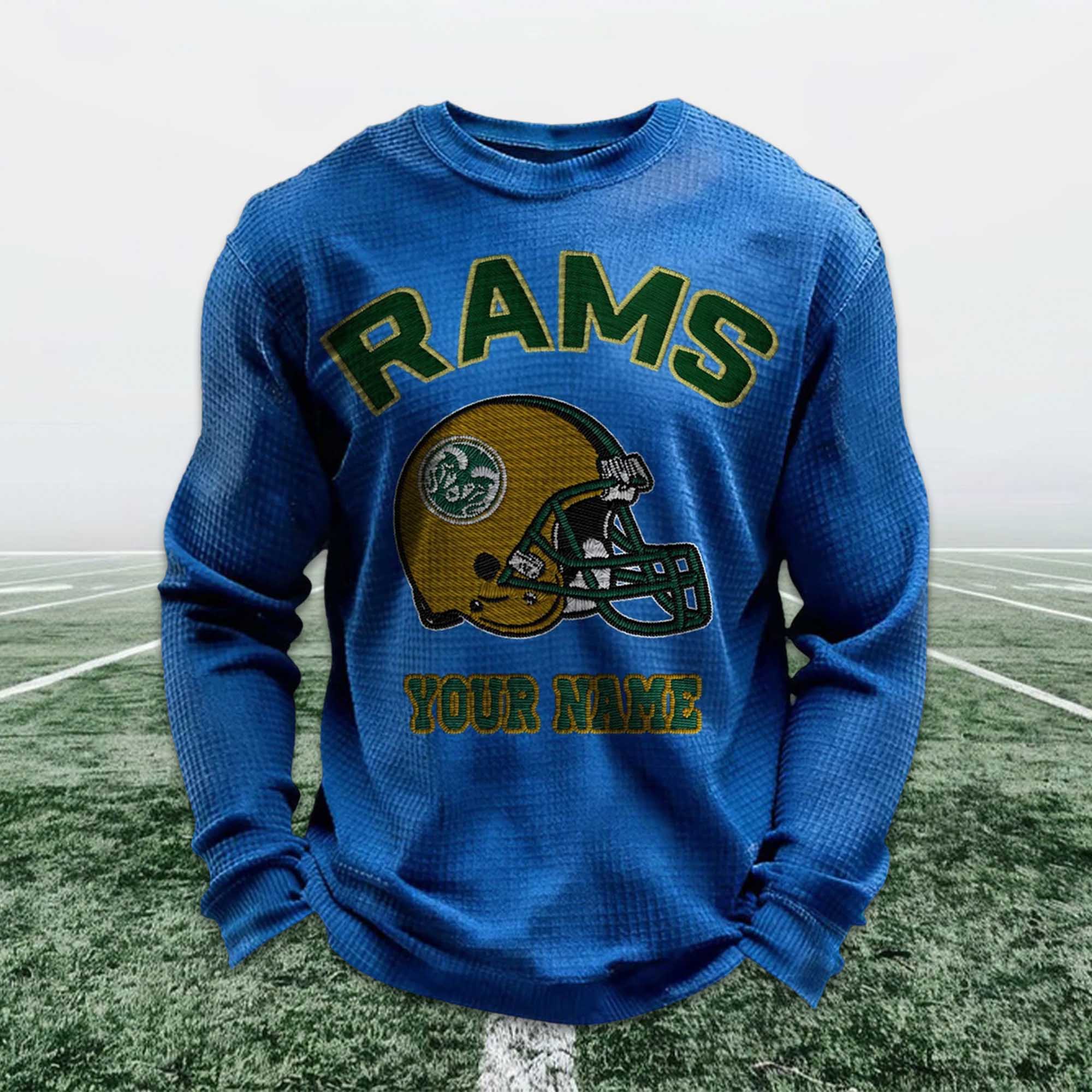 The Personalized Rams Football Waffle Sweatshirt features a clean white background with a striking Rams soccer helmet image and classic lettering. The waffle weave makes the sweatshirt breathable yet warm. Adding your name below the design creates a strong personal connection, making this sweatshirt special every time you wear it. The balance of comfort, style, and customization makes it a popular choice for everyday wear.