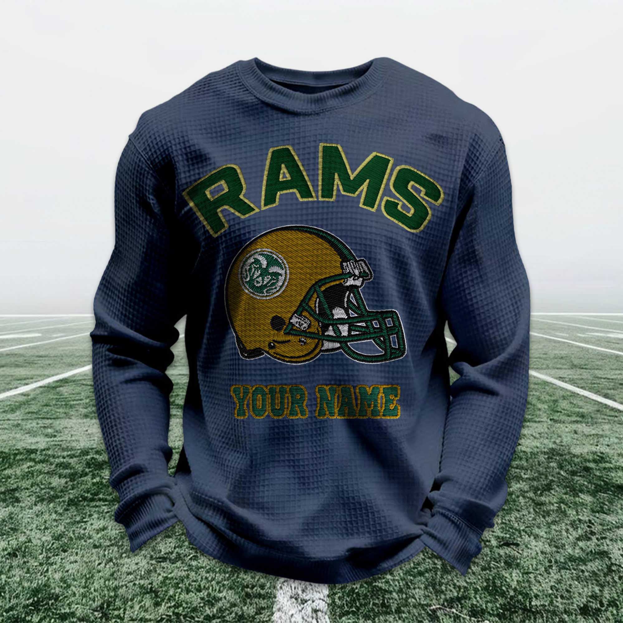 The waffle knit fabric gives the sweatshirt a unique look and a soft feel against the skin. The Rams helmet image stands out clearly without being overly flashy. Ribbed cuffs and hem help the sweatshirt maintain its shape, while the high-quality print remains sharp after multiple washes. The custom name detail adds personality and makes the sweatshirt truly yours.
