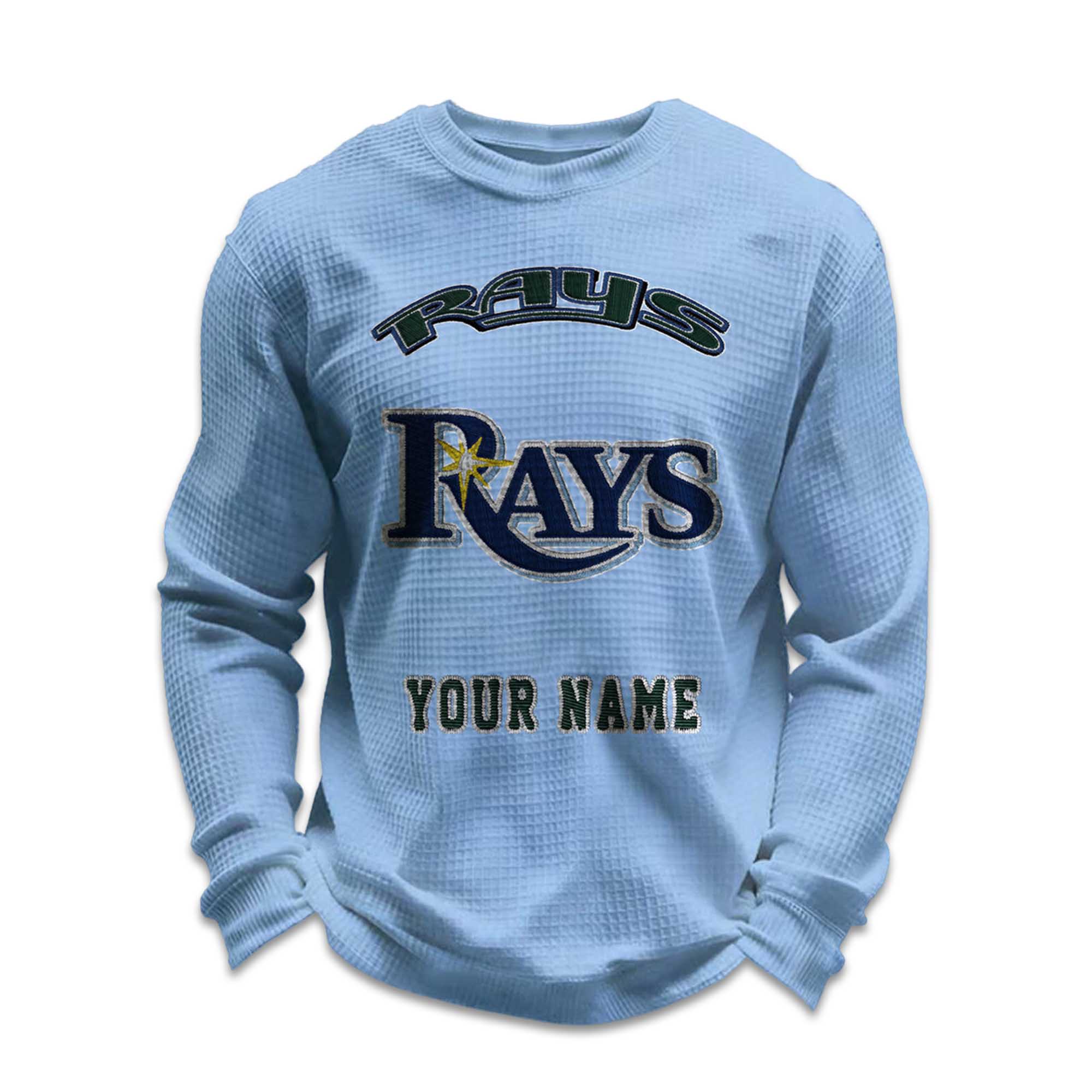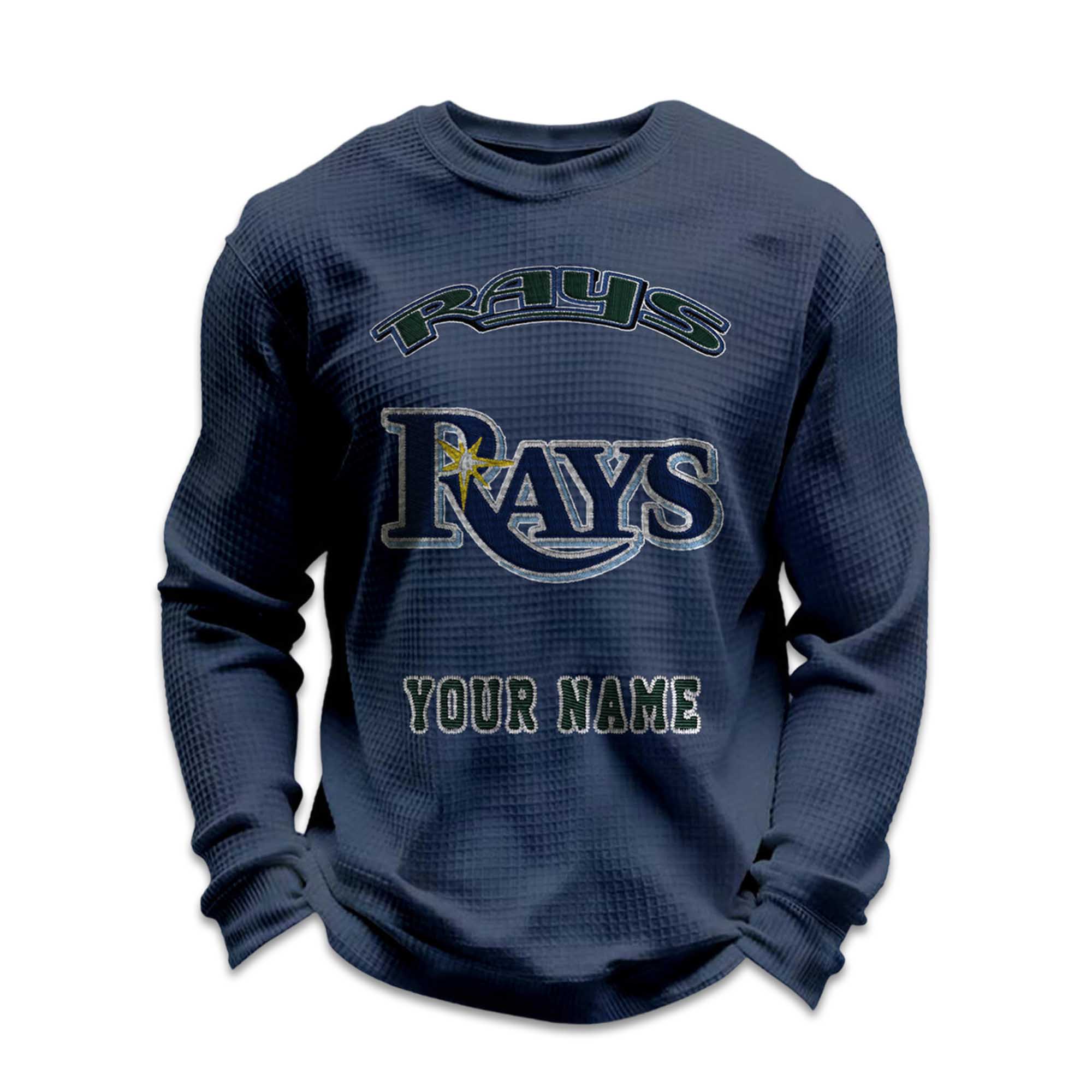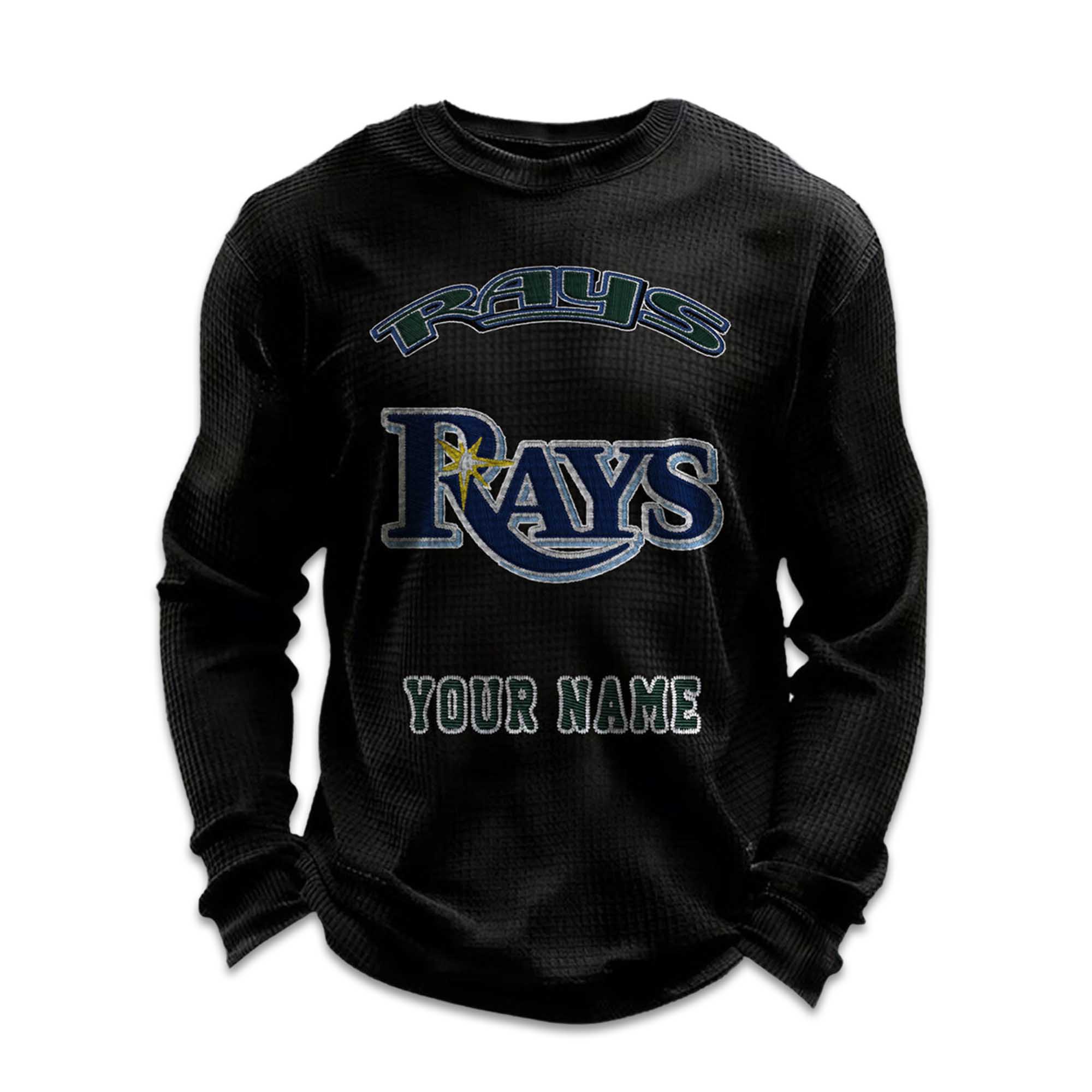 The waffle knit fabric provides warmth without being heavy. Ribbed cuffs and hem maintain the shirt’s shape while allowing for easy movement. The clean and balanced front graphic keeps the Rays-inspired style prominent without being overly elaborate. The personalization is seamlessly integrated, making the name feel like an integral part of the original design, not an added detail.