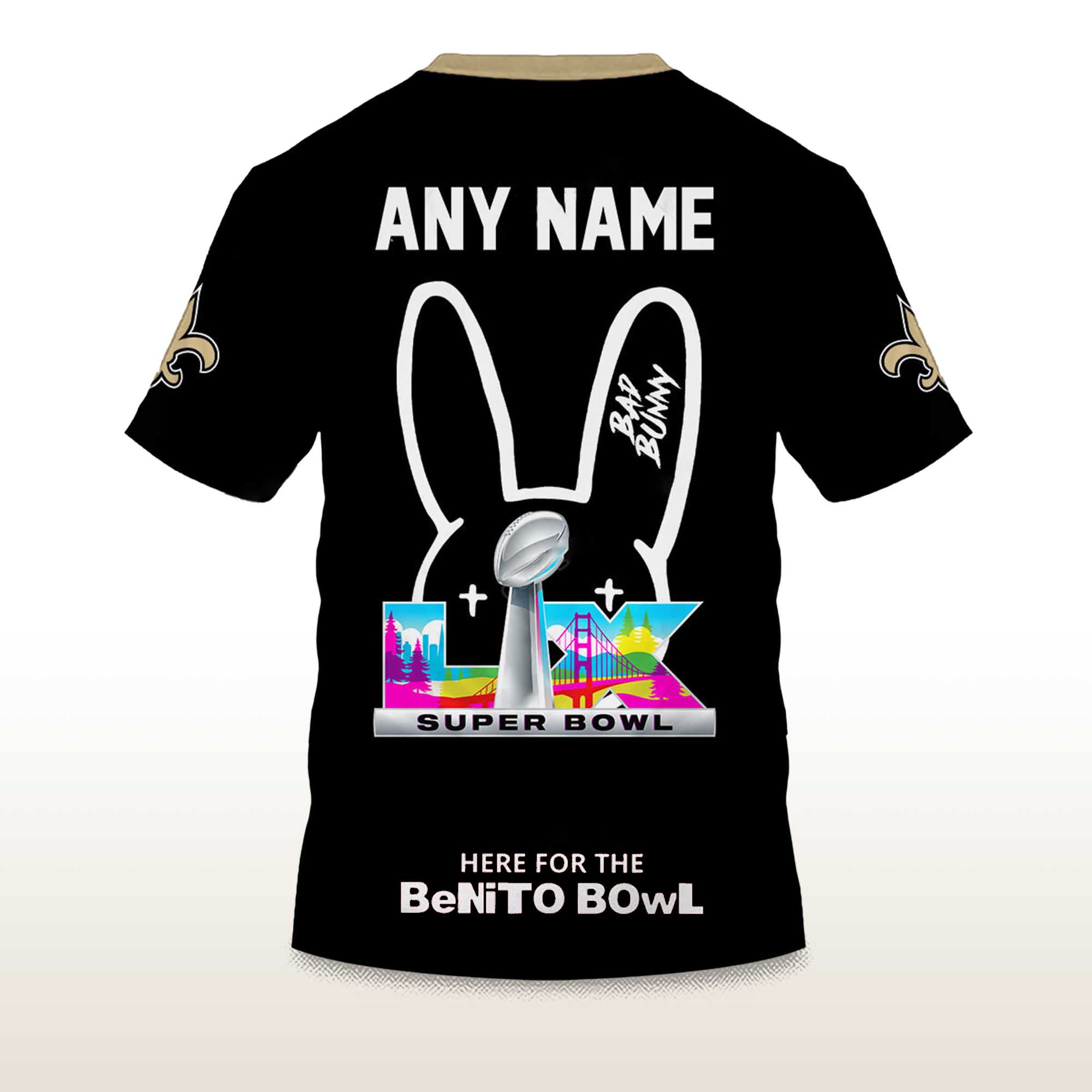 The Personalized Saints Bad Bunny Bowl LX 2025 2026 Shirt combines New Orleans pride with modern fan style. With the growing excitement of Bowl LX, this tee features a sophisticated black and gold color scheme, expressive character graphics, and sporty shoulder accents, bringing a playful, modern feel to today’s fan.