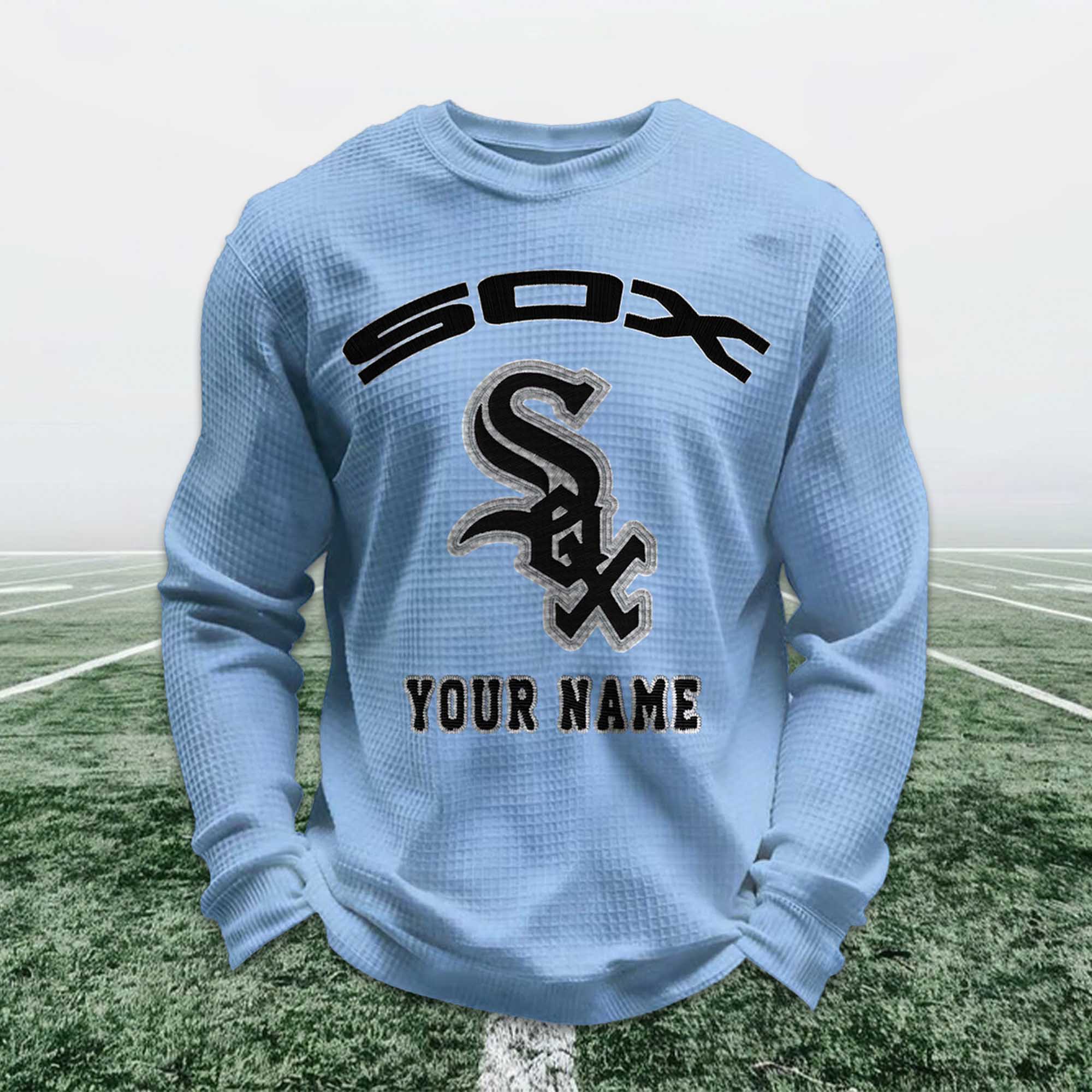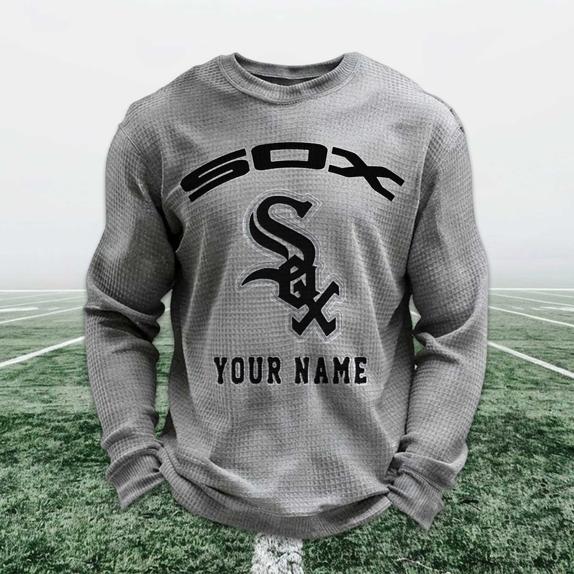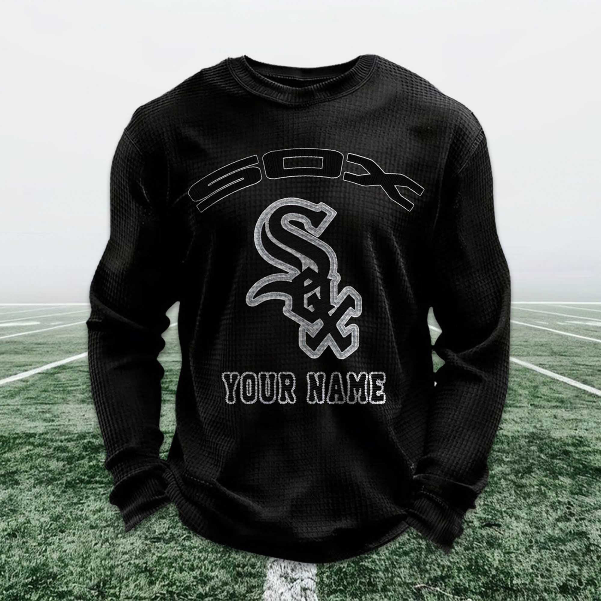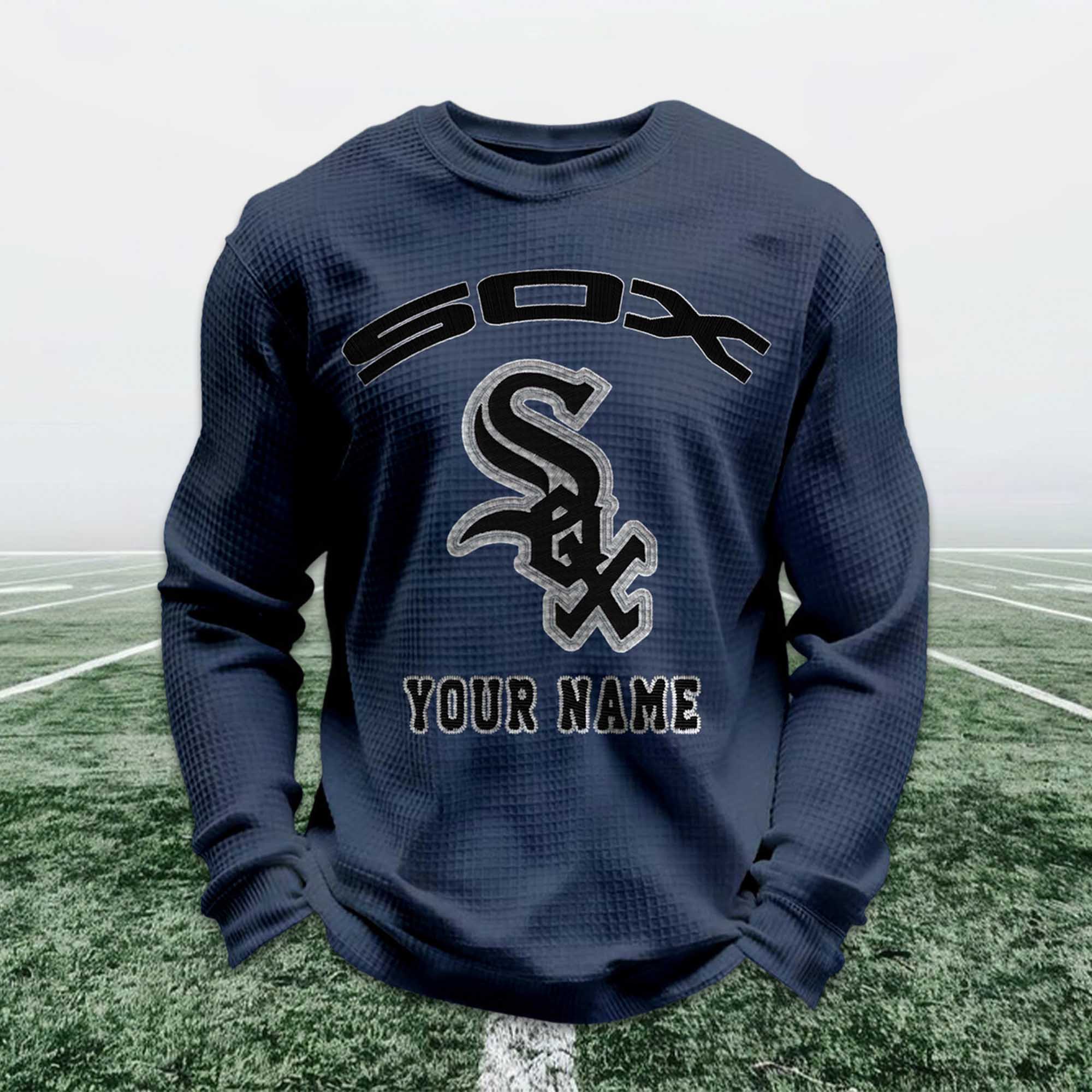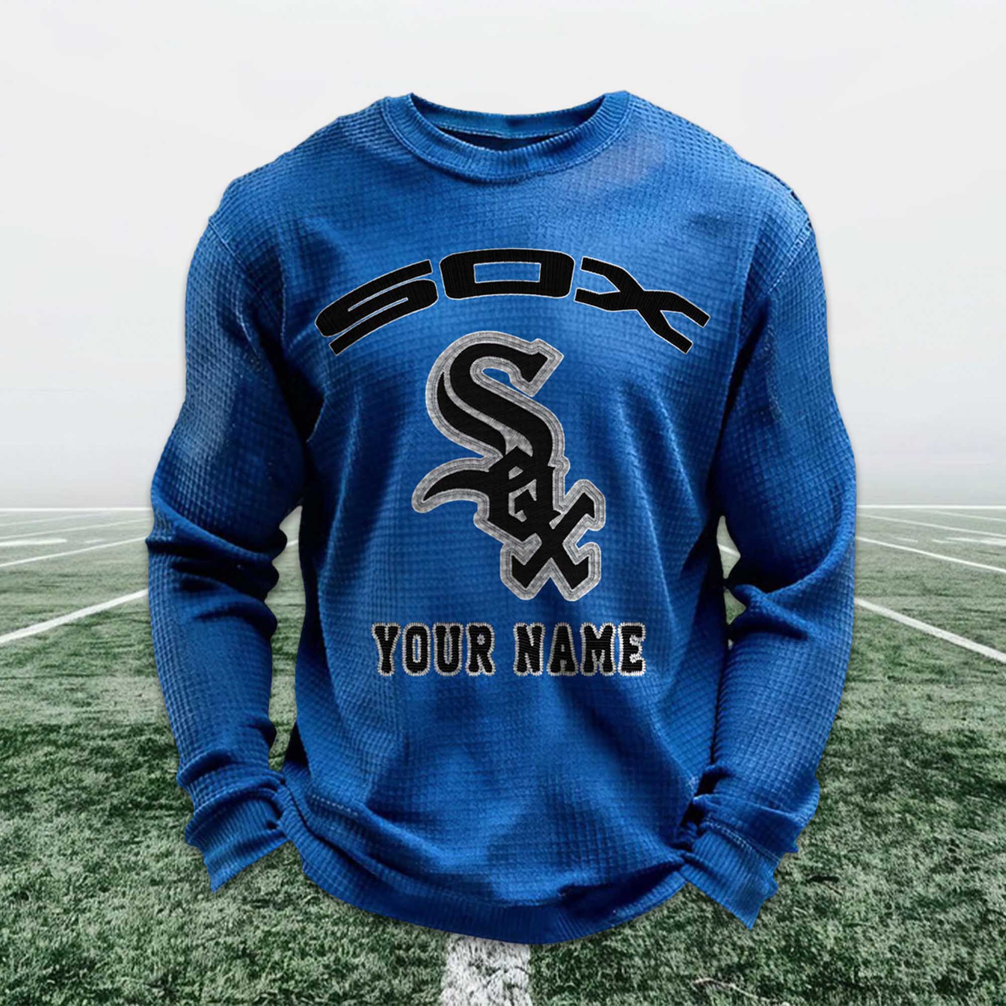 This sweatshirt is made from breathable waffle knit fabric, offering multi-season comfort. The striking design on the front features a Sox-inspired logo, combined with a custom name placed underneath for a clean and balanced layout. The fabric keeps you warm without feeling heavy, while the relaxed fit allows for easy movement. Suitable for everyday wear, casual outings, or long cheering sessions in the stands.