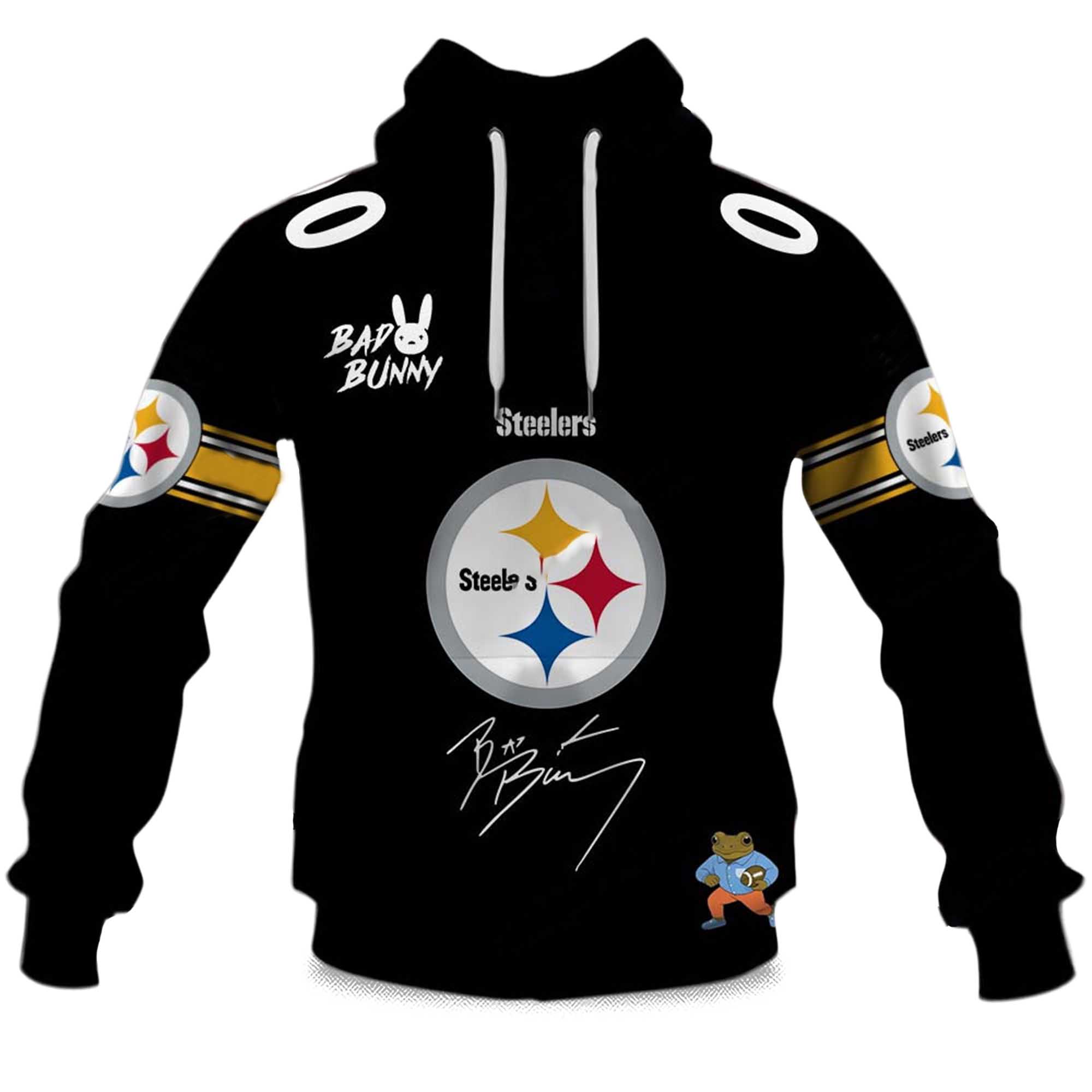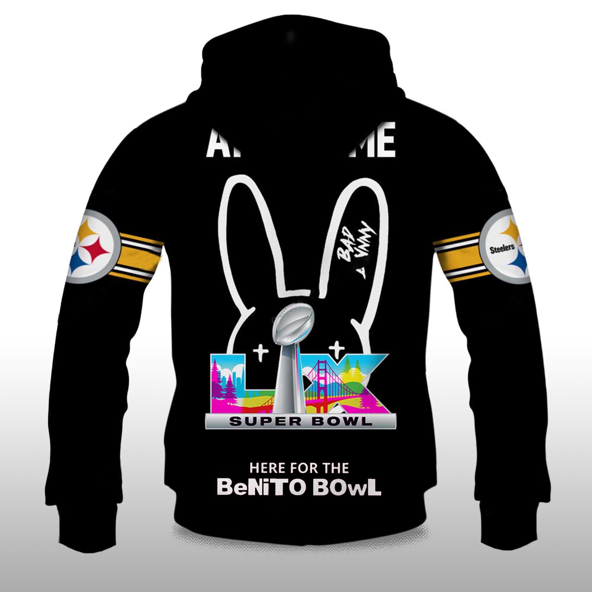 The Personalized Steelers Bad Bunny Bowl LX 2025 2026 Hoodie offers a bold blend of Pittsburgh pride and modern fan creativity. With the excitement of Bowl LX building, this hoodie features sharp color contrast, vibrant graphics, and a playful twist, perfect for fans looking to add personality to their game-day attire.