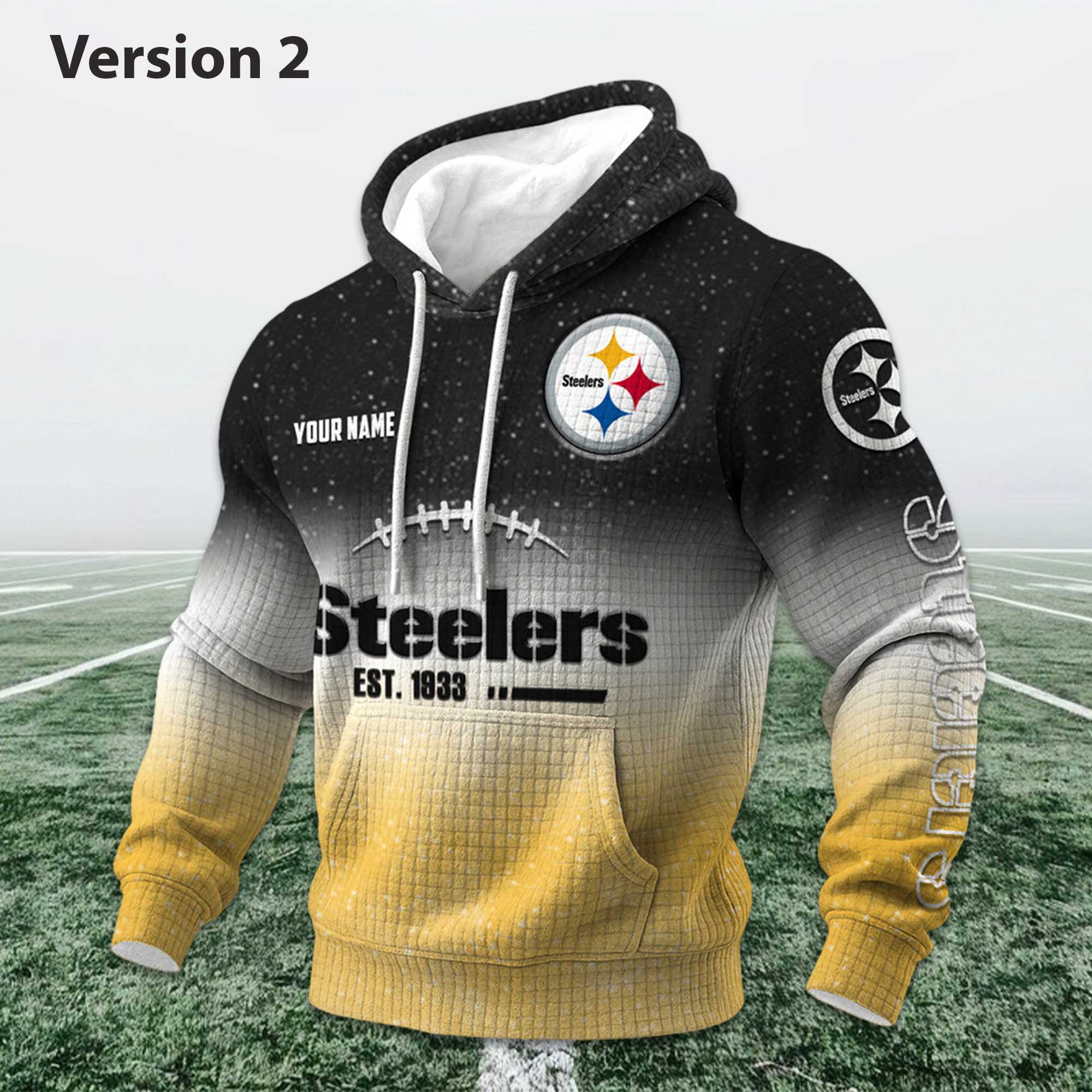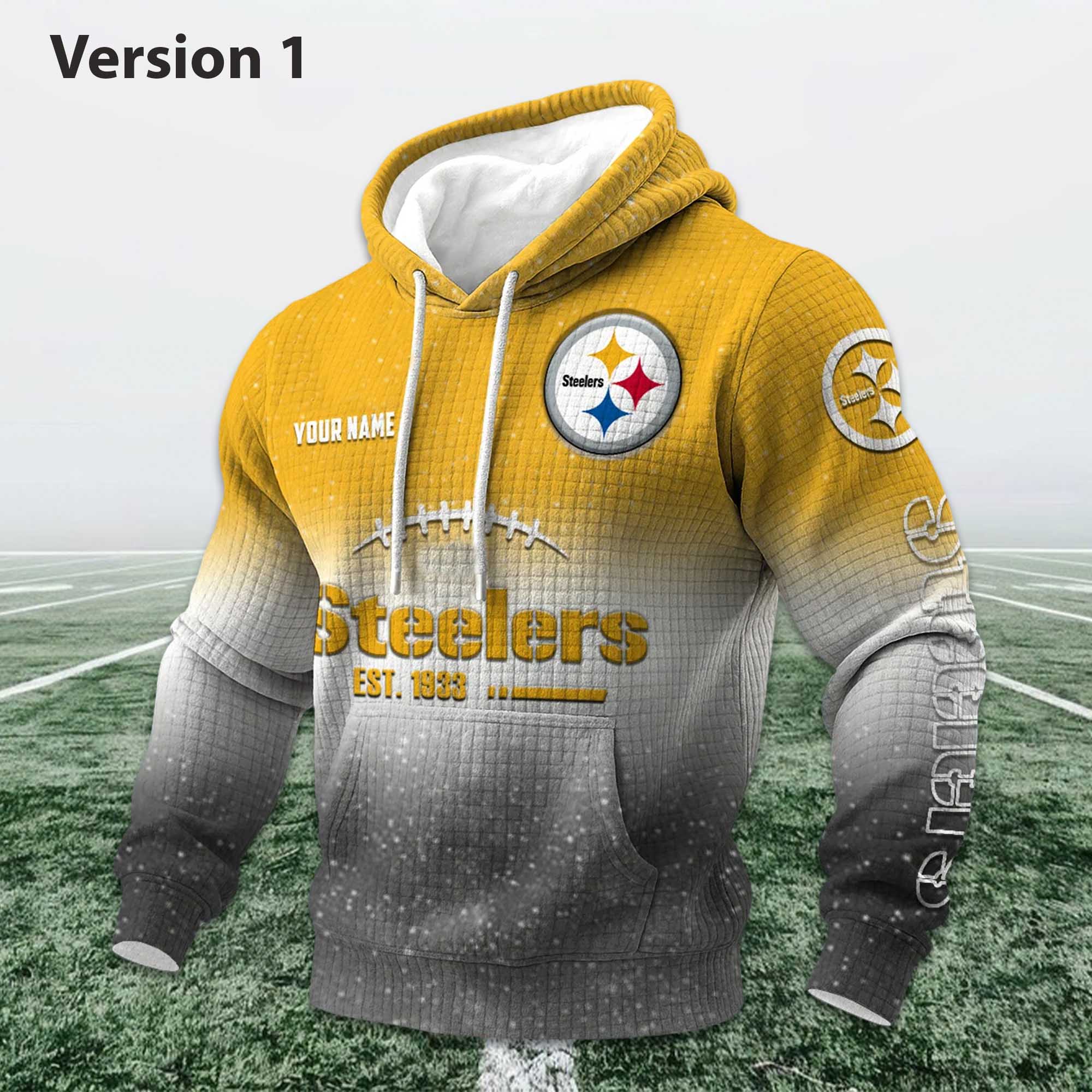 This hoodie features a smooth color transition from yellow to grey, inspired by the Steelers’ colors and stadium energy. The waffle-textured surface adds visual depth while maintaining a soft, comfortable feel. The logo placement is well-chosen, and the sleeve imagery and typography are clear. Creating a balanced, striking design that isn’t overly flashy, easy to wear on many occasions.