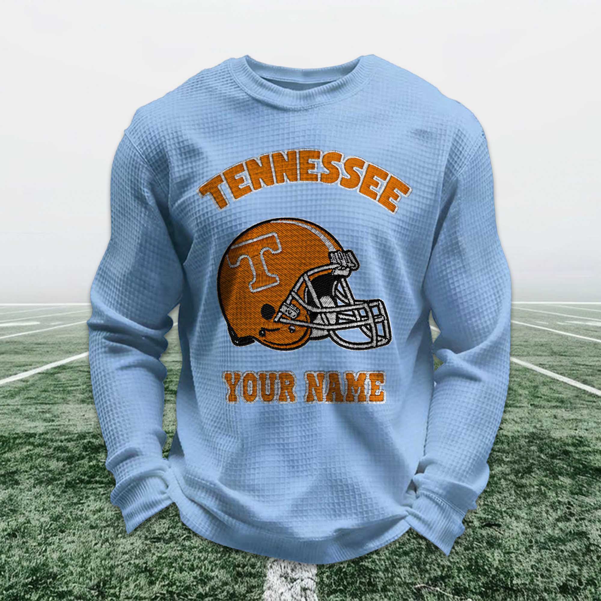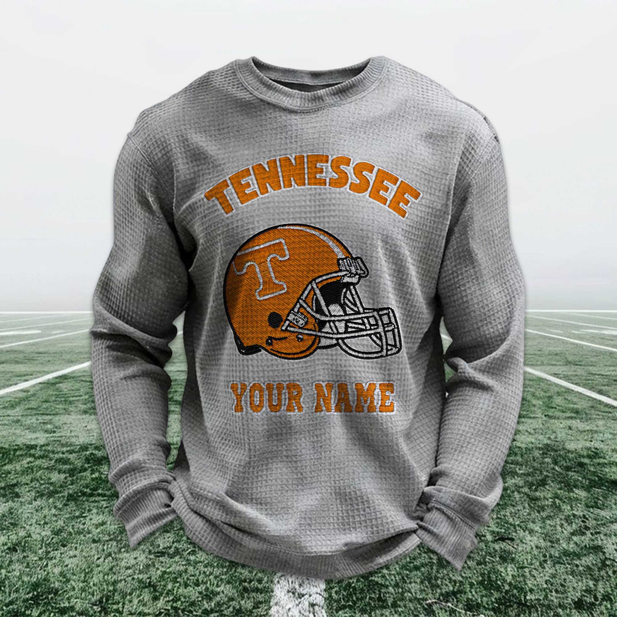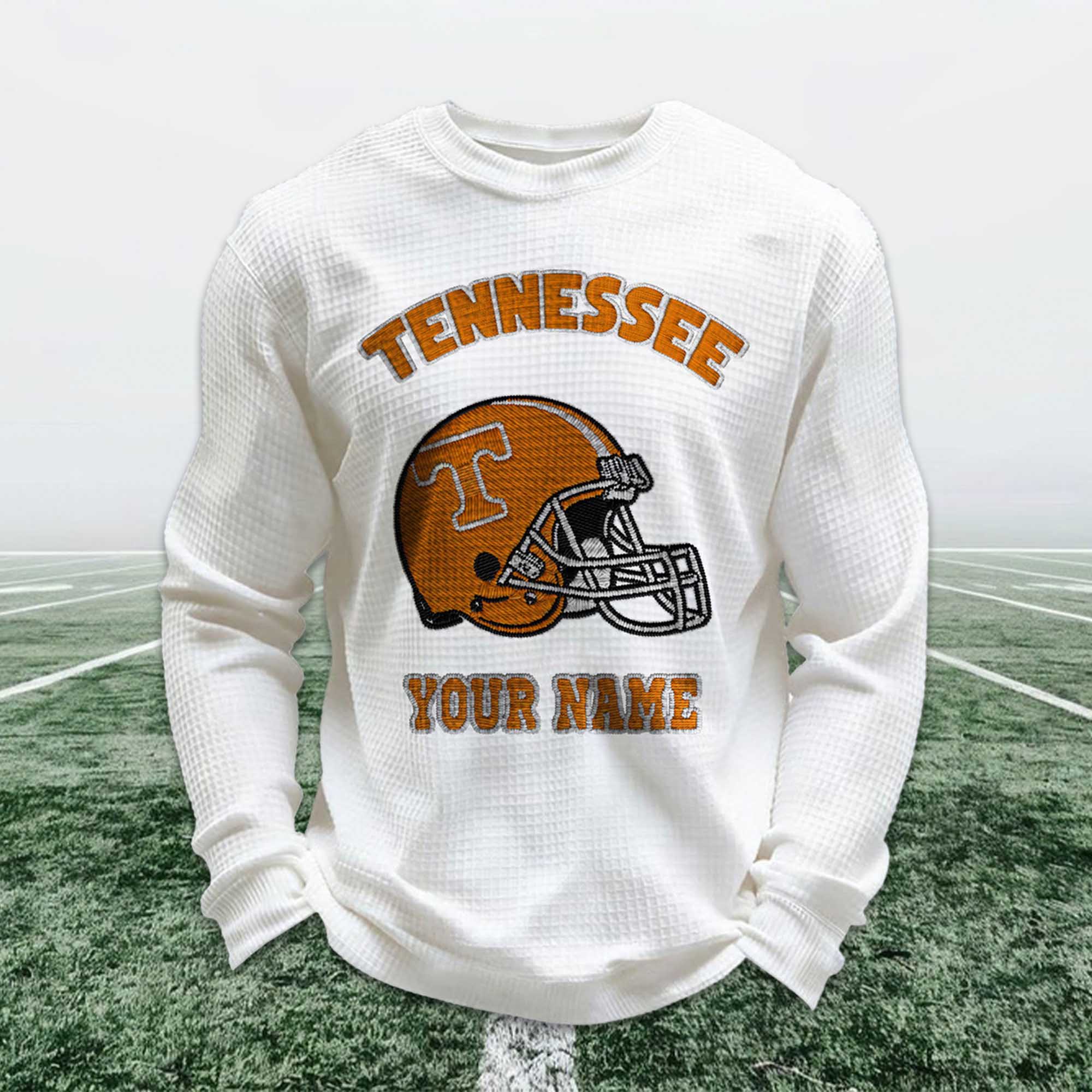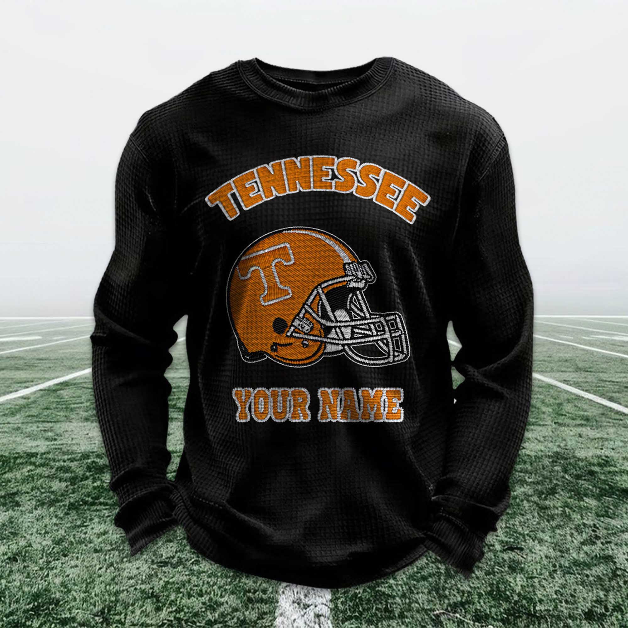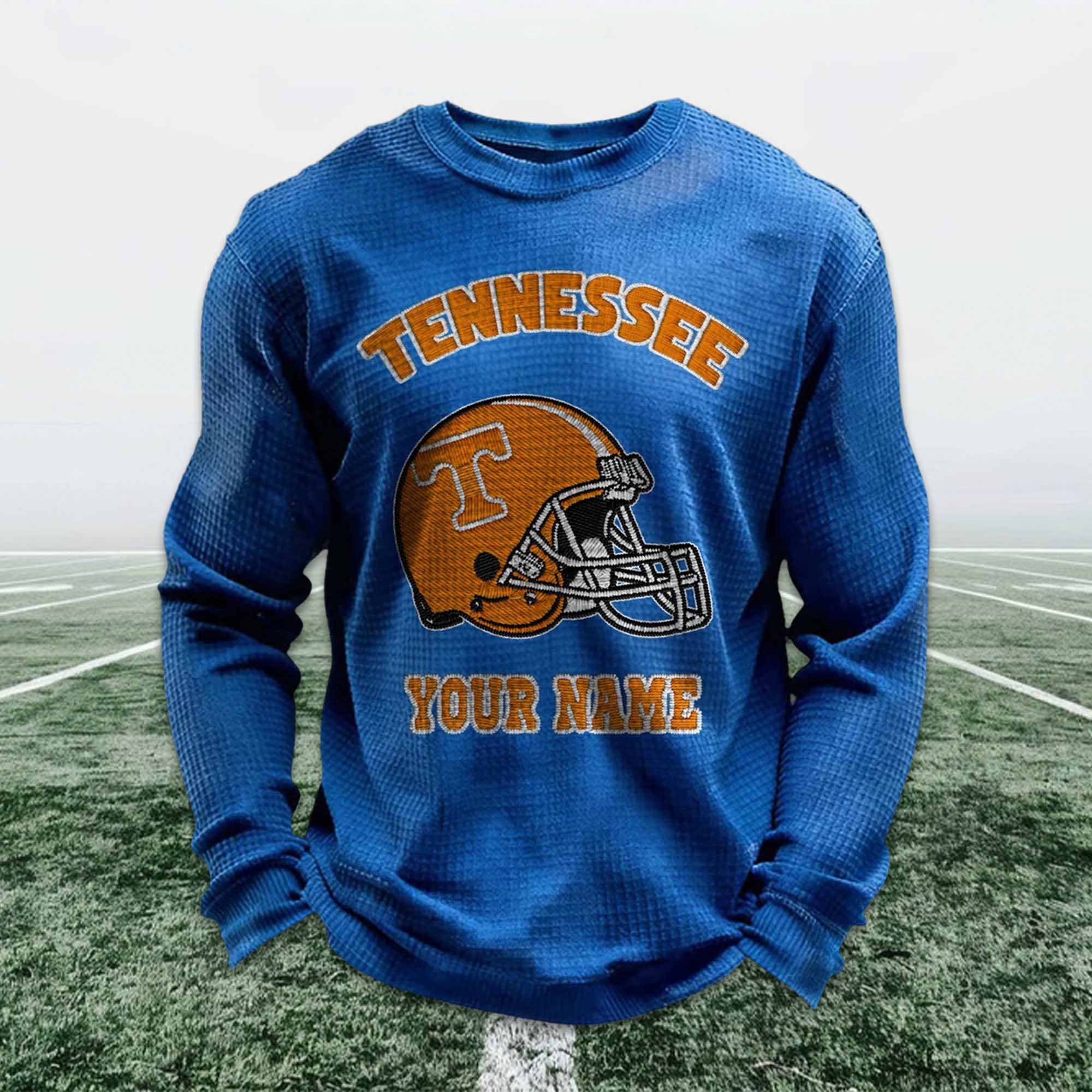 Personalized fan apparel is becoming a strong trend among Tennessee football supporters, and the Personalized Tennessee Football Waffle Sweatshirt perfectly fits this trend. Fans today want apparel that is individual, not generic. Adding a custom name alongside the iconic Tennessee football helmet allows fans to express their pride in a unique, meaningful way that connects with their football tradition.