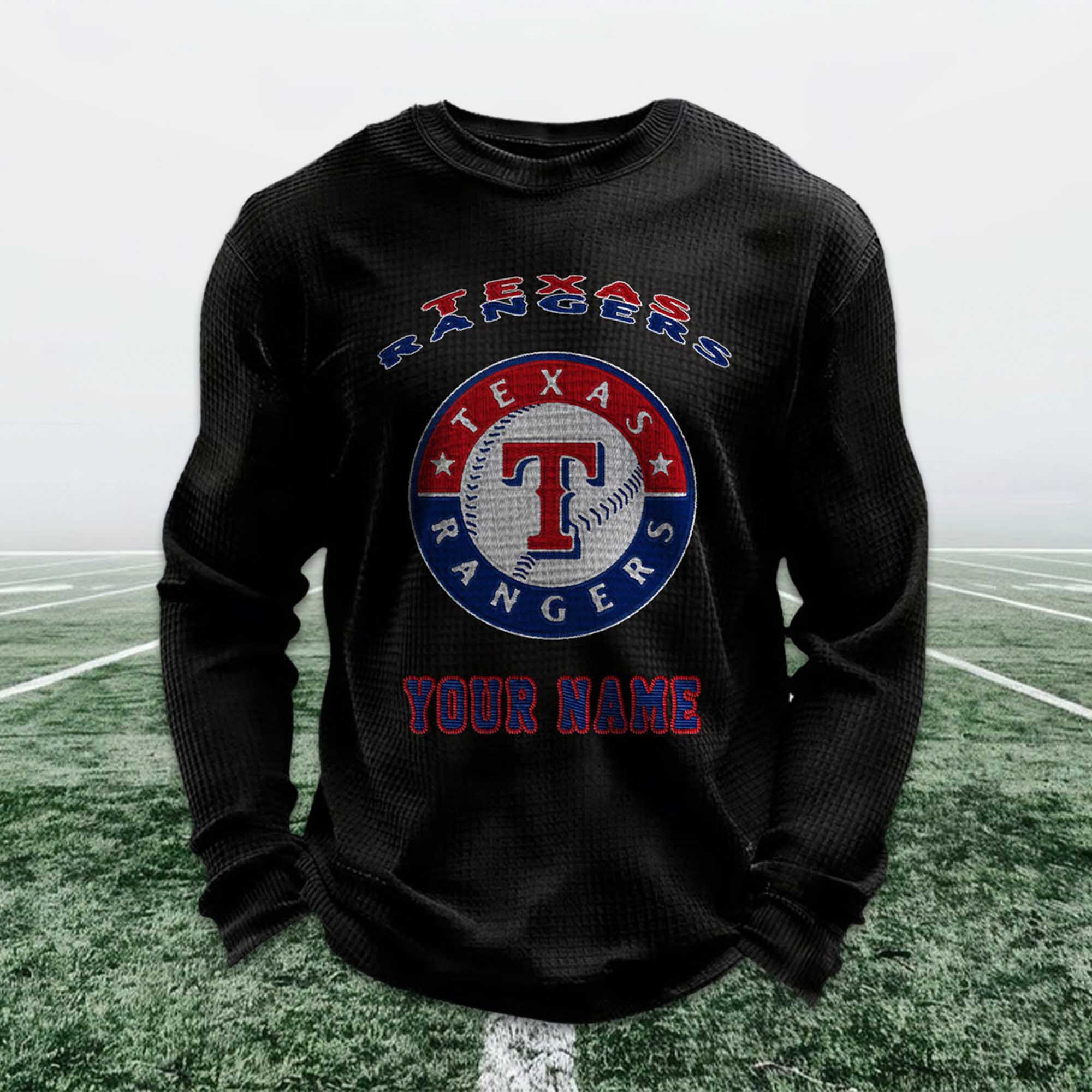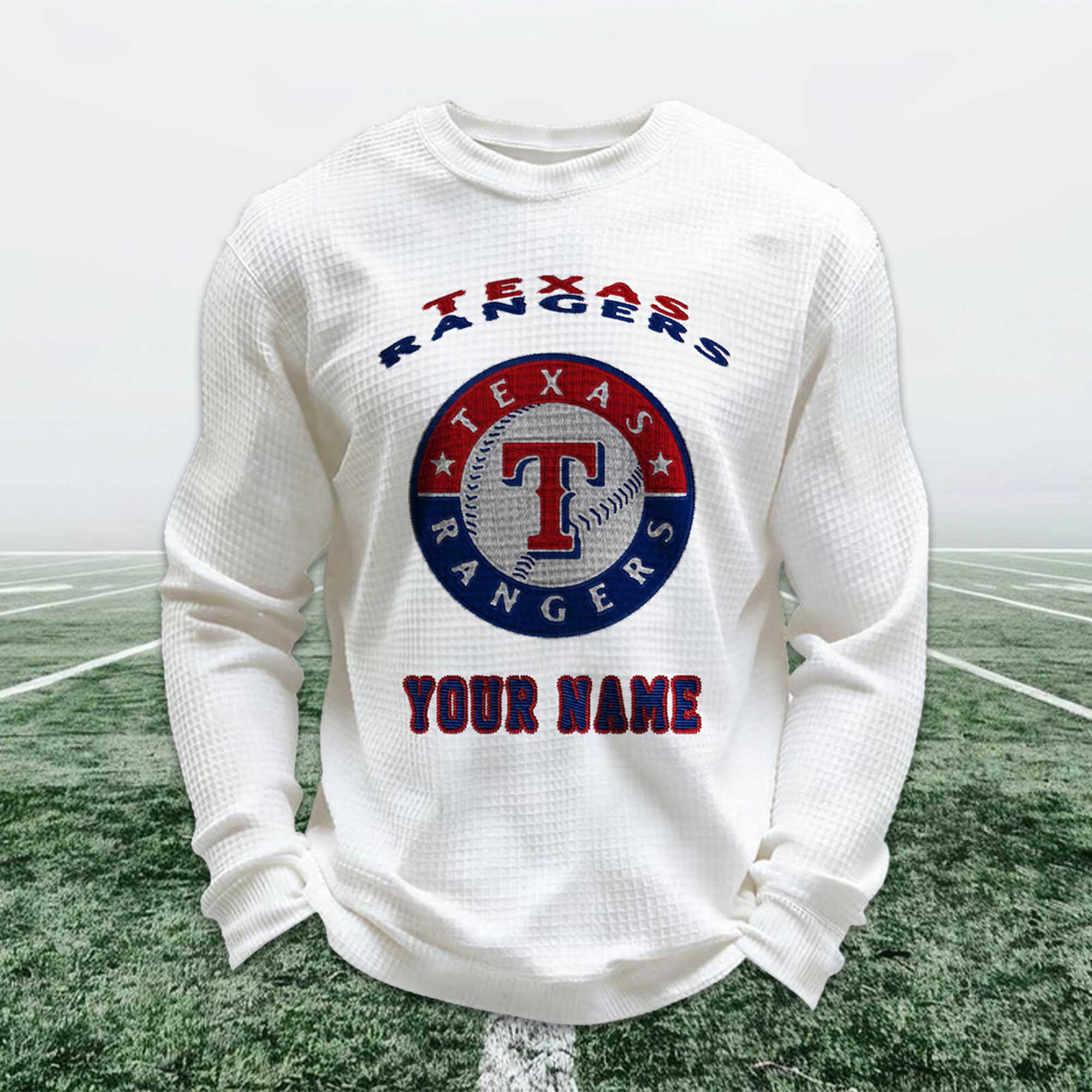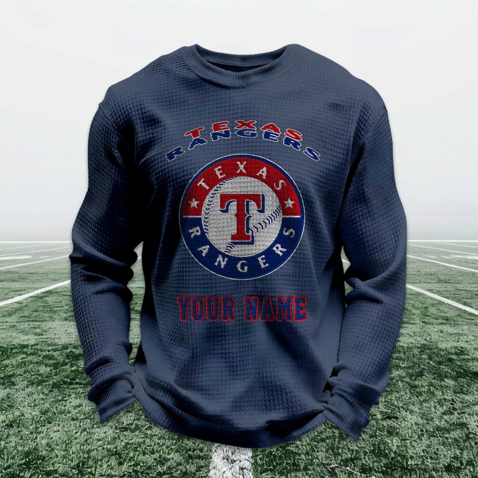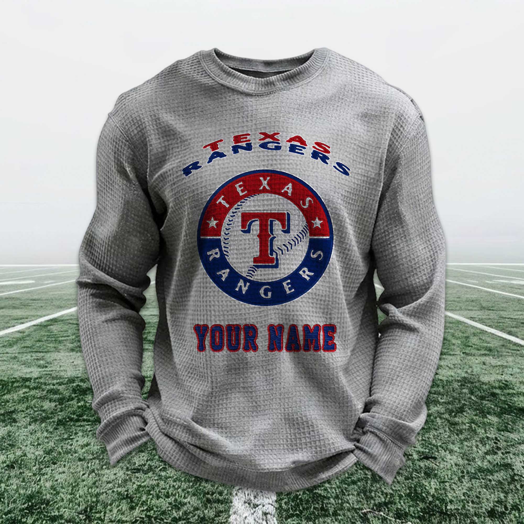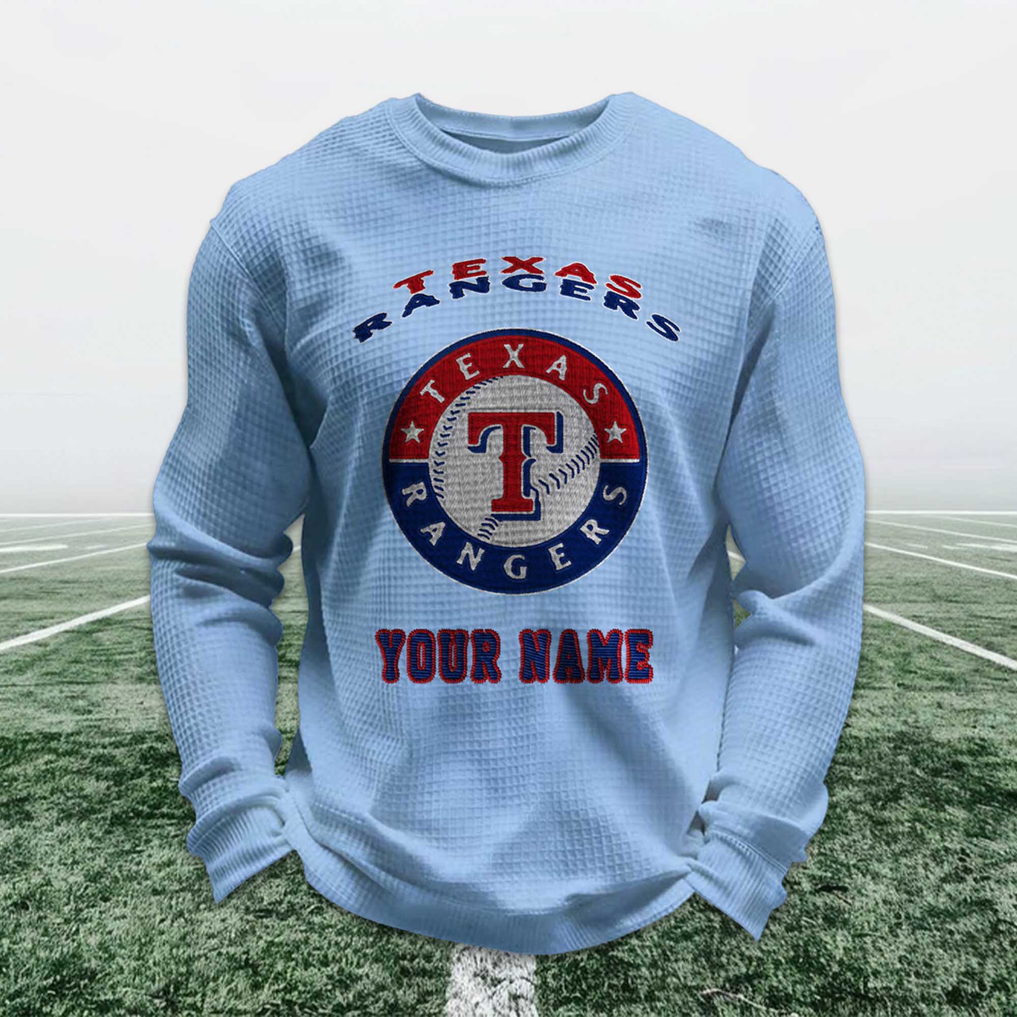 This Personalized Texas Rangers Baseball Waffle Sweatshirt strikes a balance between comfort and visual impact. The soft yet breathable waffle knit fabric is perfect for everyday wear. The prominent Texas Rangers logo in the center, combined with your custom name below, creates a clean and confident design suitable for casual outings, game day, or relaxing weekends.