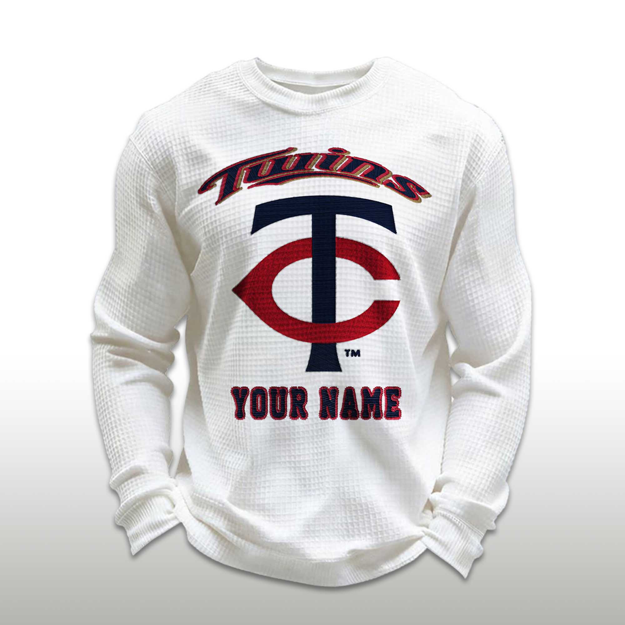 This sweatshirt is designed for maximum comfort with a strong baseball influence. The waffle knit fabric supports airflow, keeping you comfortable all day long. The white background highlights the striking Twins-inspired graphic, while the personalized name adds personality and uniqueness. Easy to wear alone or layer, this shirt is perfect for everyday wear, social activities, or quiet moments at home.