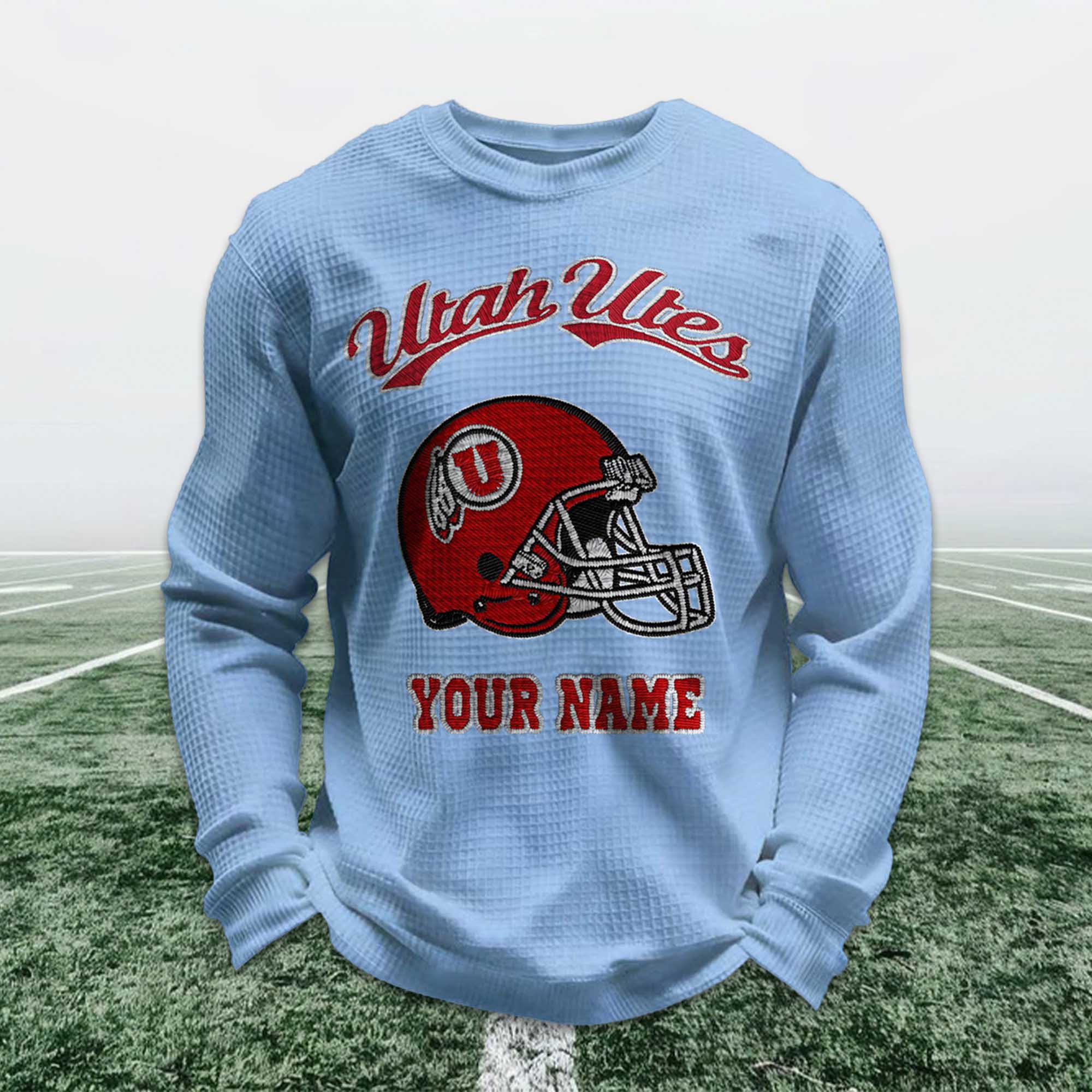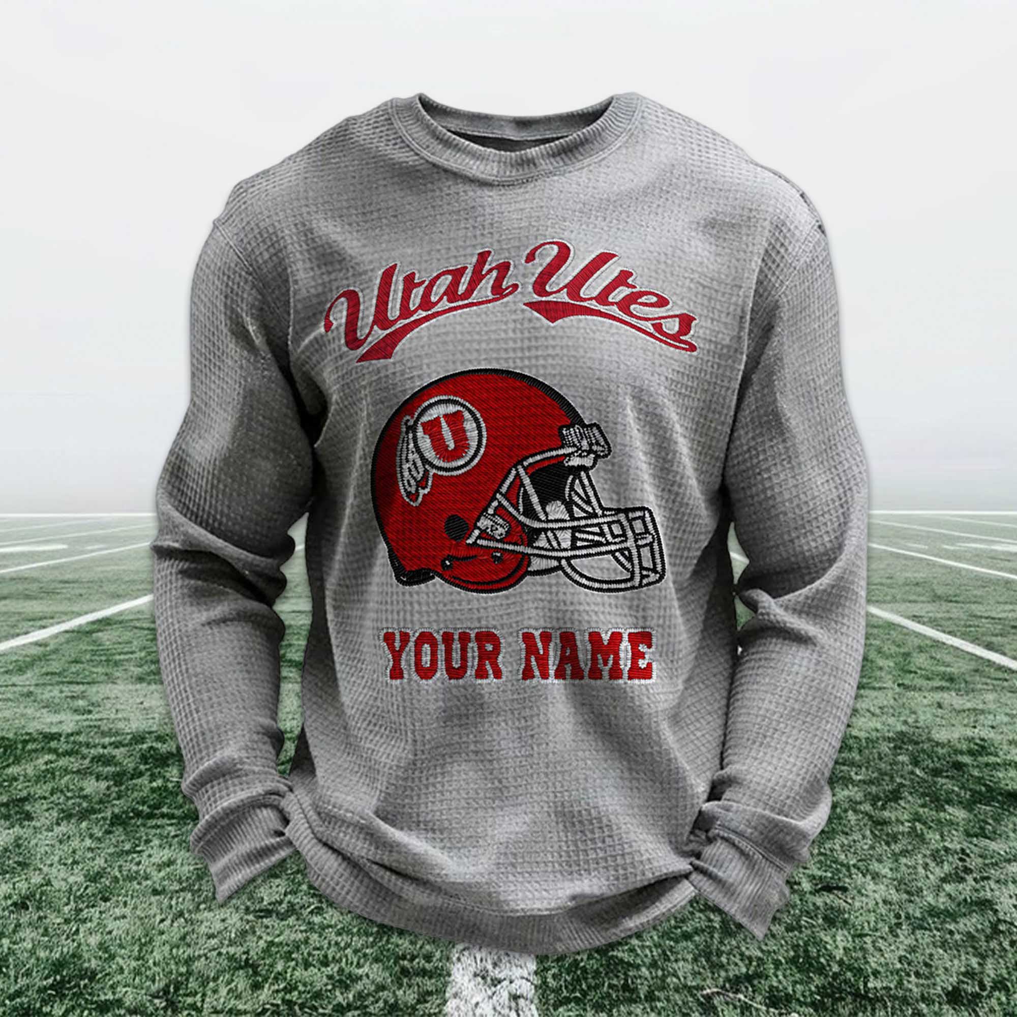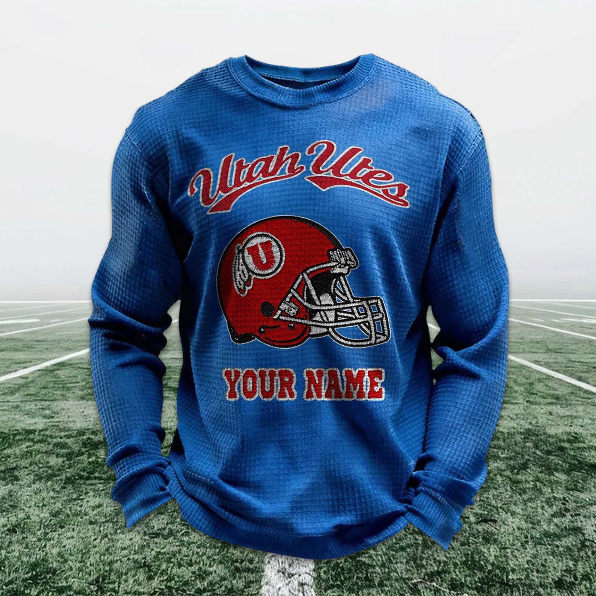 The Personalized Utah Utes Football Waffle Sweatshirt showcases the current trend in fan apparel, blending tradition and personal identity. Based on the provided image, the design features the iconic Utah Utes helmet, a striking red accent, and a custom name below the image. This sweatshirt is perfectly suited to modern fan culture, where comfort, meaning, and individuality are just as important as team loyalty.
