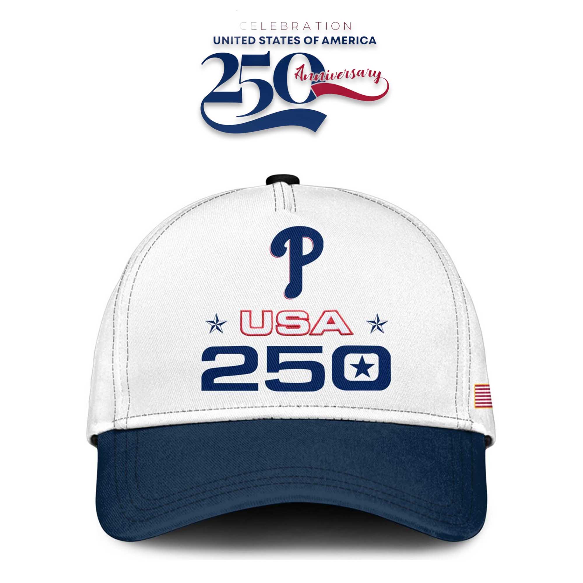 The Phillies America 250th Anniversary 2026 Baseball Jersey features the classic Phillies logo on the front with a clean navy blue trim, emphasizing a traditional baseball look. On the back, the prominent “USA 250” lettering, combined with the Philadelphia branding, commemorates this historic milestone. The patriotic accents are carefully balanced to keep the design sophisticated, making the jersey suitable for game days, events, or everyday wear.