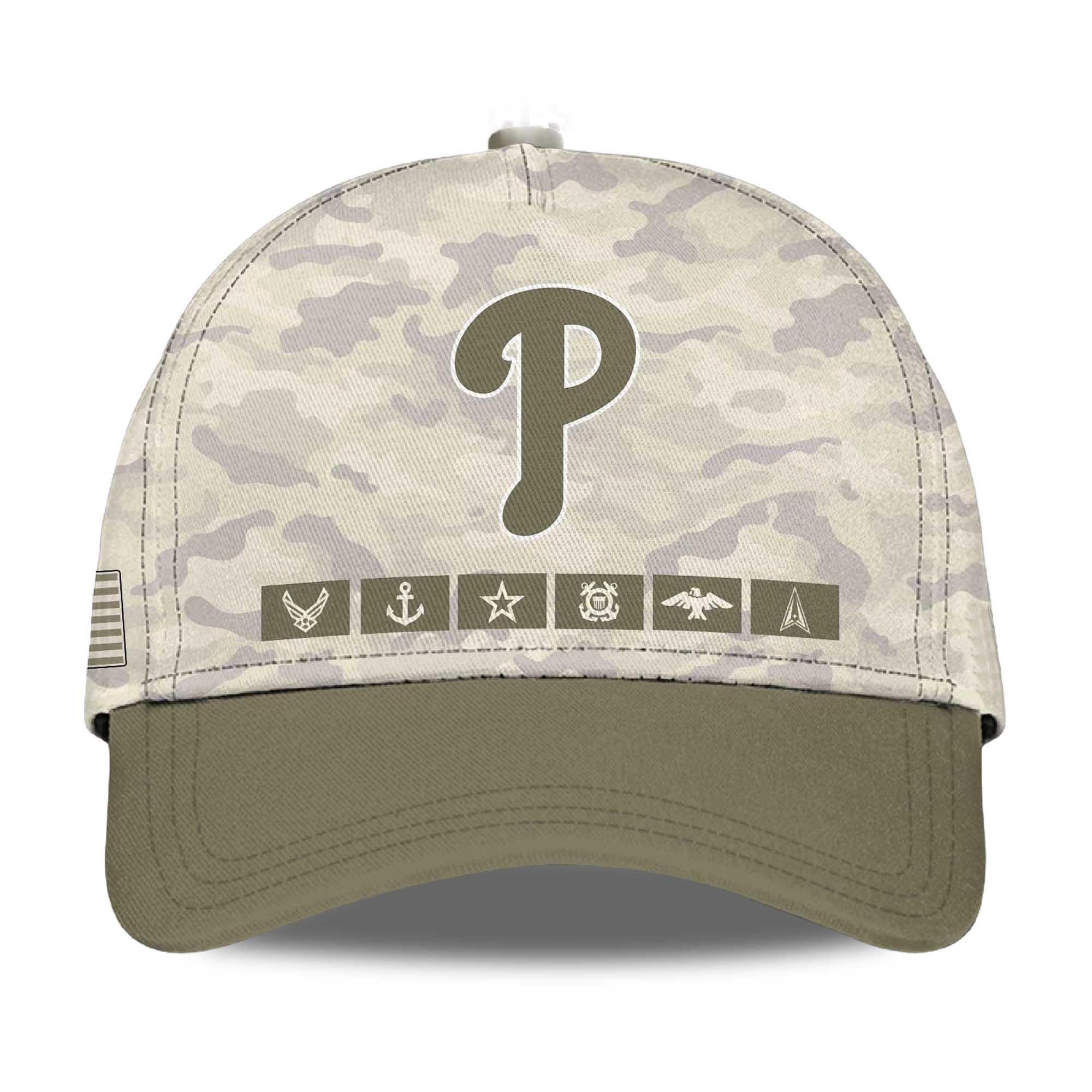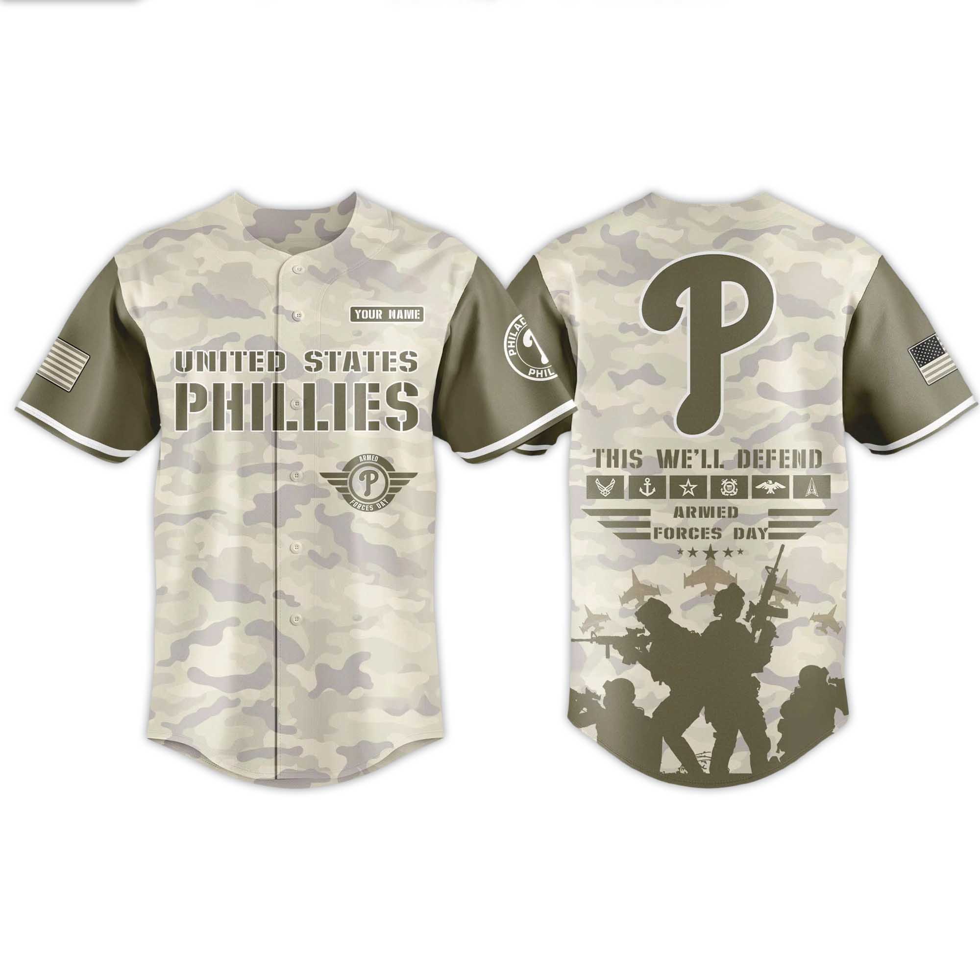 The jersey features a desert camouflage body combined with olive-colored sleeves for a military-inspired look. The bold United States Phillies lettering on the chest adds a strong visual impact. A flag patch on the sleeve adds a patriotic touch and balances the overall design. On the back, a large P logo stands out above the This We’ll Defend lettering, followed by a silhouette that honors military personnel. The combination of neutral tones and sharp graphics creates a powerful, formal jersey ready for game day.