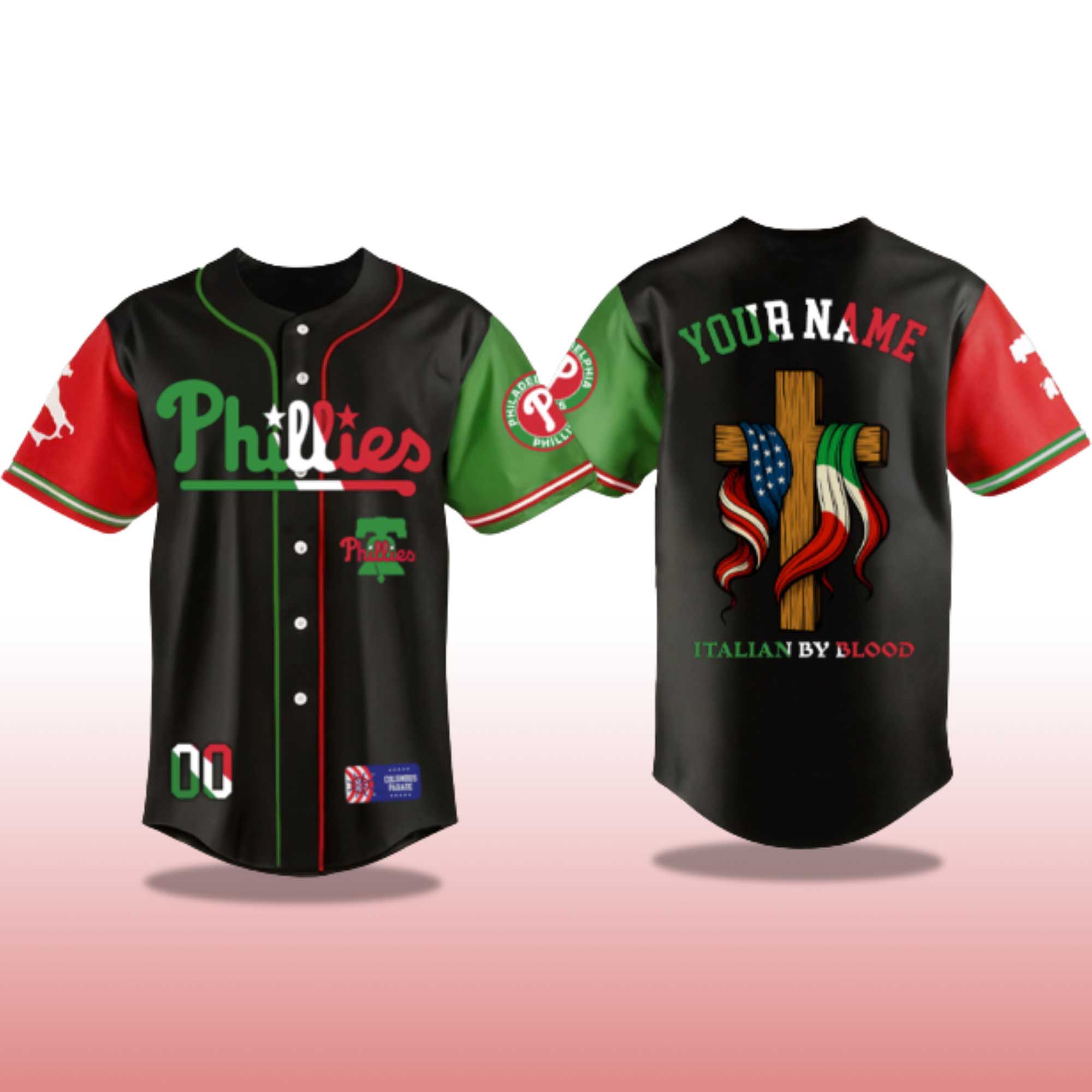 This jersey features a sleek black base with red, white, and green accents, reflecting the colors of the Italian flag. The front of the jersey features a green and red Phillies logo, combined with a team patch for a unique look. The back of the jersey features a prominent cross pattern overlaid with the Italian and American flags, along with the words “Italian by Blood” for a personal and cultural touch. Customization options allow fans to add their own name, creating a truly unique look.
