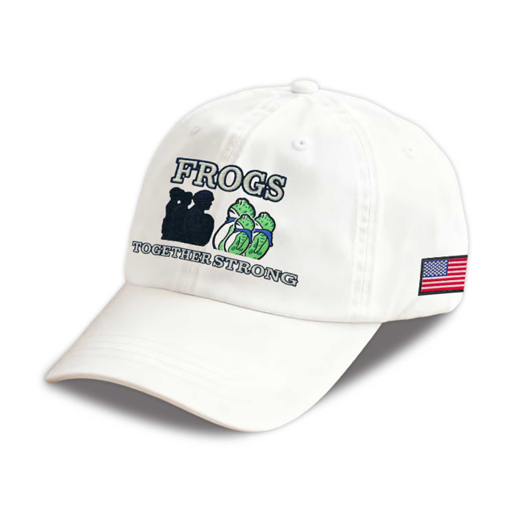 This cap features subtle embroidery on the front with the word “FROGS” above a group of frogs symbolizing the strength of unity. Below, the slogan “TOGETHER STRONG” adds depth and meaning to the design. The side of the cap proudly displays an American flag patch, emphasizing pride and unity. Made from durable cotton twill, the adjustable strap ensures a comfortable fit for all head sizes. The curved brim provides sun protection, making it ideal for baseball games, outdoor activities, or casual wear around town. Every stitch adds personality and authenticity to this iconic piece.