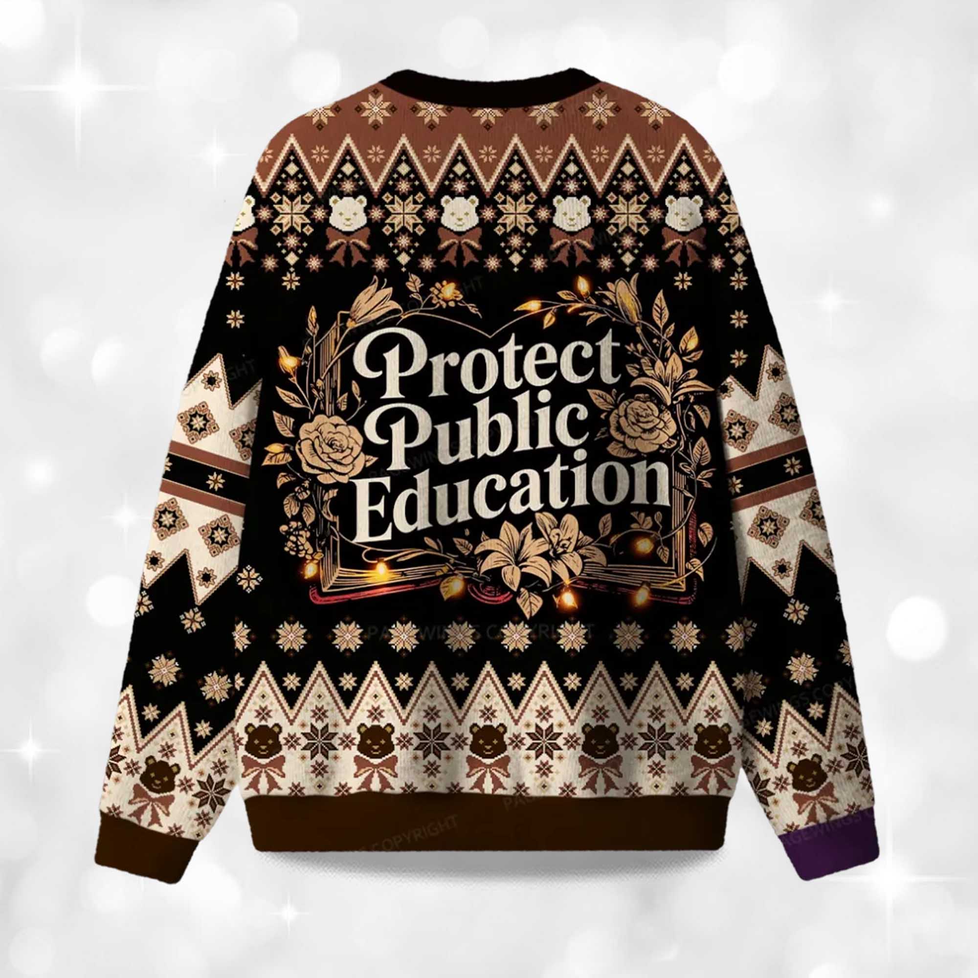 The sweater stands out with its sophisticated design and meaningful details. The front proudly displays the bold slogan “Protect Public Education,” surrounded by intricate floral and geometric patterns, combining a festive atmosphere with an advocacy message. Crafted in rich browns, blacks, and creams, the sweater exudes warmth and sophistication while maintaining a cheerful holiday spirit. The soft, durable knit provides all-day comfort for winter gatherings, while the unisex silhouette makes it perfect for teachers, parents, and education advocates alike. Every stitch represents unity, comfort, and joy turning the classic ugly sweater into a statement of change.