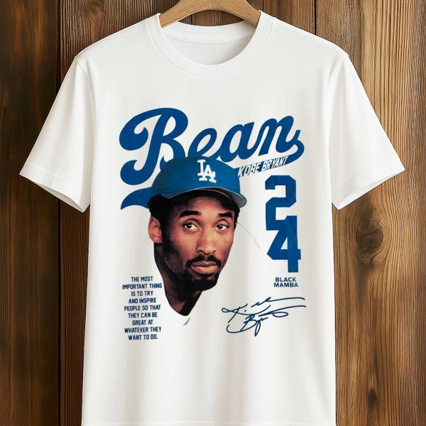 The shirt features Kobe Bryant wearing a Dodgers cap, his eyes filled with determination. Above the image, bold “Bean” text honors his legacy, while the number 24 and “Black Mamba” add layers of meaning for true fans. Below is one of Kobe’s most iconic quotes a reminder that greatness begins with inspiration. The pristine white fabric sets the stage for the Dodgers’ vibrant blue-and-black pattern, creating a striking visual balance. The soft, breathable cotton ensures comfort whether you’re in the gym, on the bleachers, or walking around town.